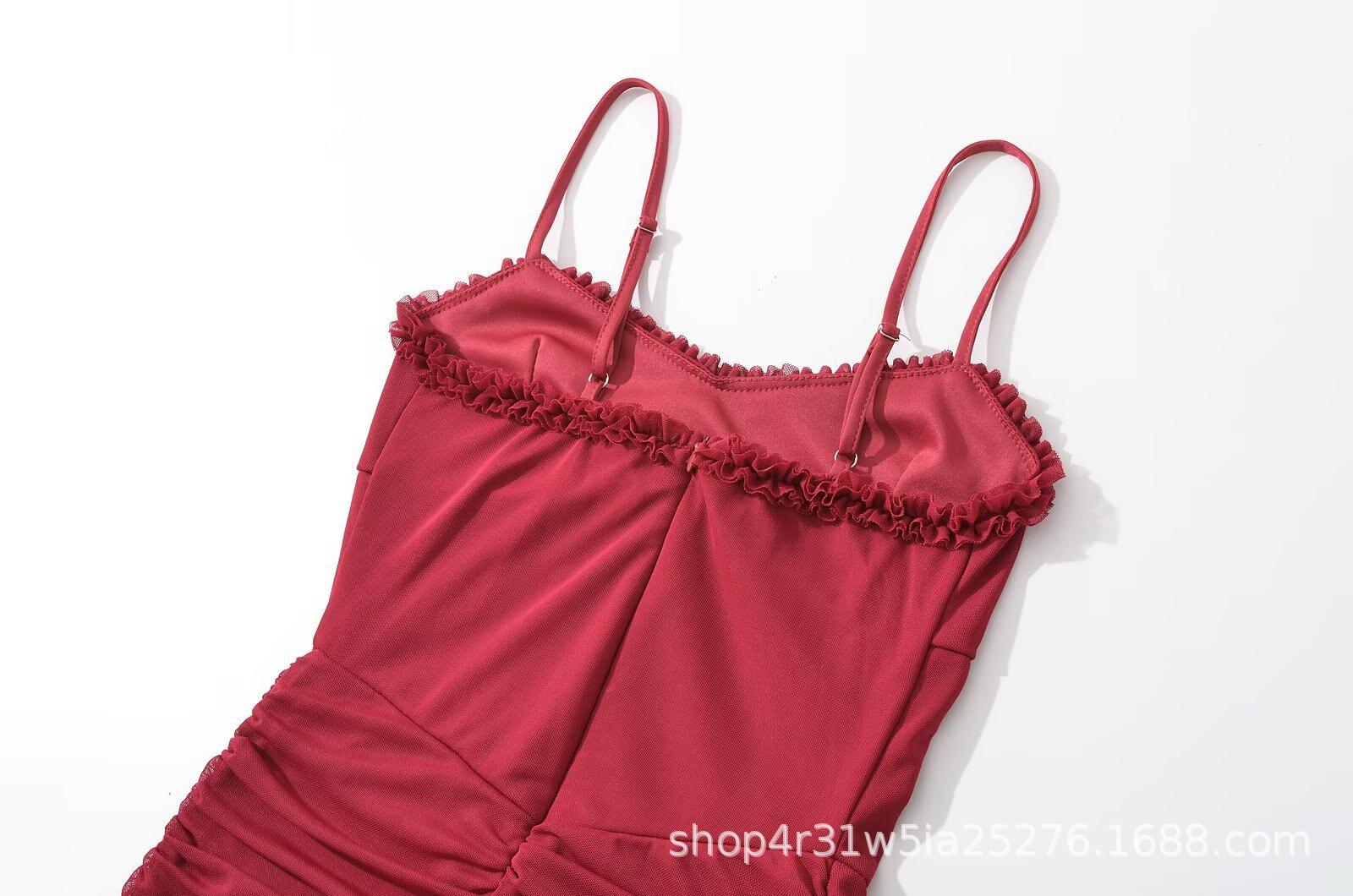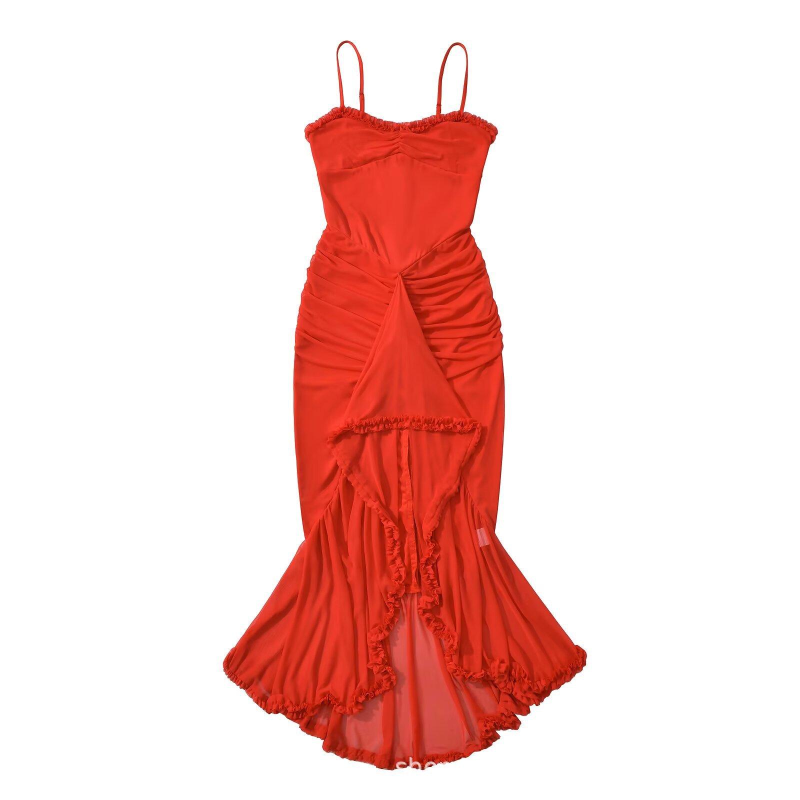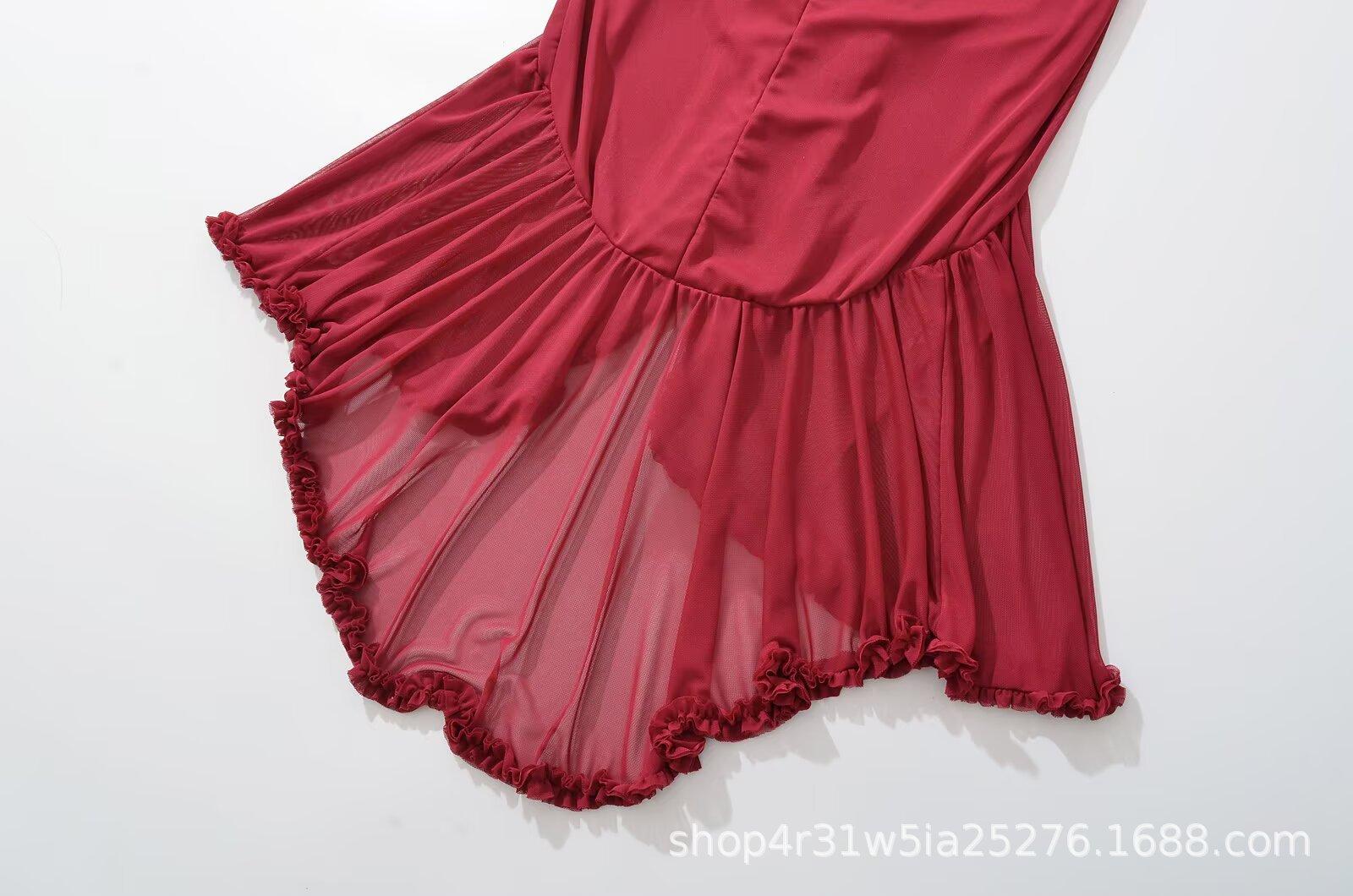 Amazon Aliexpress Exportación Transfronteriza Ropa de Mujer 2025 Verano Malla Tirantes Sexy Espalda Descubierta Cola de Pescado Vuelo Midi