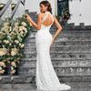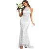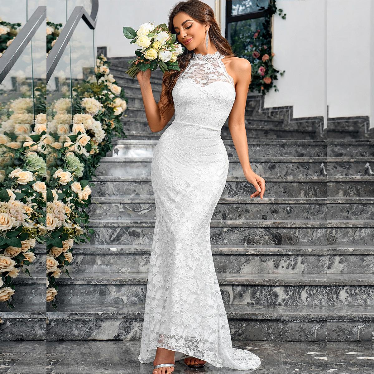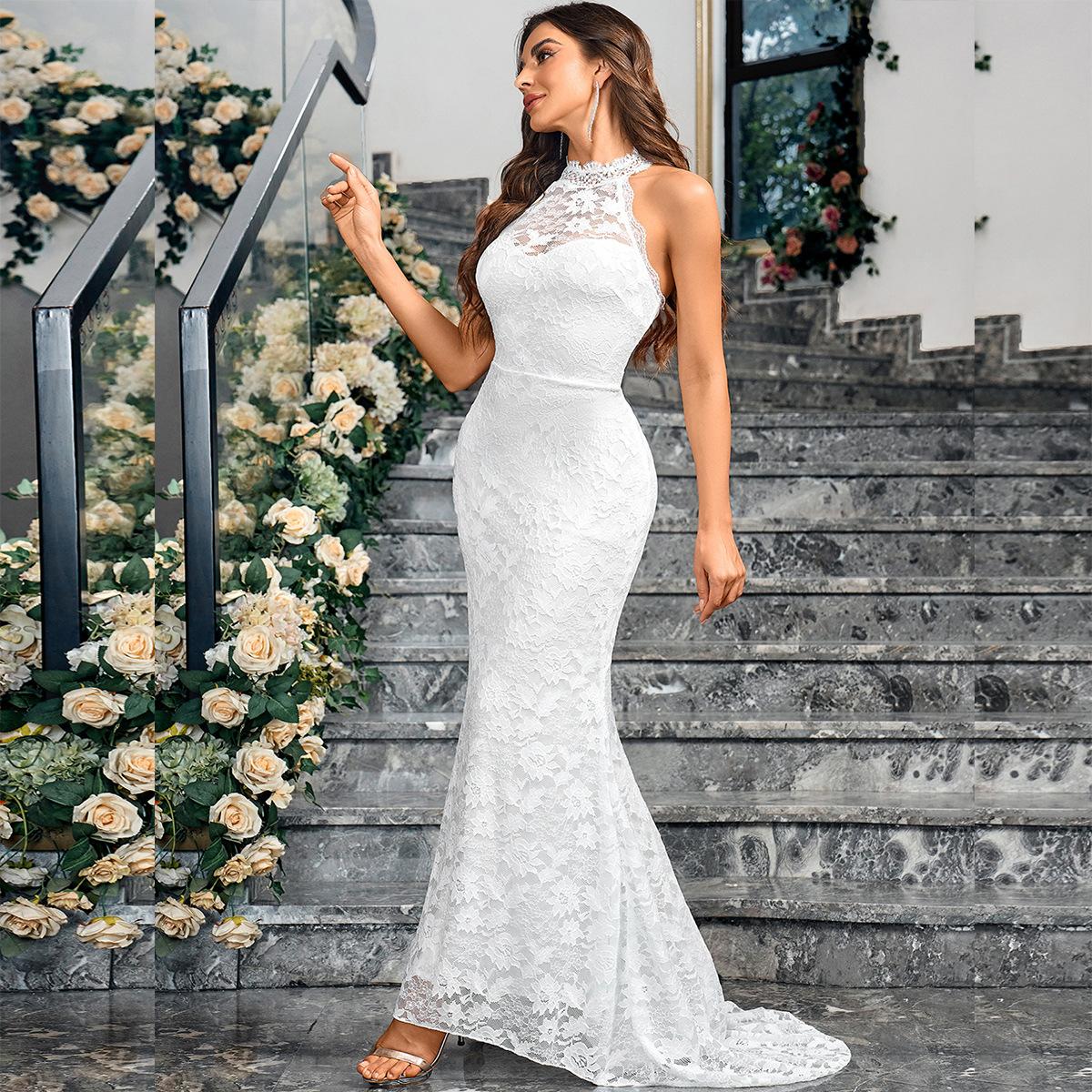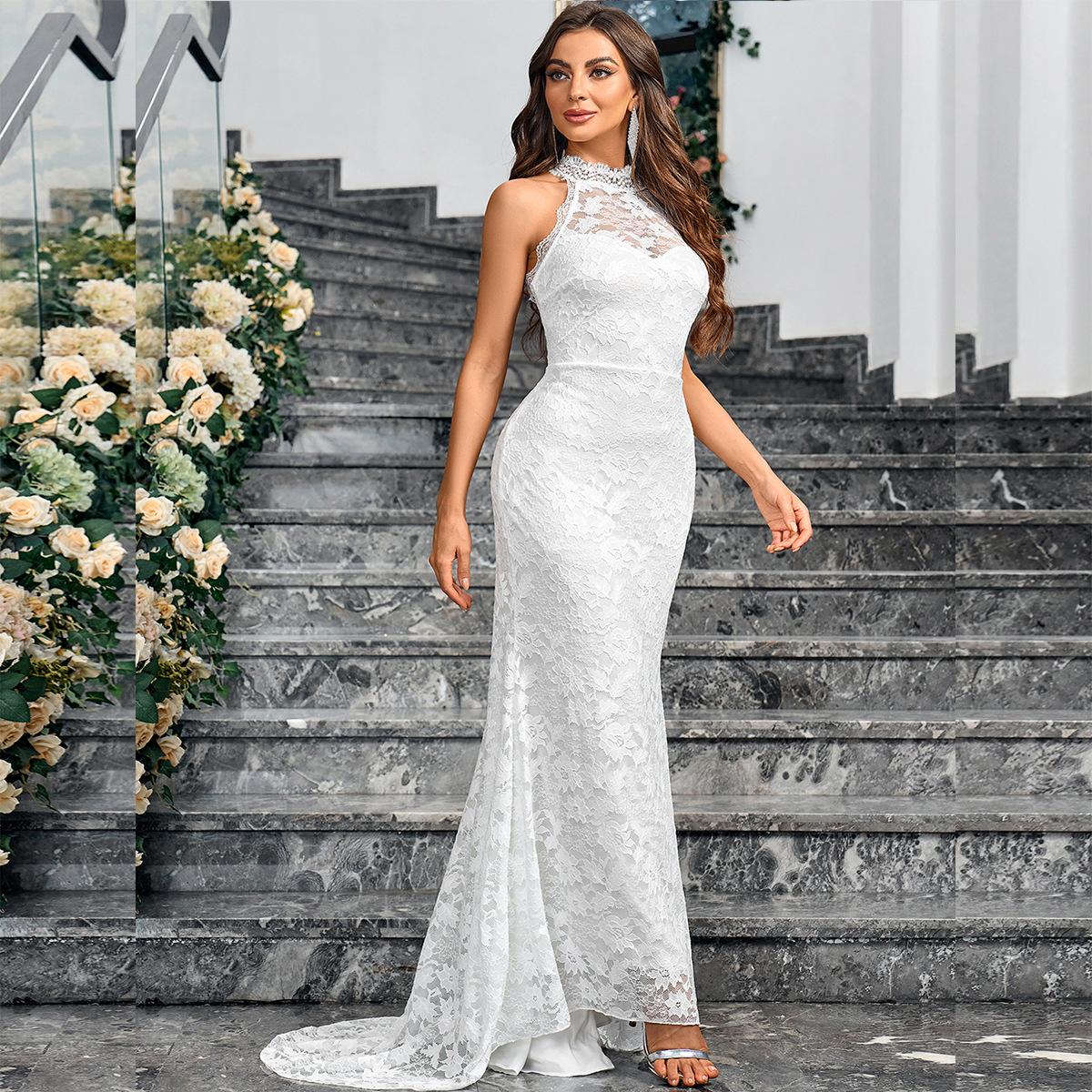 Nuevo Encaje de Color Sólido Elegante Ajustado Europeo y Americano Sin Espalda Sin Mangas con Cola Amazon Banquete Vestido de Noche