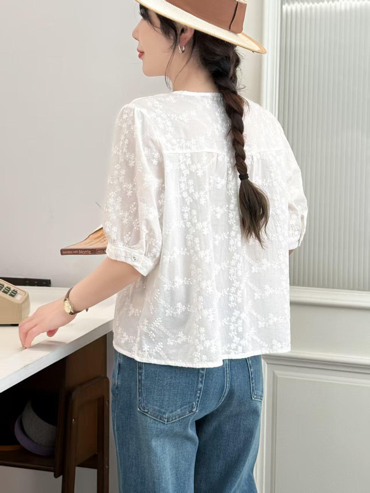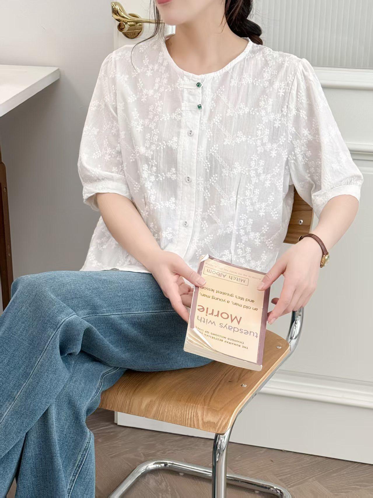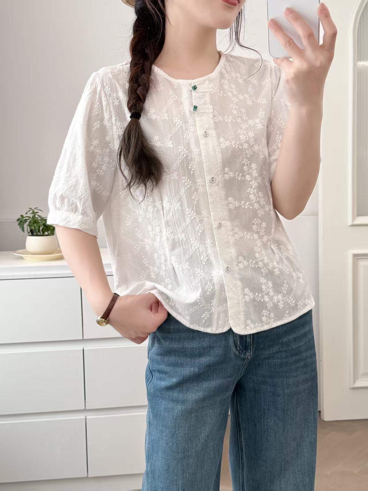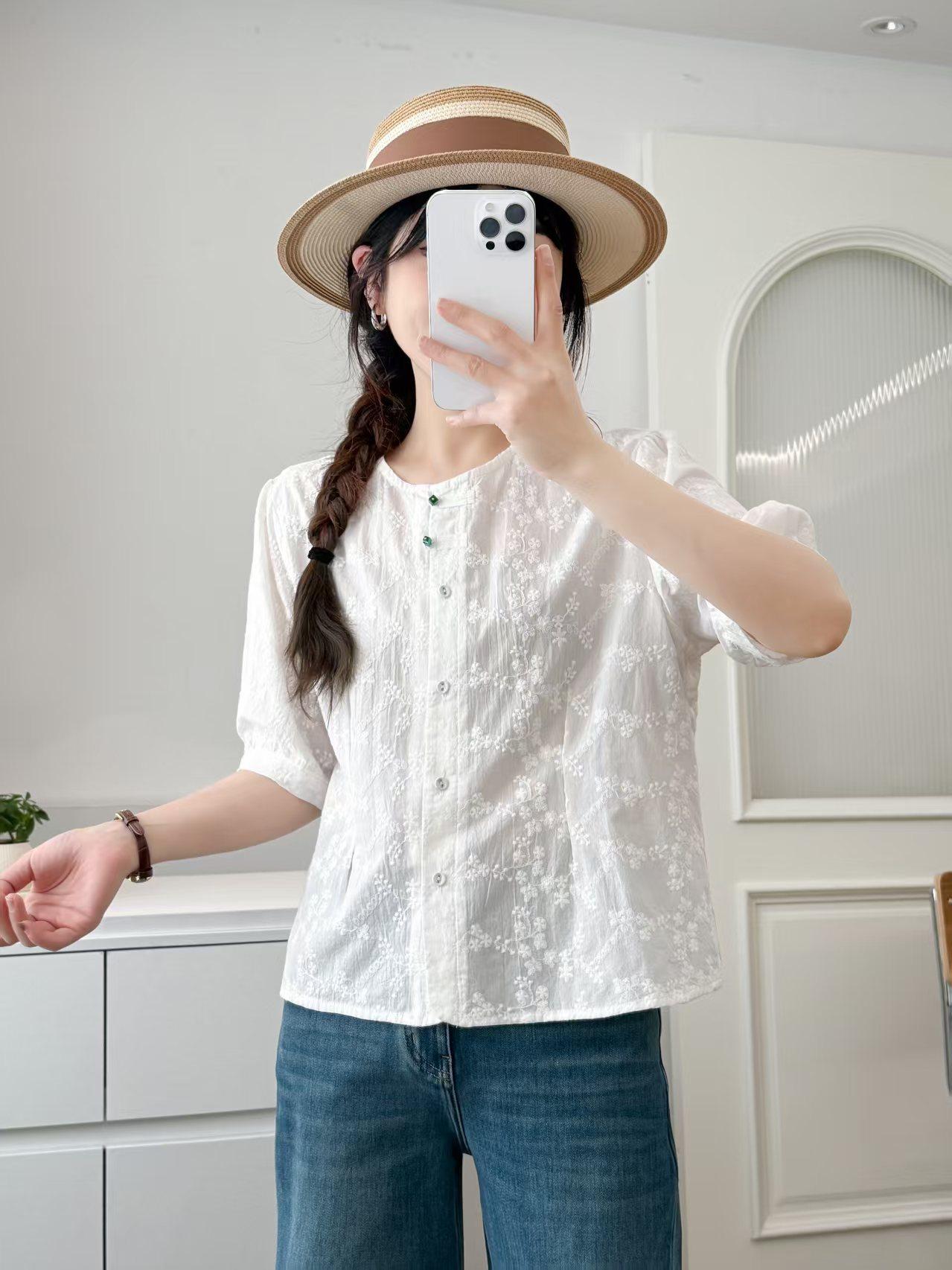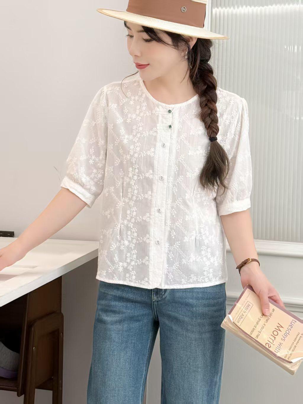 Camisa Bordada Diseño para Mujer Nicho Top de Manga Corta Verano 2025 Nuevo Coreano Cuello Redondo Holgada Ajustada
