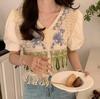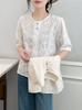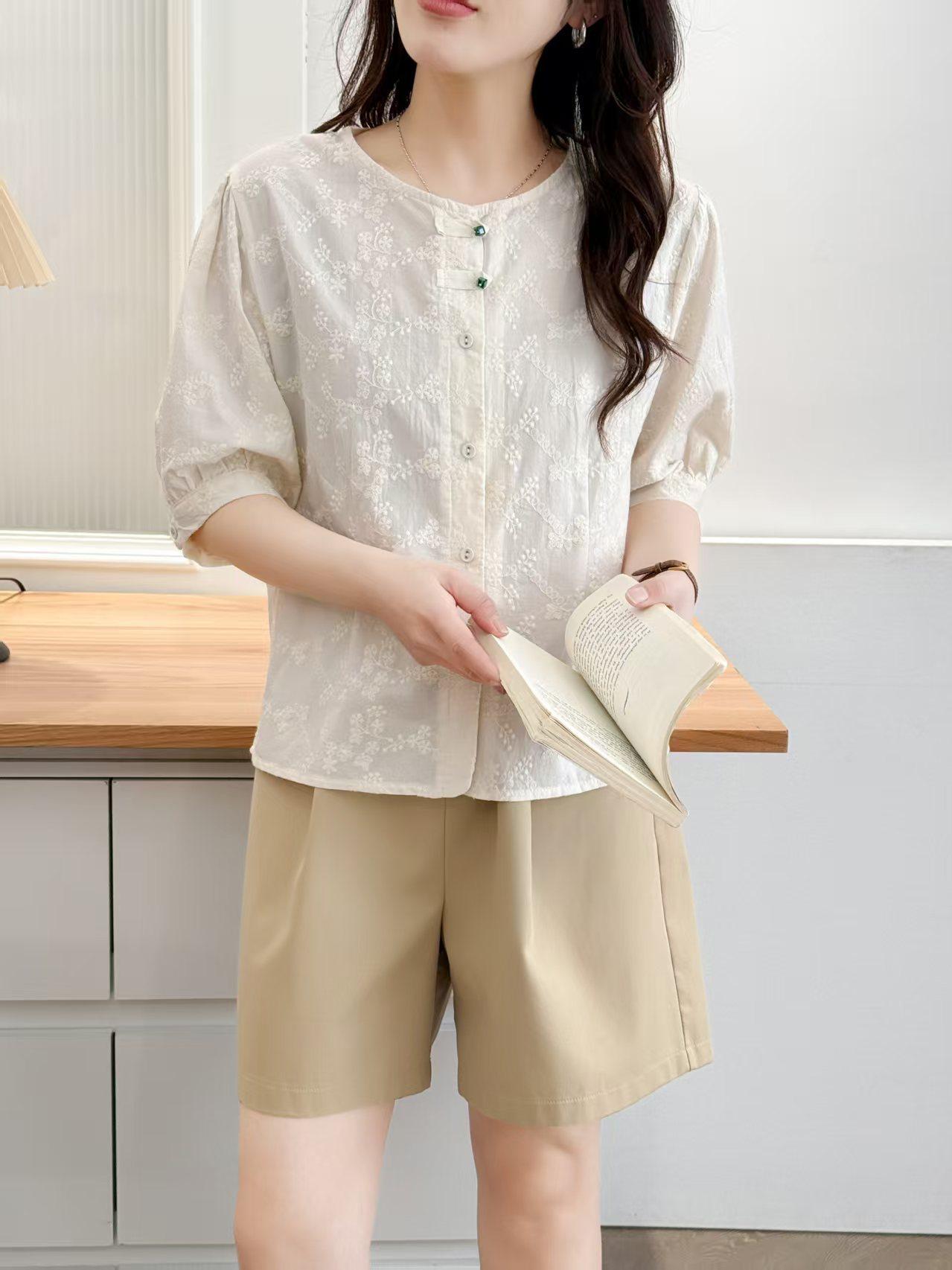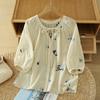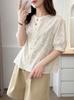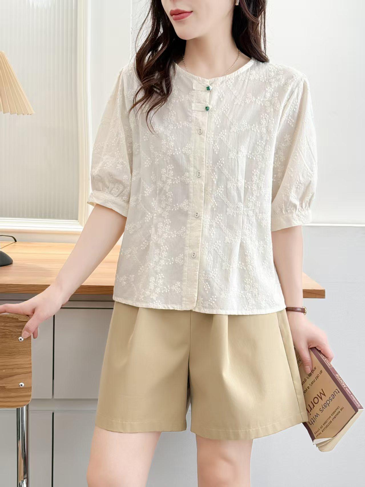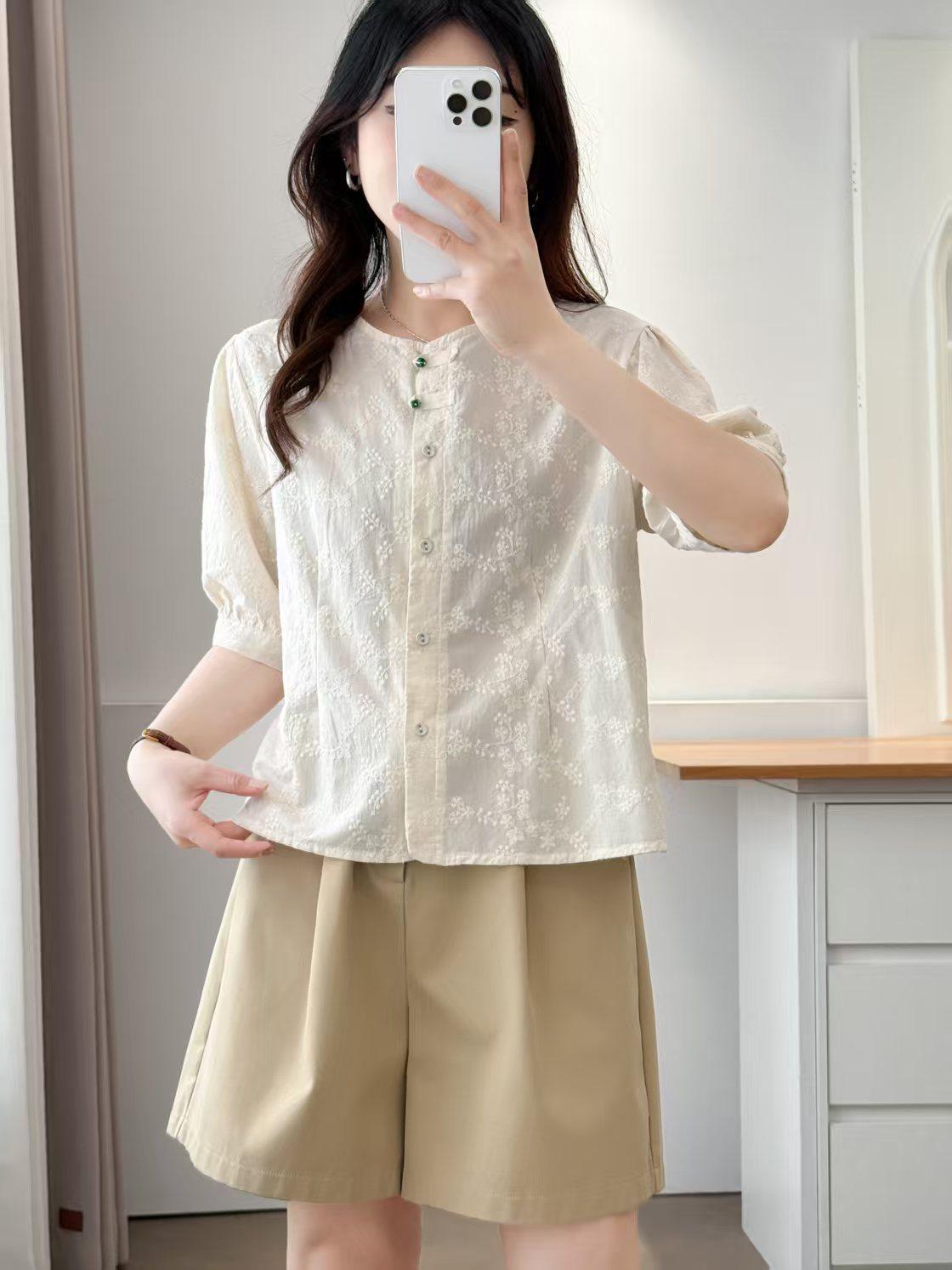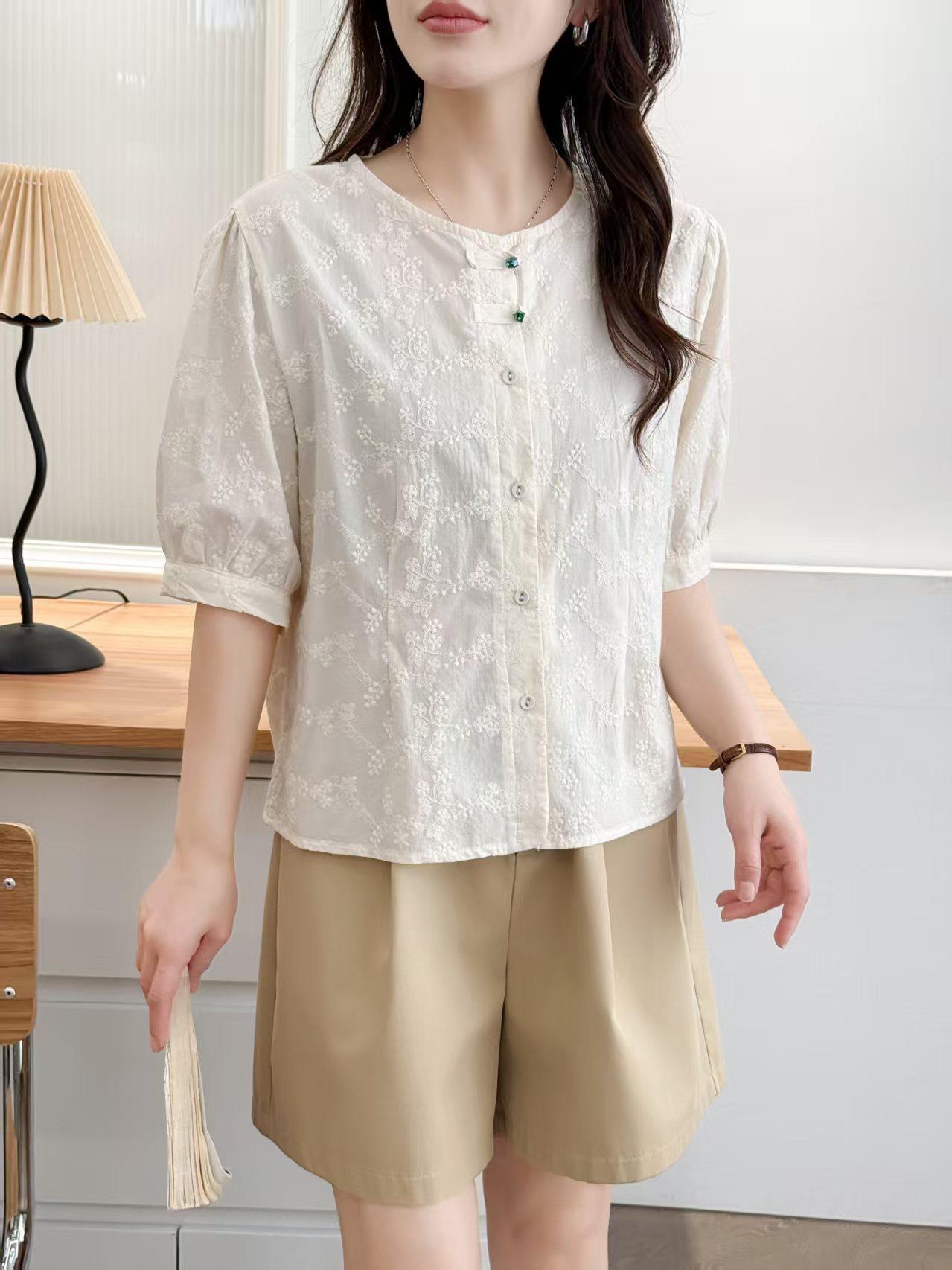 Camisa Bordada Diseño para Mujer Nicho Top de Manga Corta Verano 2025 Nuevo Coreano Cuello Redondo Holgada Ajustada