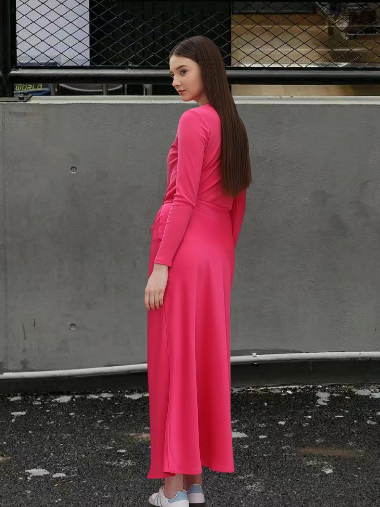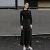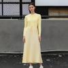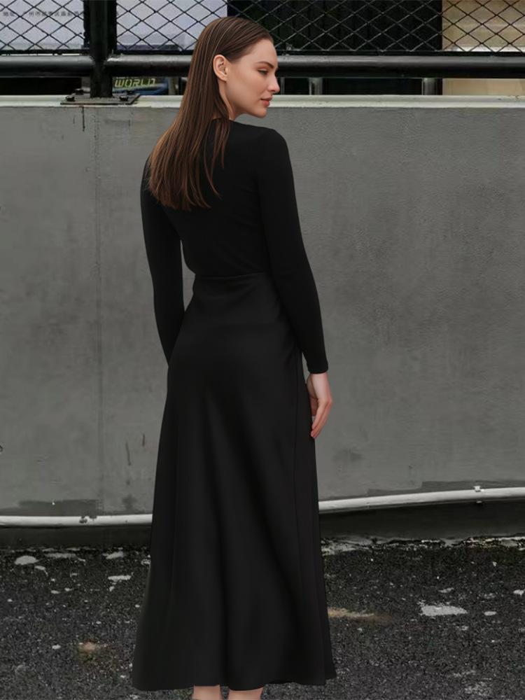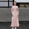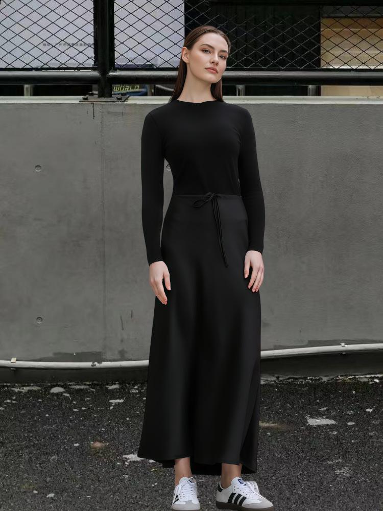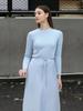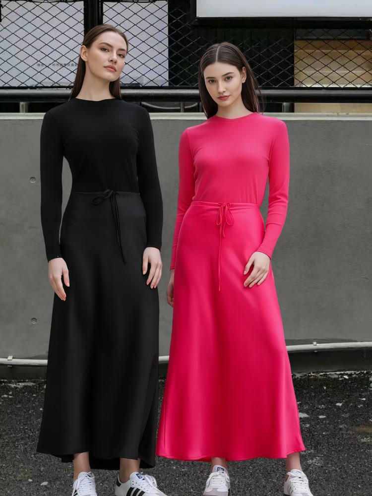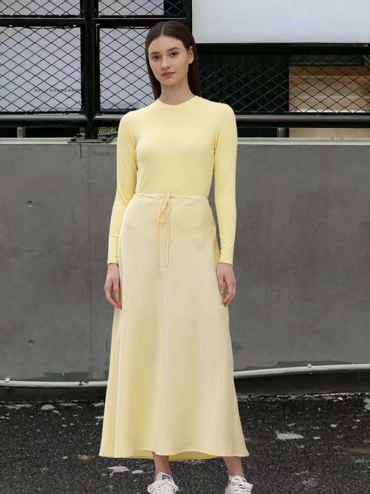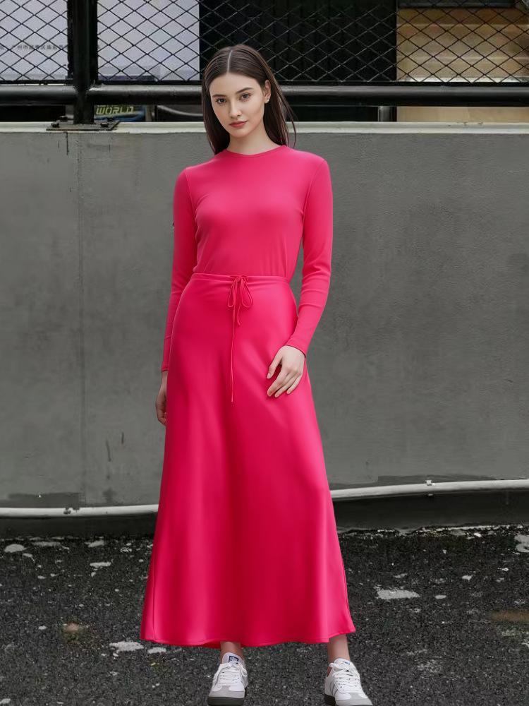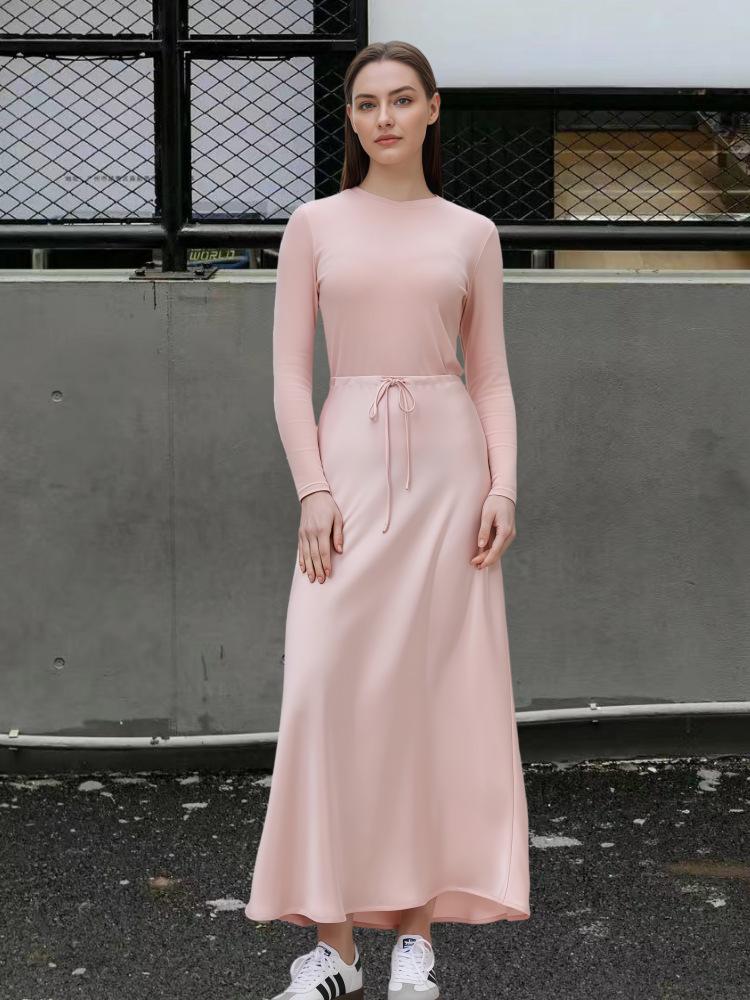 Conjunto de dos piezas de top de punto de manga larga y color puro fresco con falda de lazo en la cintura para mujer 2025 Primavera Nuevo Traje