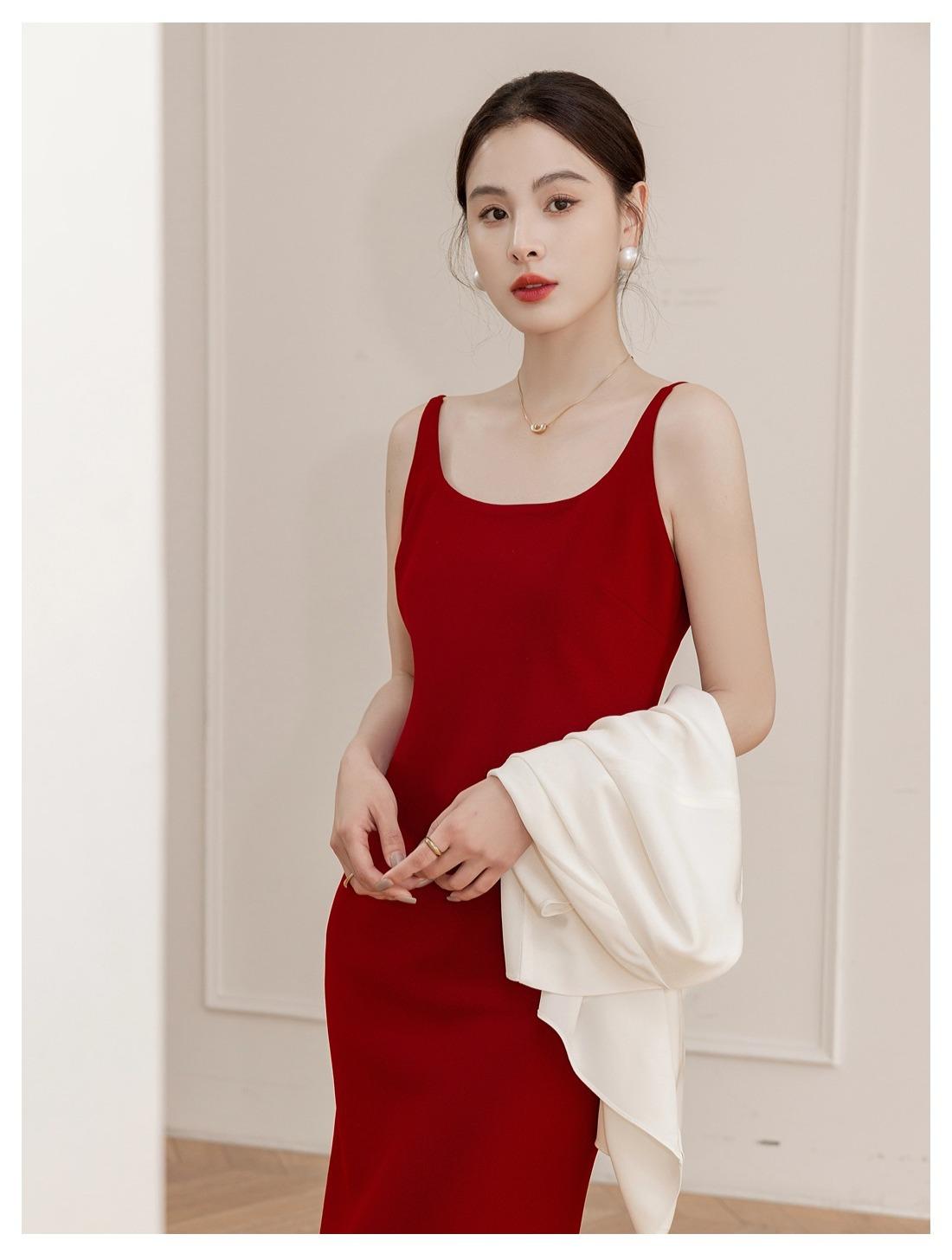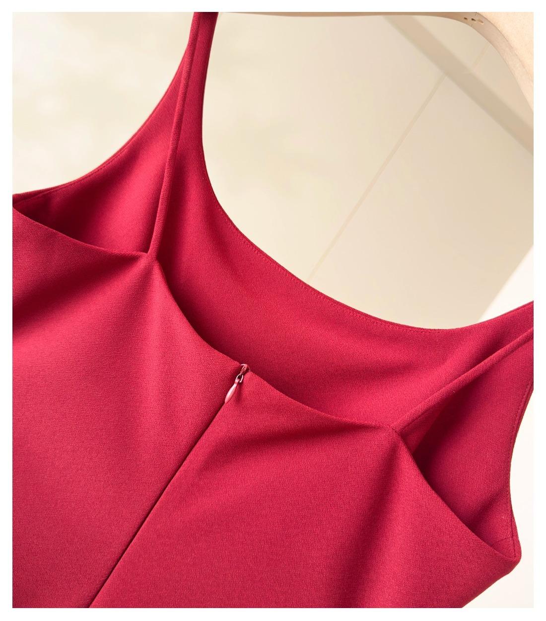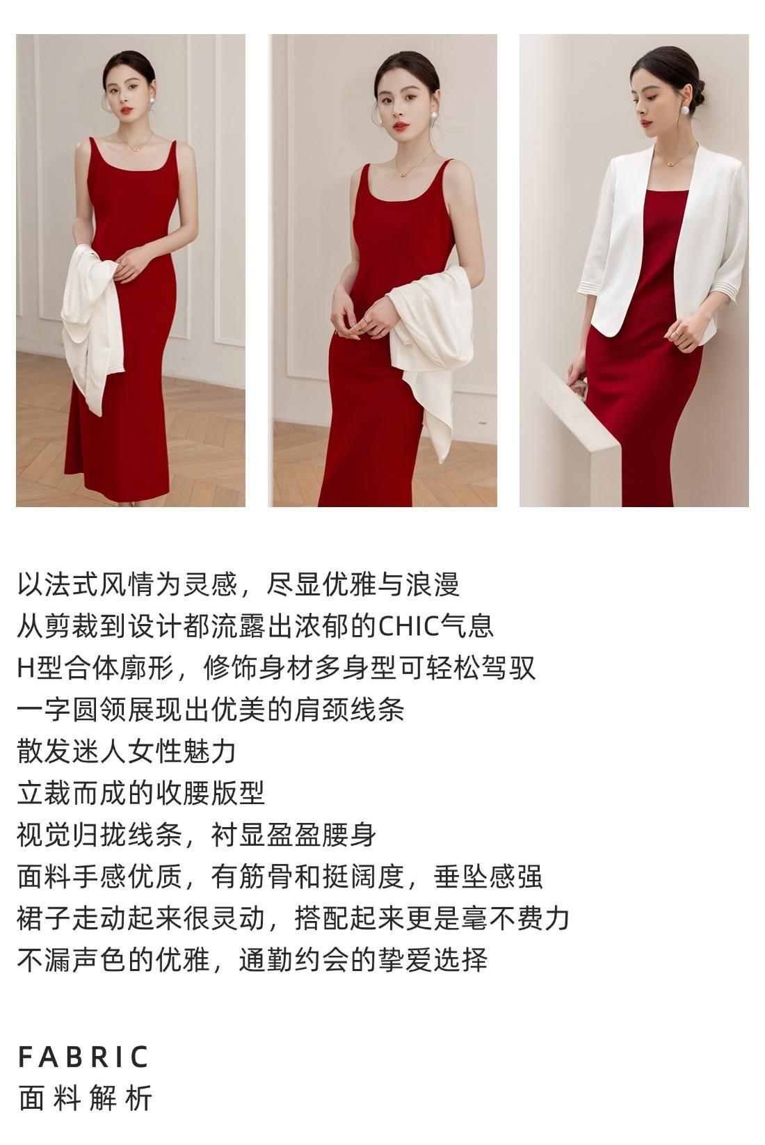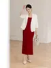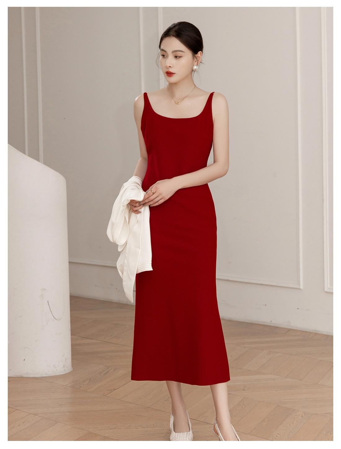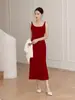 Vestido largo Endy de cuello cuadrado francés, elegante, ajustado, de tirantes, para primavera y verano, elástico, retro, rojo, de cola de pez