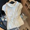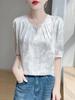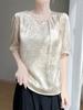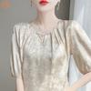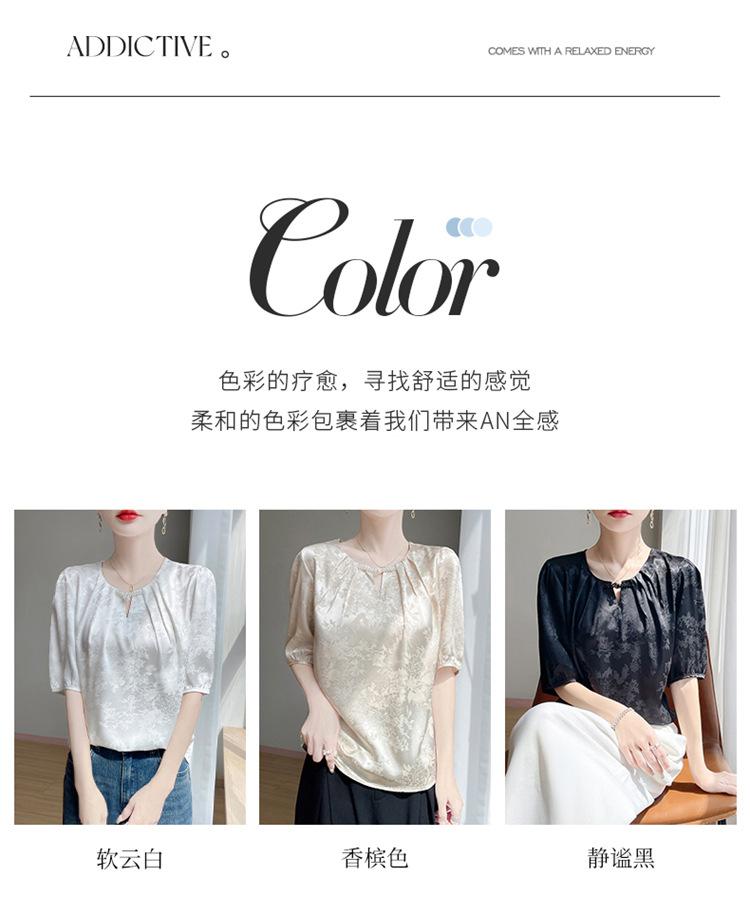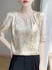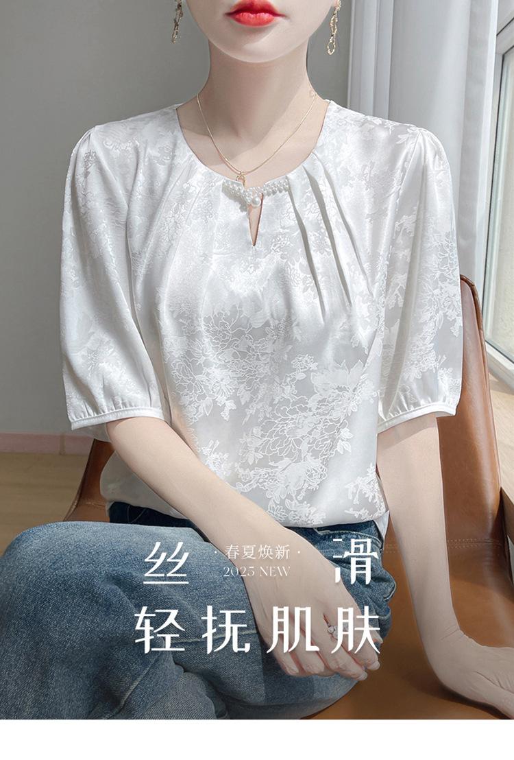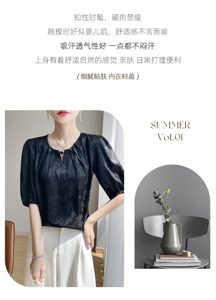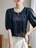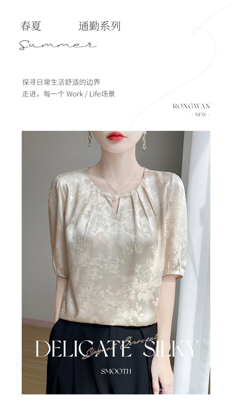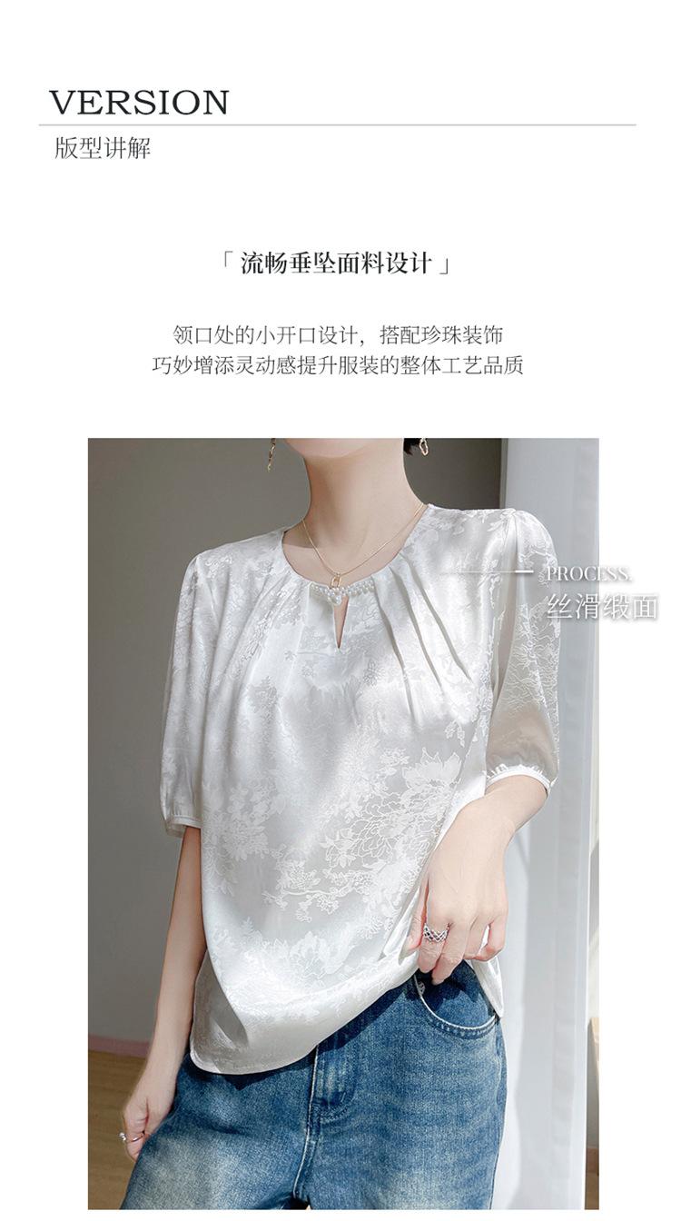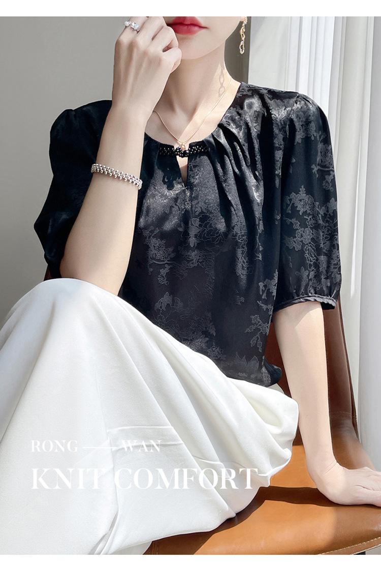 Blusa de Verano para Mujer de Seda con Cuentas Francesas de Manga Corta Nueva con Sentido de Alta Gama Jacquard Satén Cuello Redondo Manga Abullonada