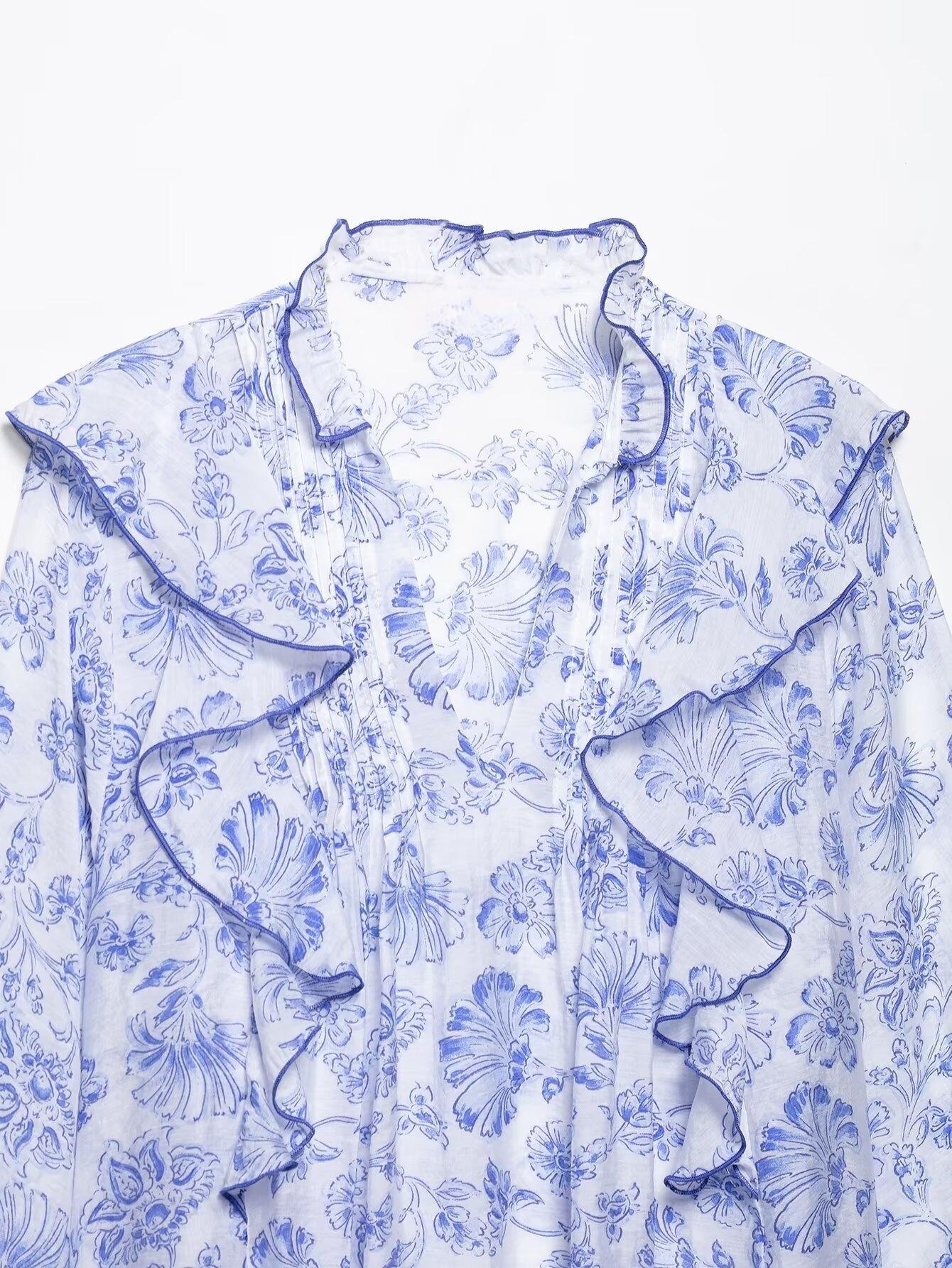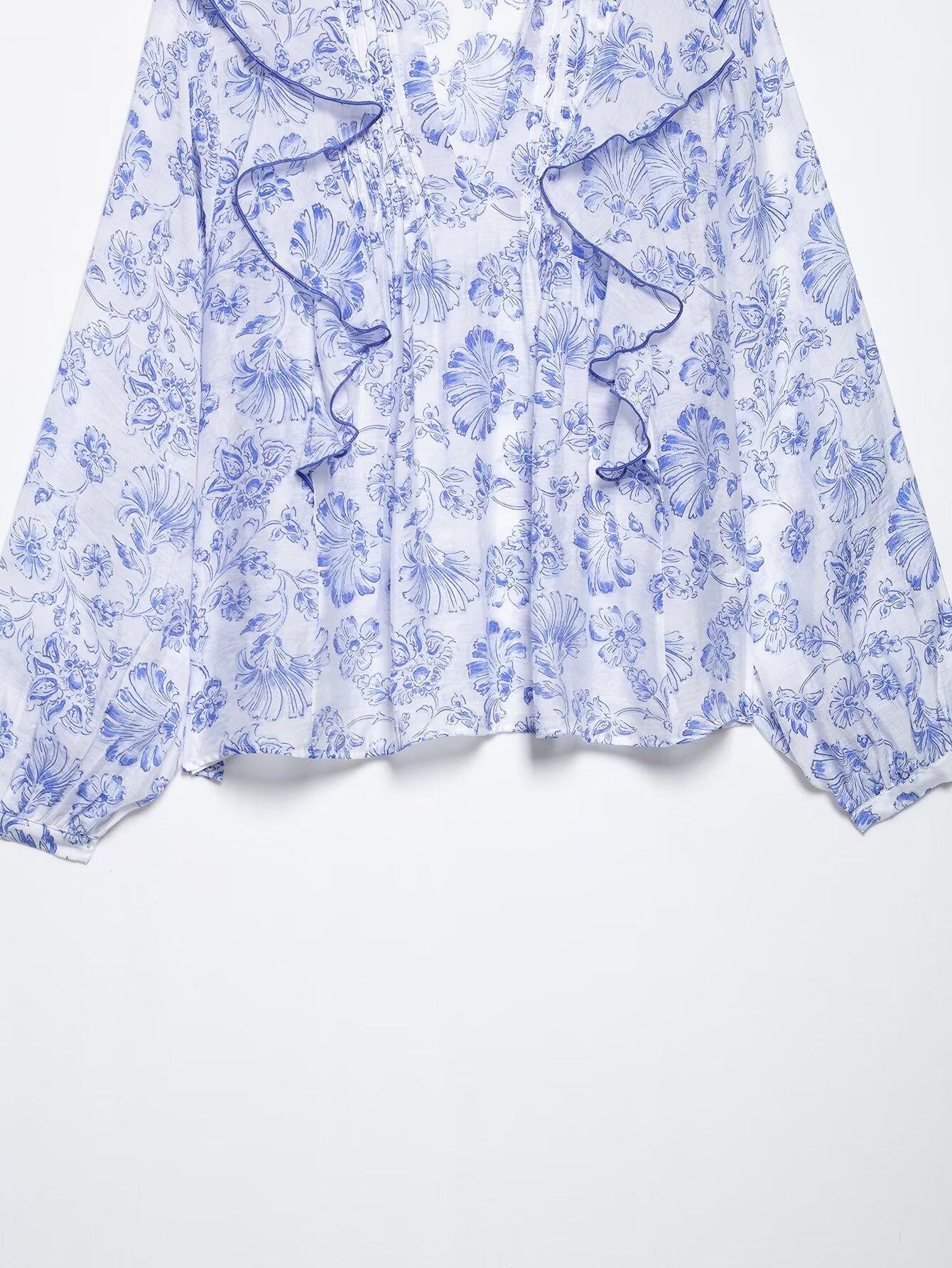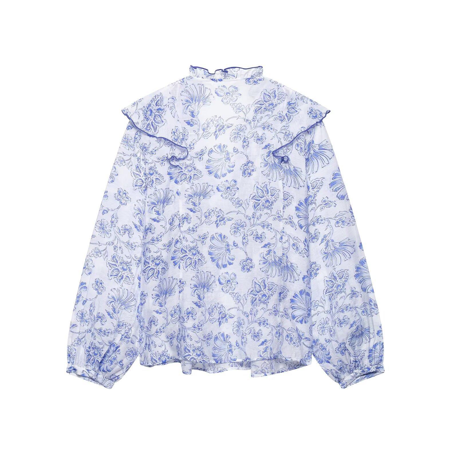 Ropa Europea y Americana Transfronteriza 2025 Primavera Nueva Moda Camisa Decorativa Estampada con Volantes y Capas 5029089