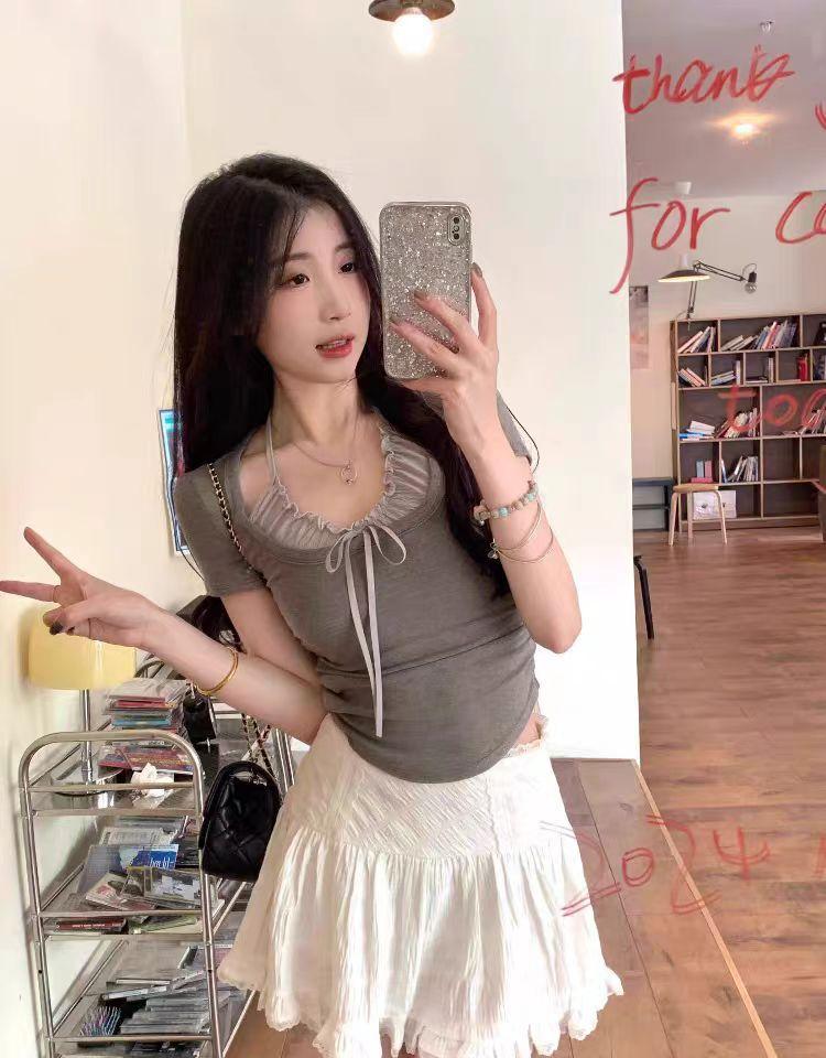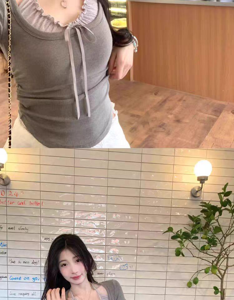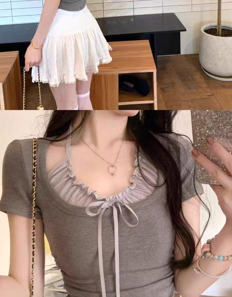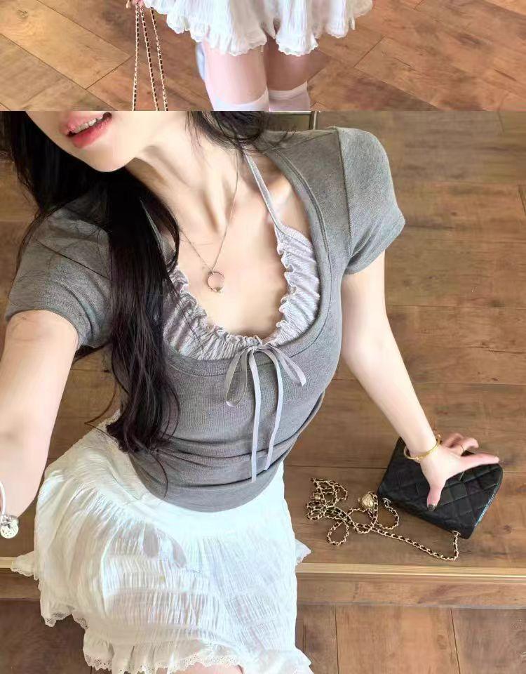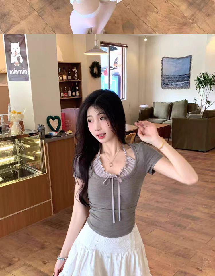 Camiseta Sexy Estilo Francés Deseo Puro Chica Picante Nicho Manga Corta Ropa Interior Nueva Ajustada Cuello Halter Falso Top de Dos Piezas para Verano