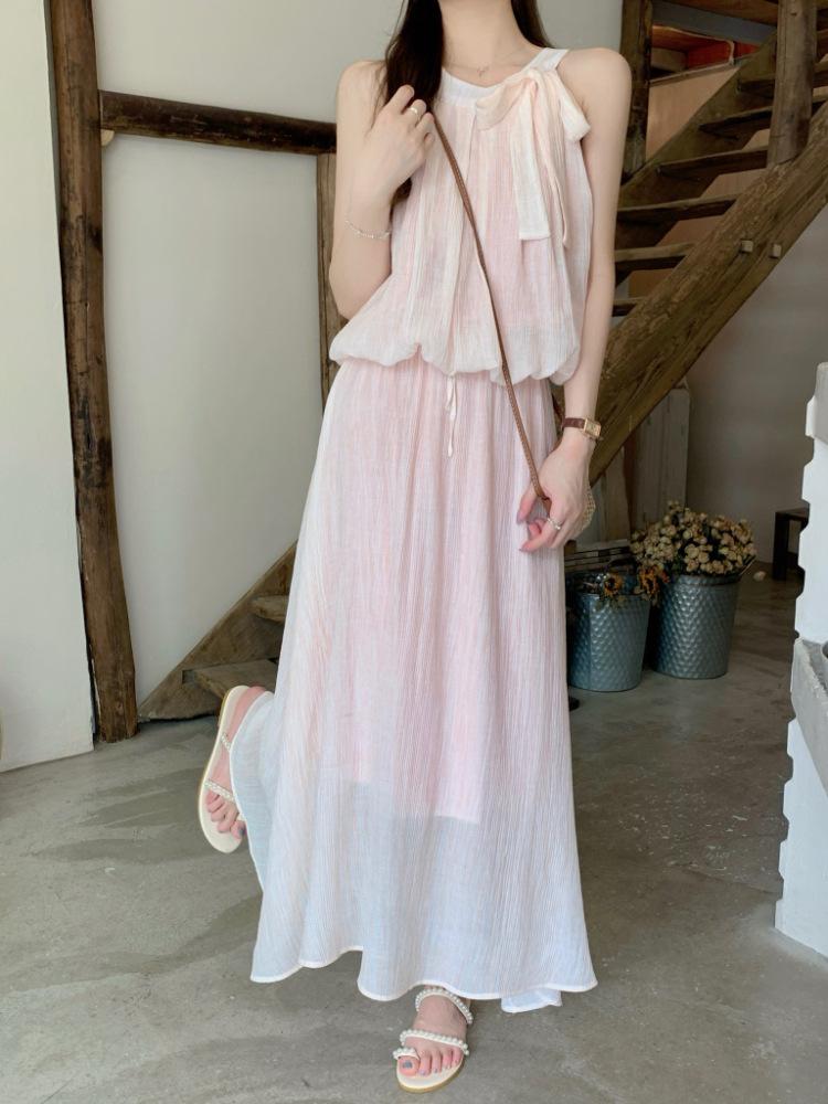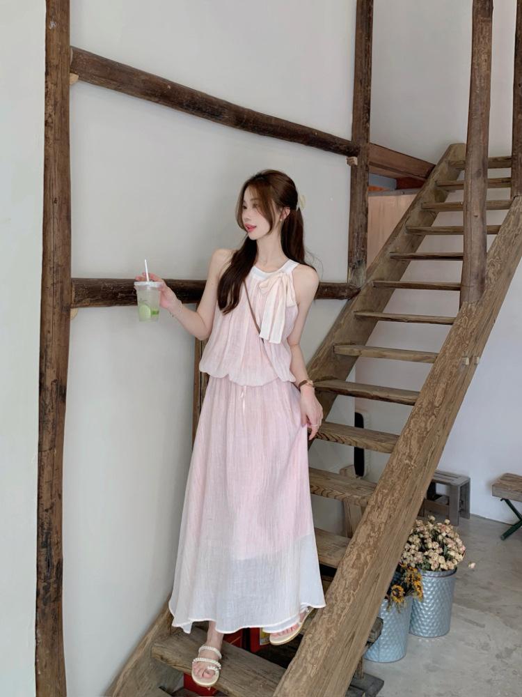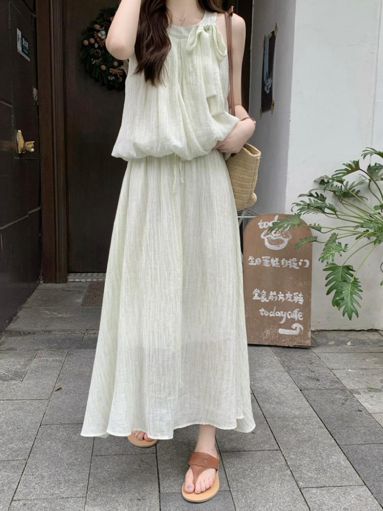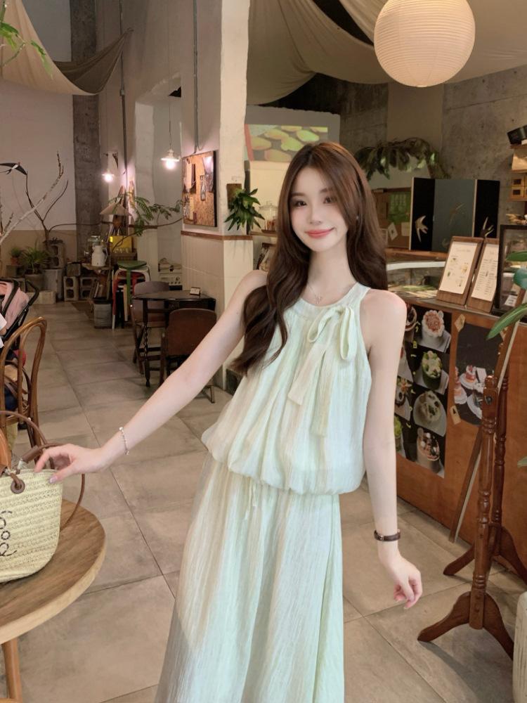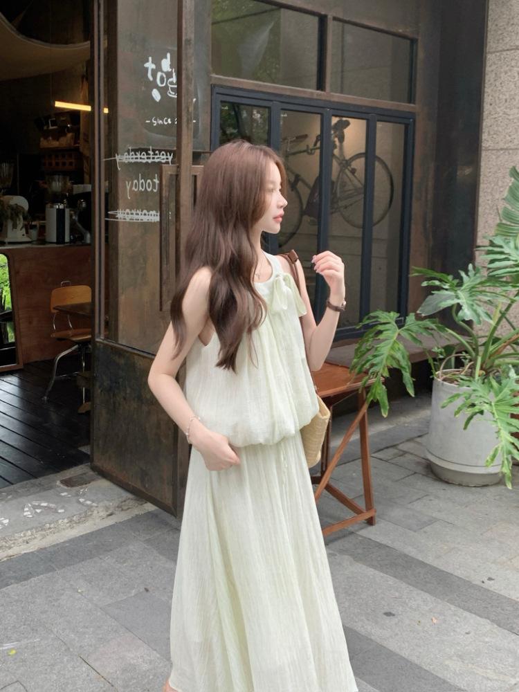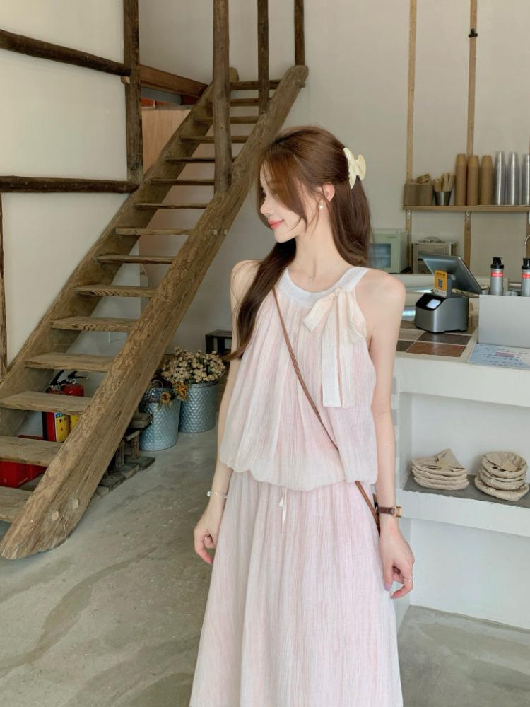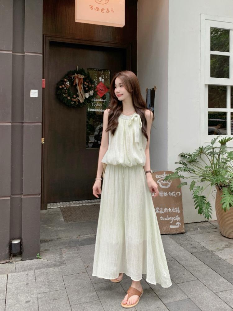 Traje de dos piezas con falda larga y cintura alta, estilo coreano, con cordones y plisado, estilo Cool Sense de verano.