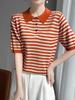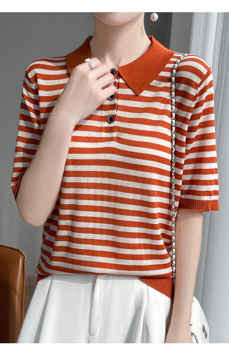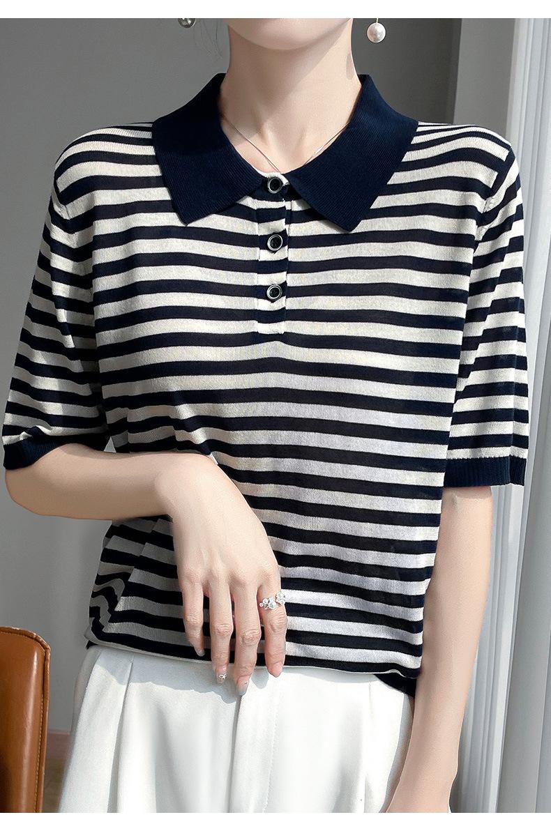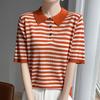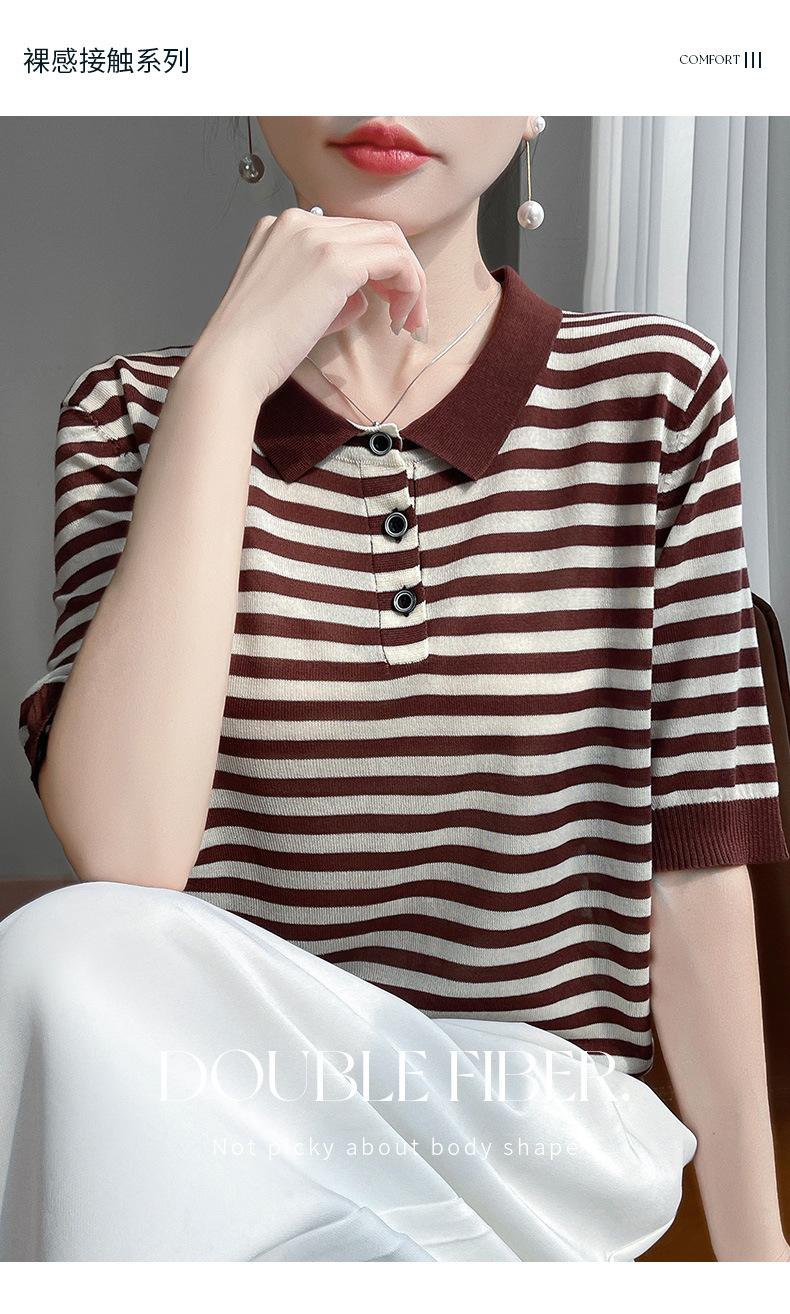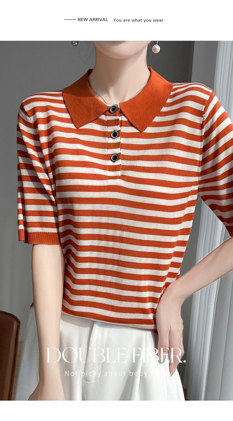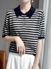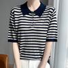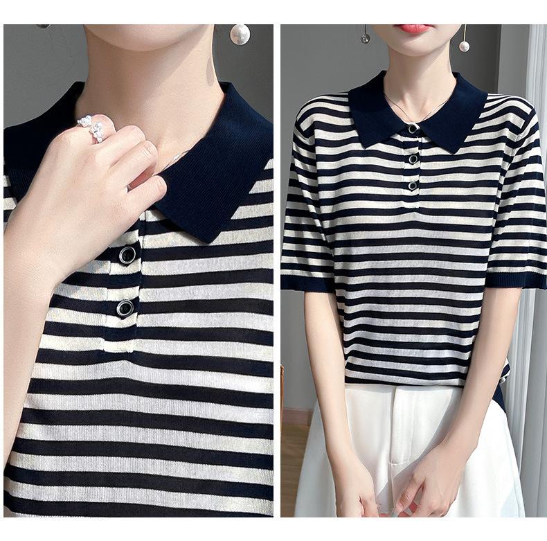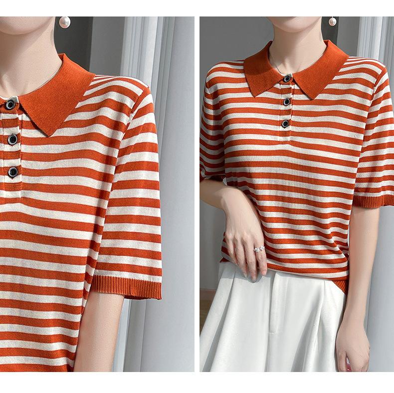 2025 Primavera y Verano Nueva Camiseta de Manga Corta a Rayas con Cuello Polo para Mujer Tencel Suelta Delgada Talla Grande Camiseta Básica Top