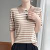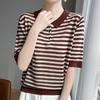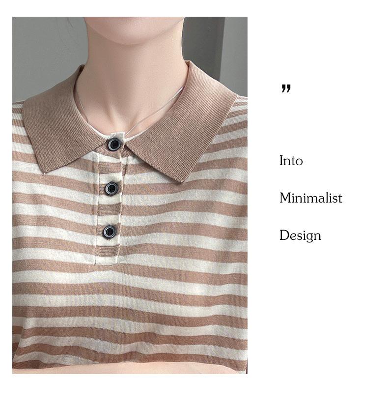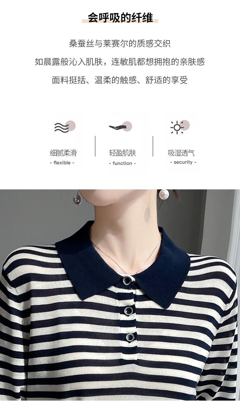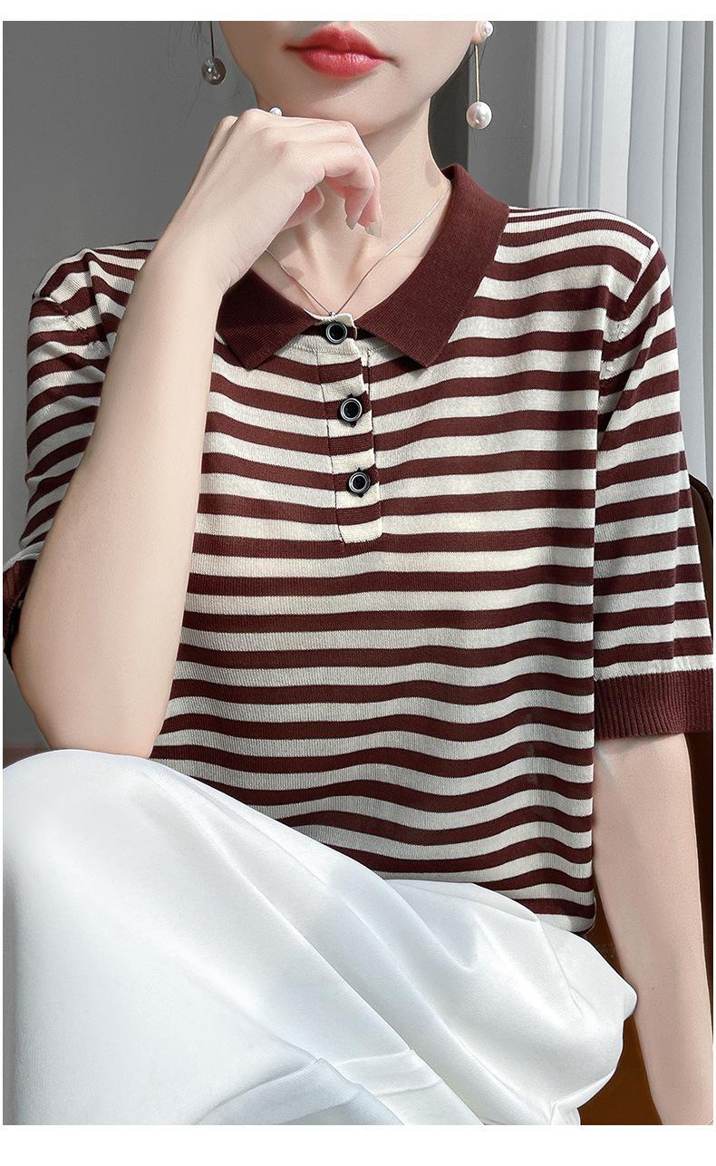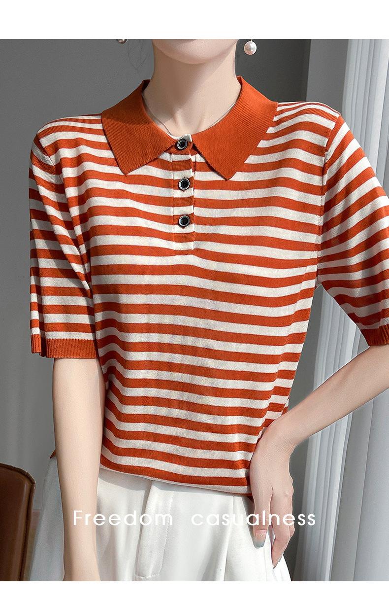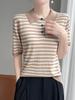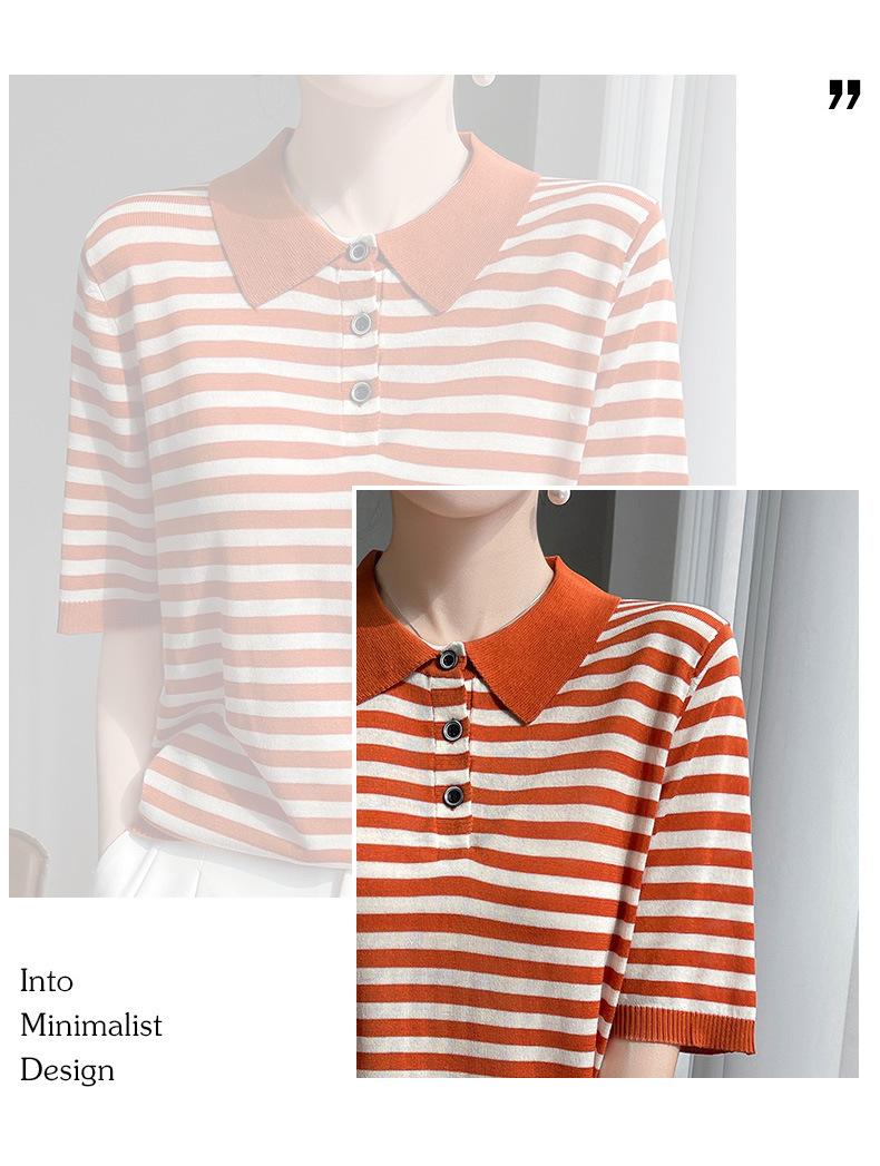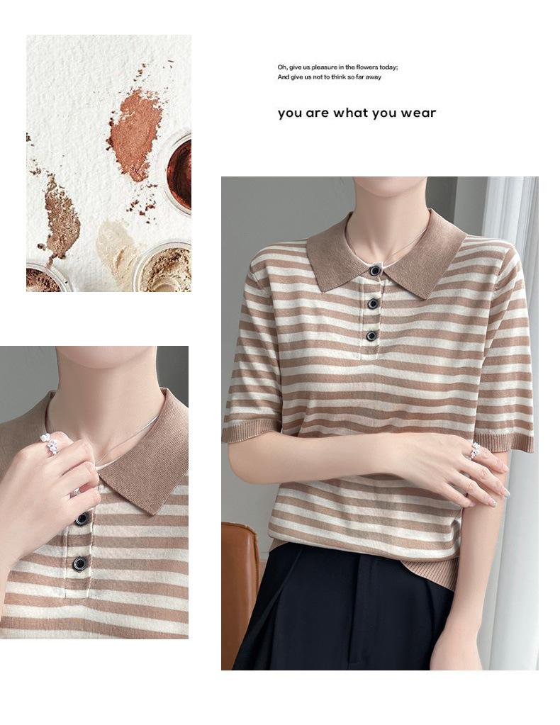 2025 Primavera y Verano Nueva Camiseta de Manga Corta a Rayas con Cuello Polo para Mujer Tencel Suelta Delgada Talla Grande Camiseta Básica Top