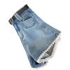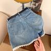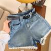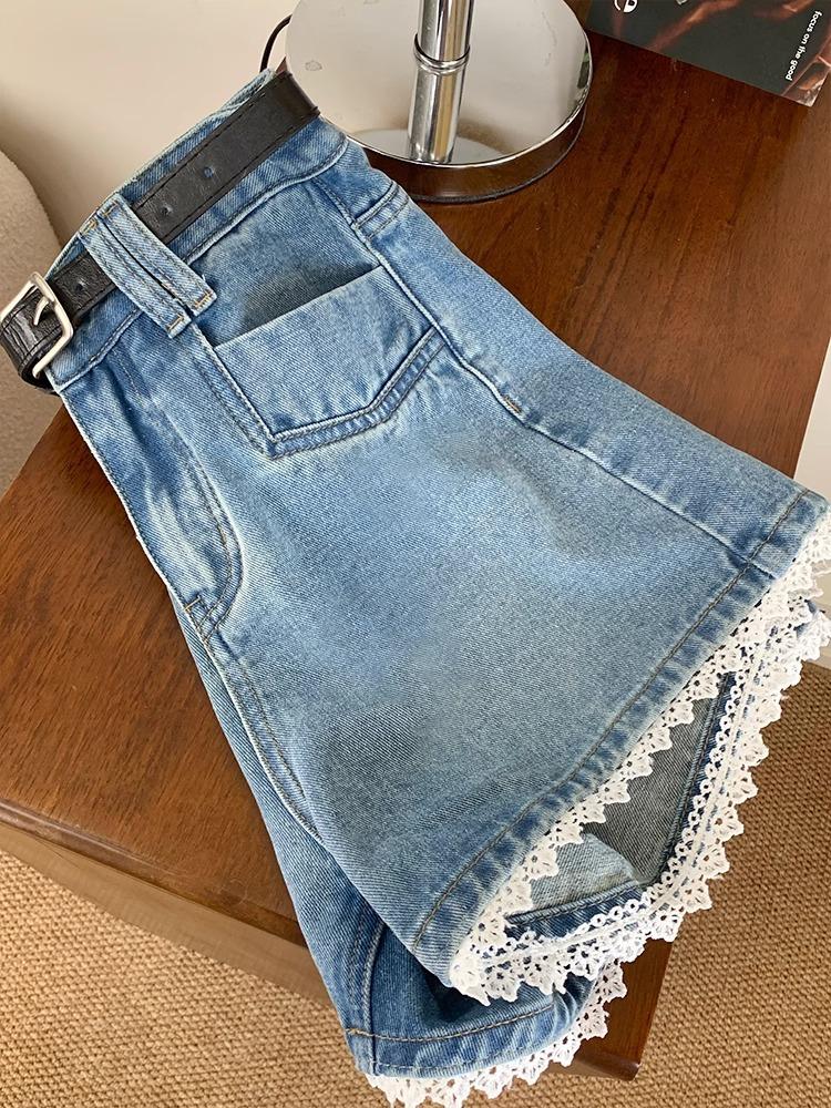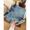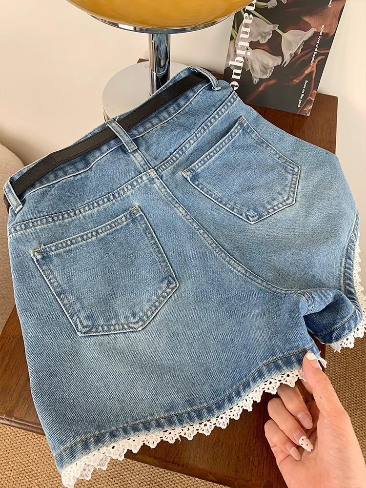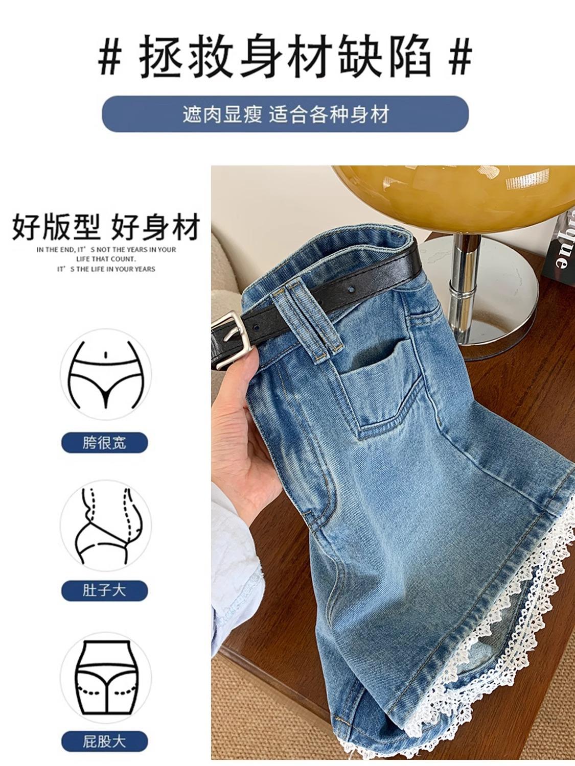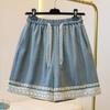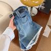 Shorts de mezclilla de cintura alta con encaje azul para mujer, verano, delgados, talla extra, casuales, holgados, adelgazantes, de pierna ancha, en forma de A
