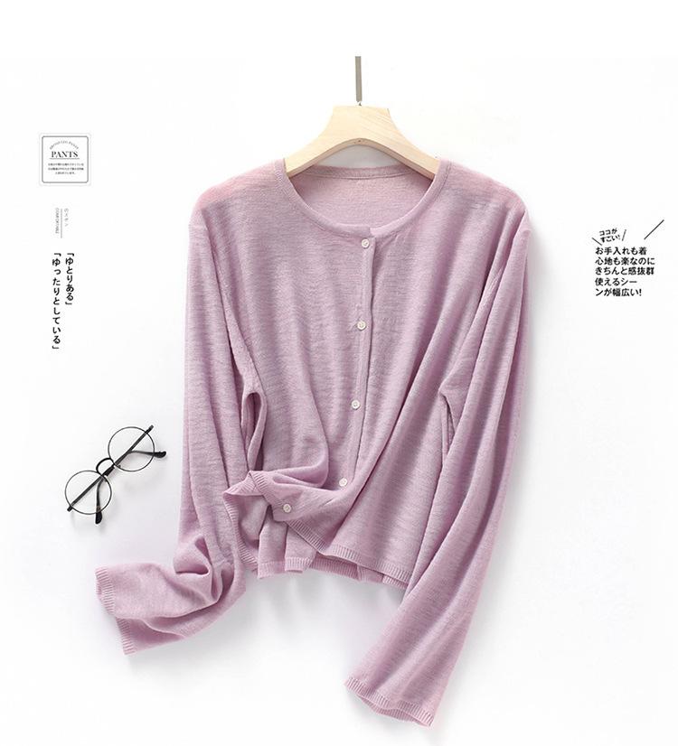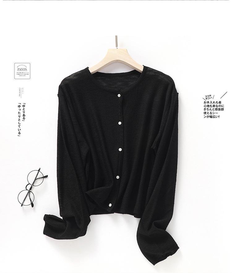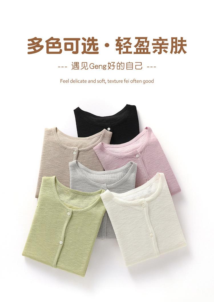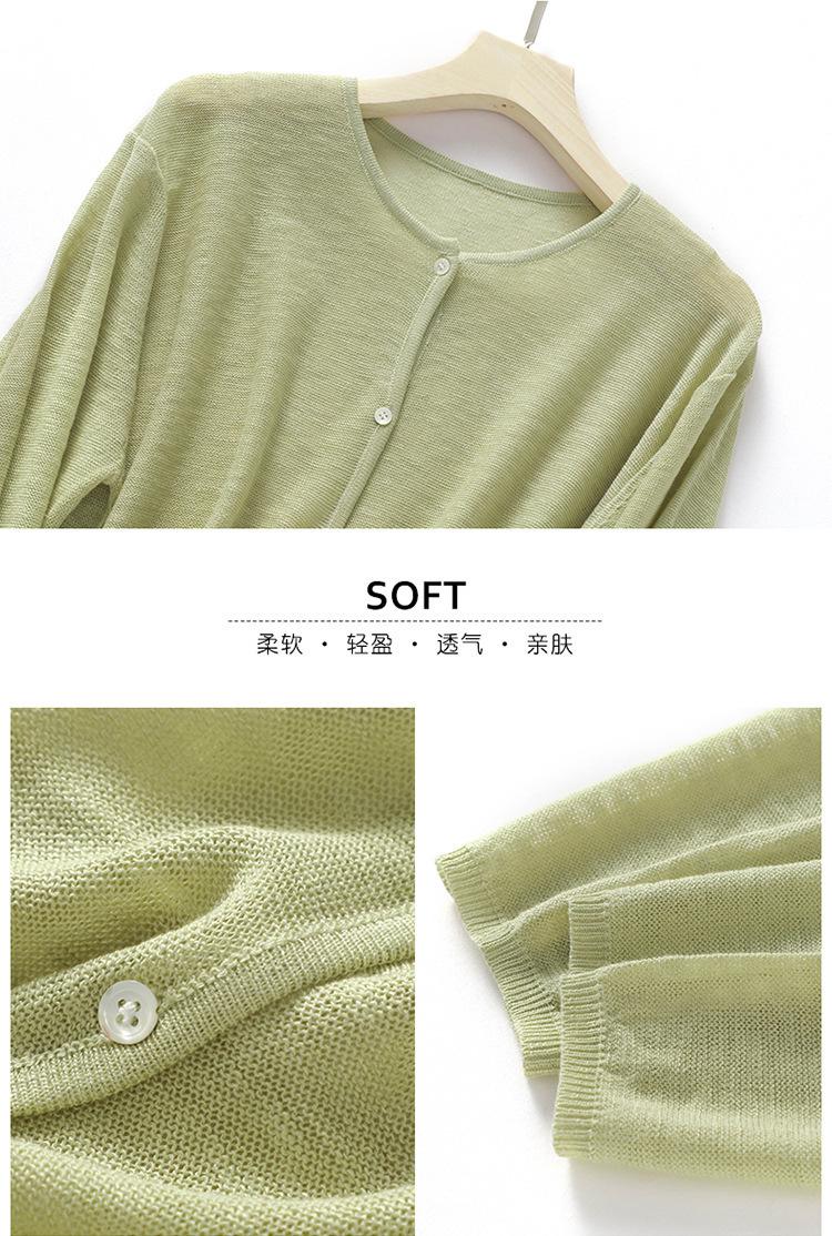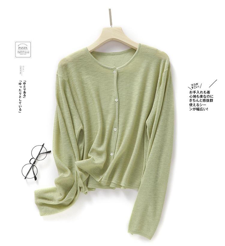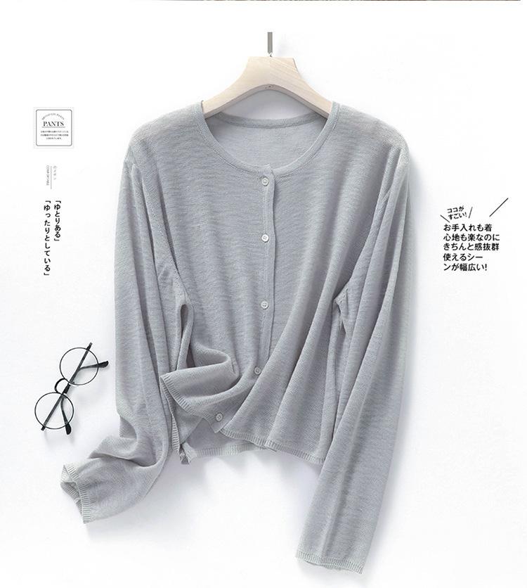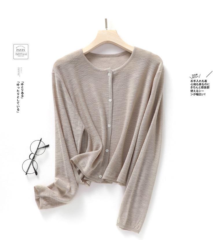 Cárdigan de Punto de Lino de Bambú Estilo Nuevo de Primavera y Verano Color Sólido Simple Cuello Redondo Protección Solar para Mujer Blusa para Aire Acondicionado Ropa Exterior de Manga Larga Trendy