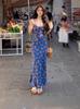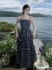 Vestido de Playa Europeo y Americano de Tirantes de Cintura Alta Estampado Elegante para Viaje Dobladillo con Volantes Lazo Cordones
