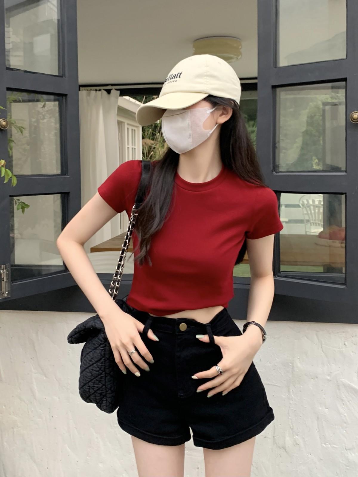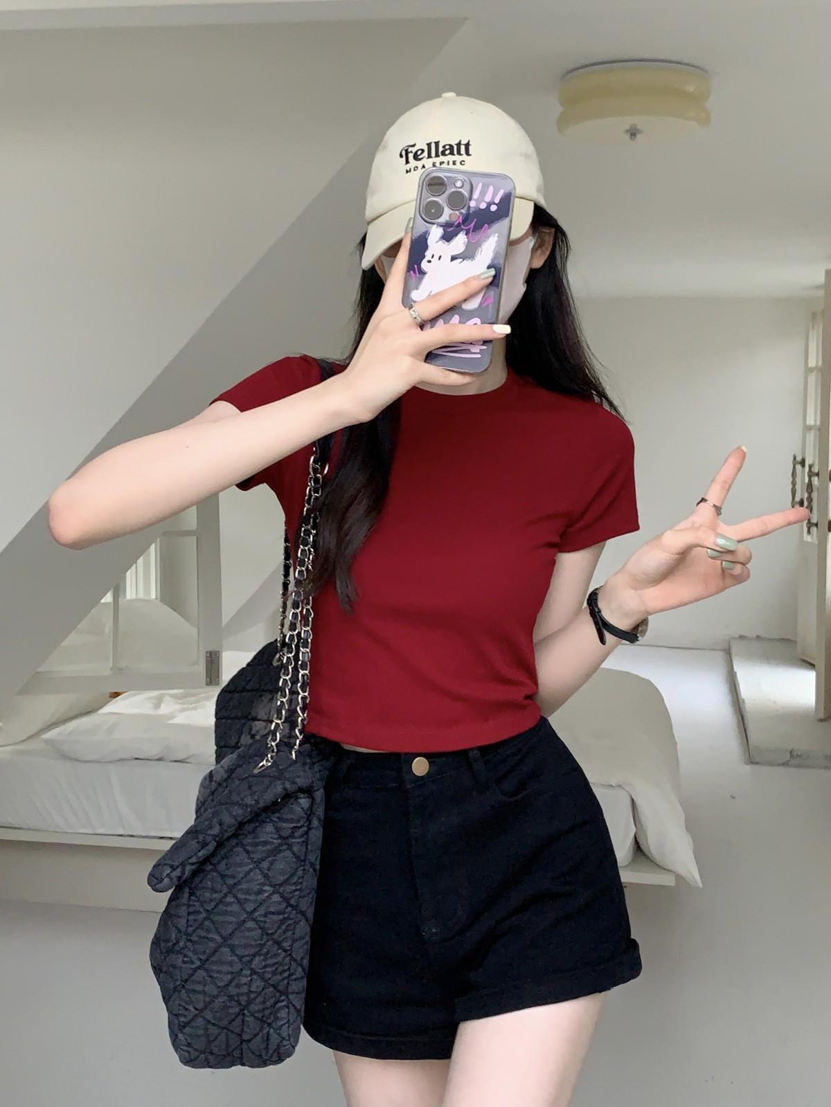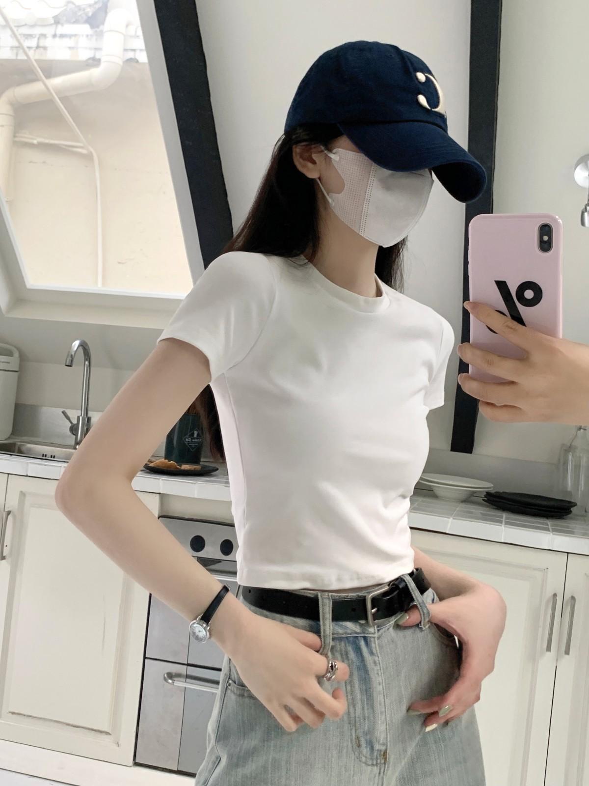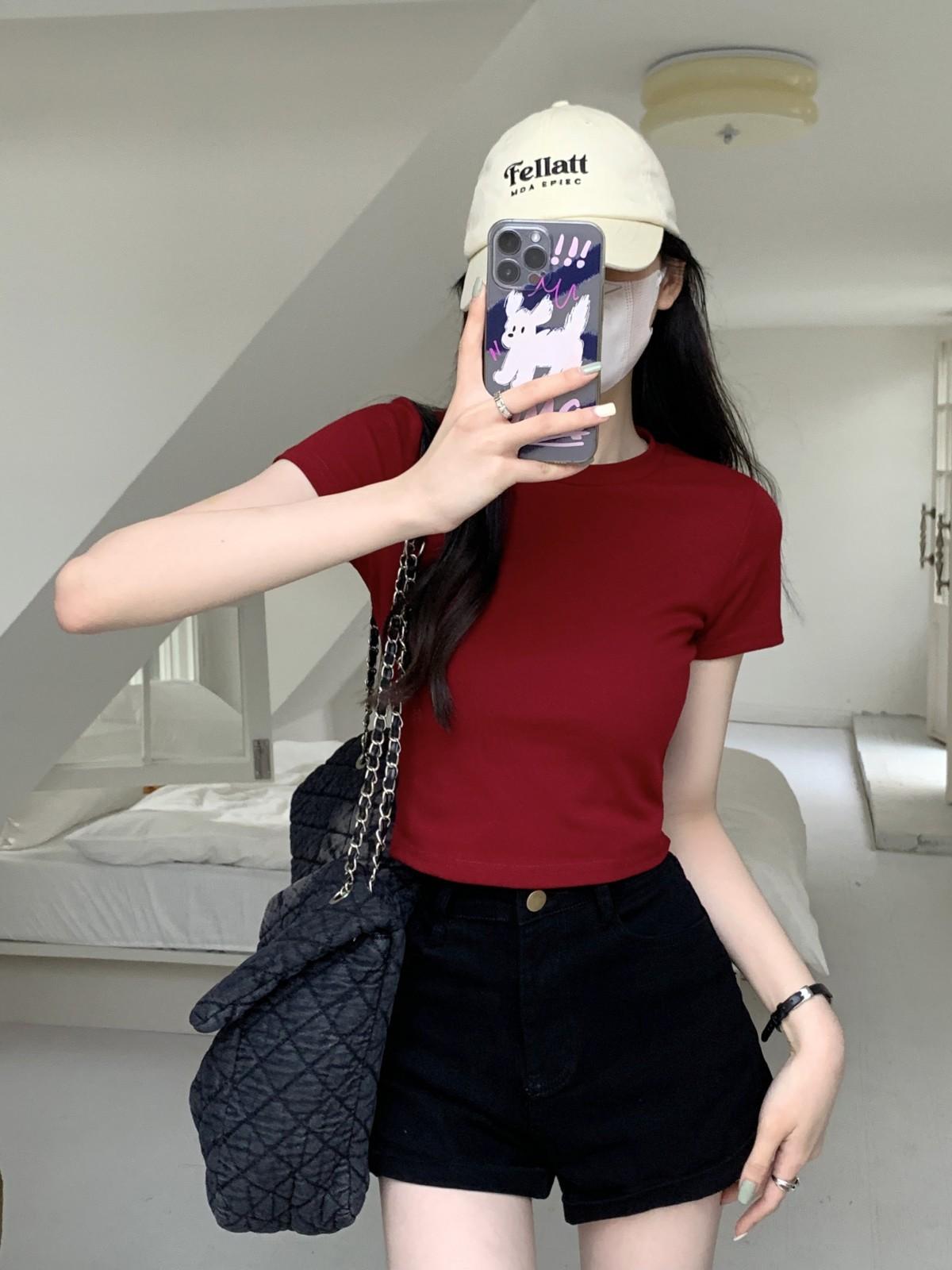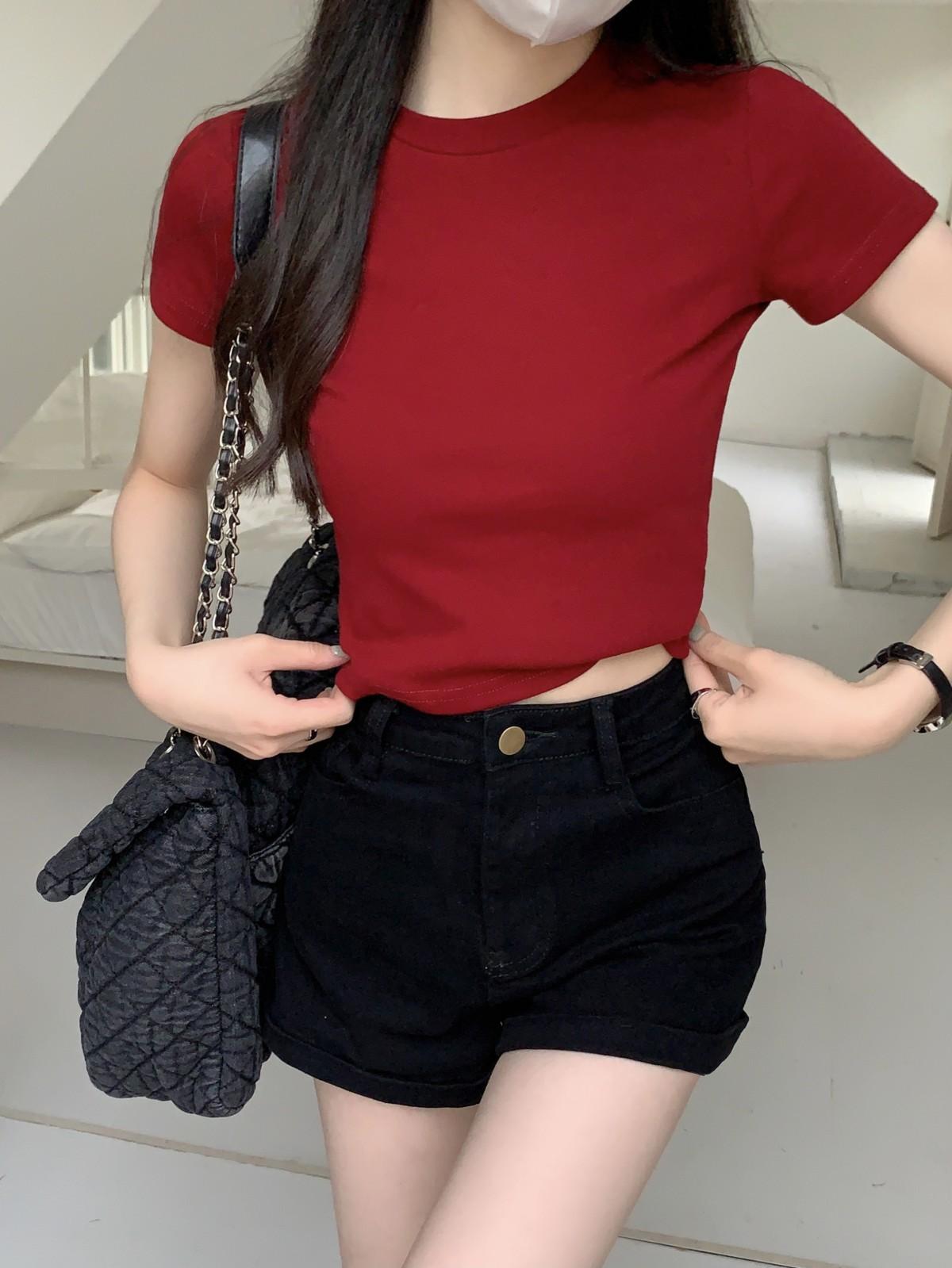 Foto Real Verano 2025 Estilo Coreano Ajustado Cuello Redondo Hombro Color Sólido Corto Versátil Camiseta de Manga Corta Tops de Chica Picante para Mujer