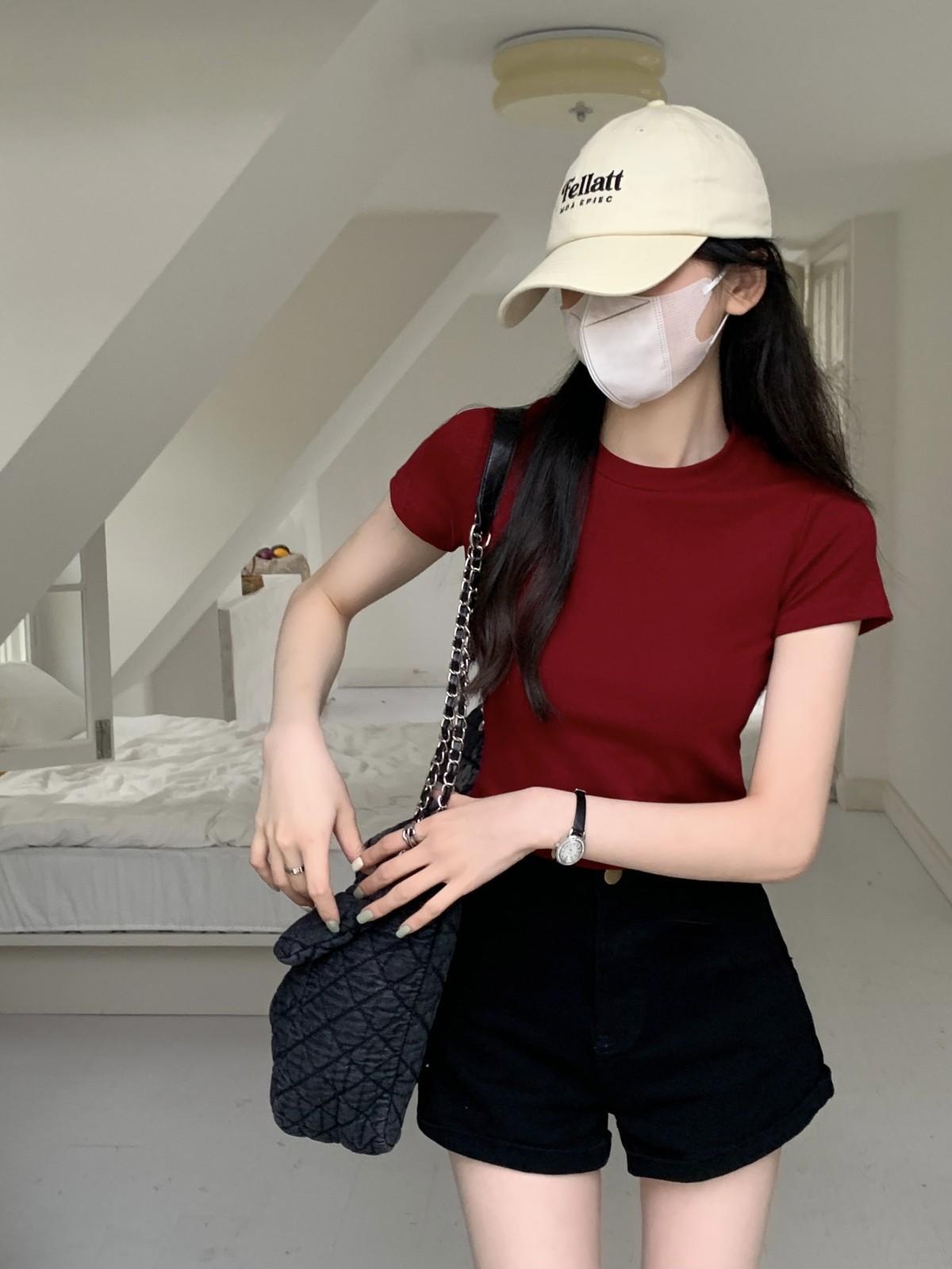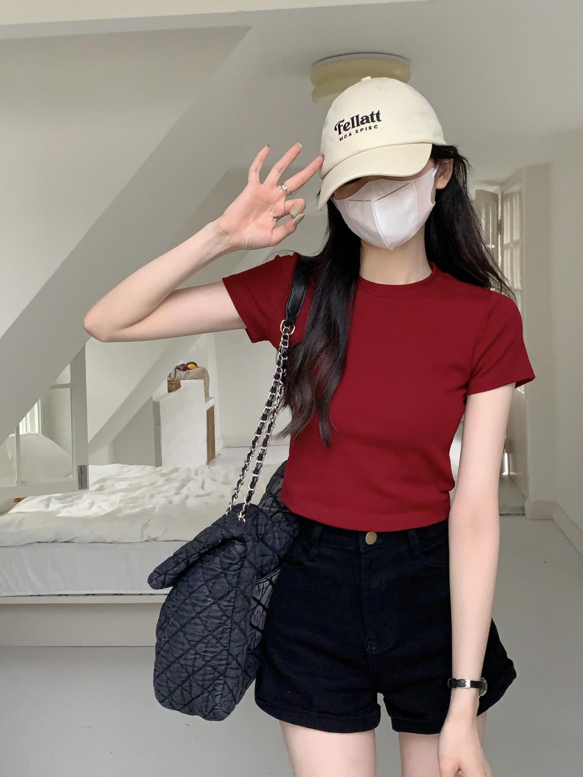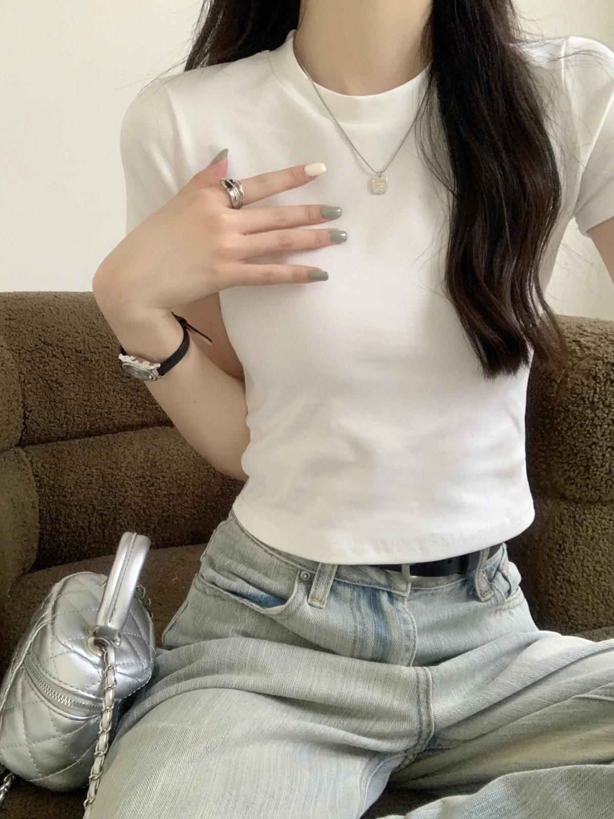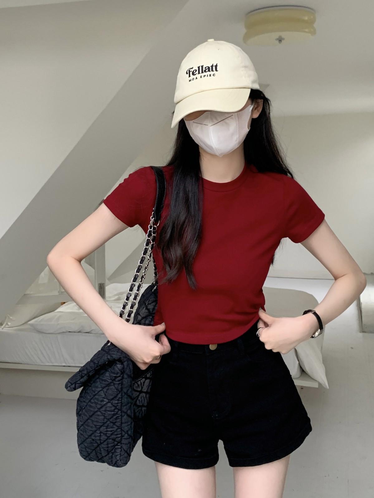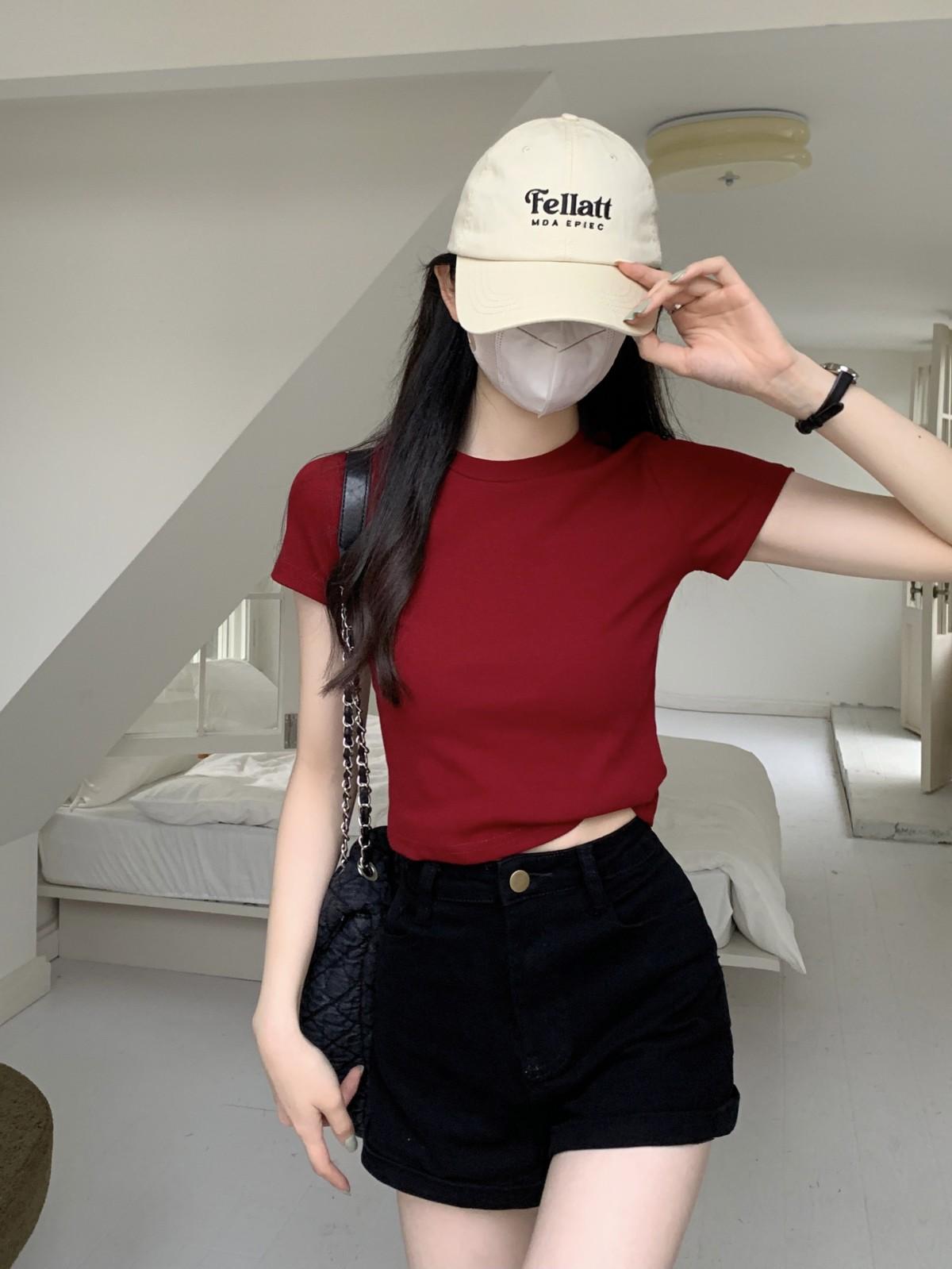 Foto Real Verano 2025 Estilo Coreano Ajustado Cuello Redondo Hombro Color Sólido Corto Versátil Camiseta de Manga Corta Tops de Chica Picante para Mujer