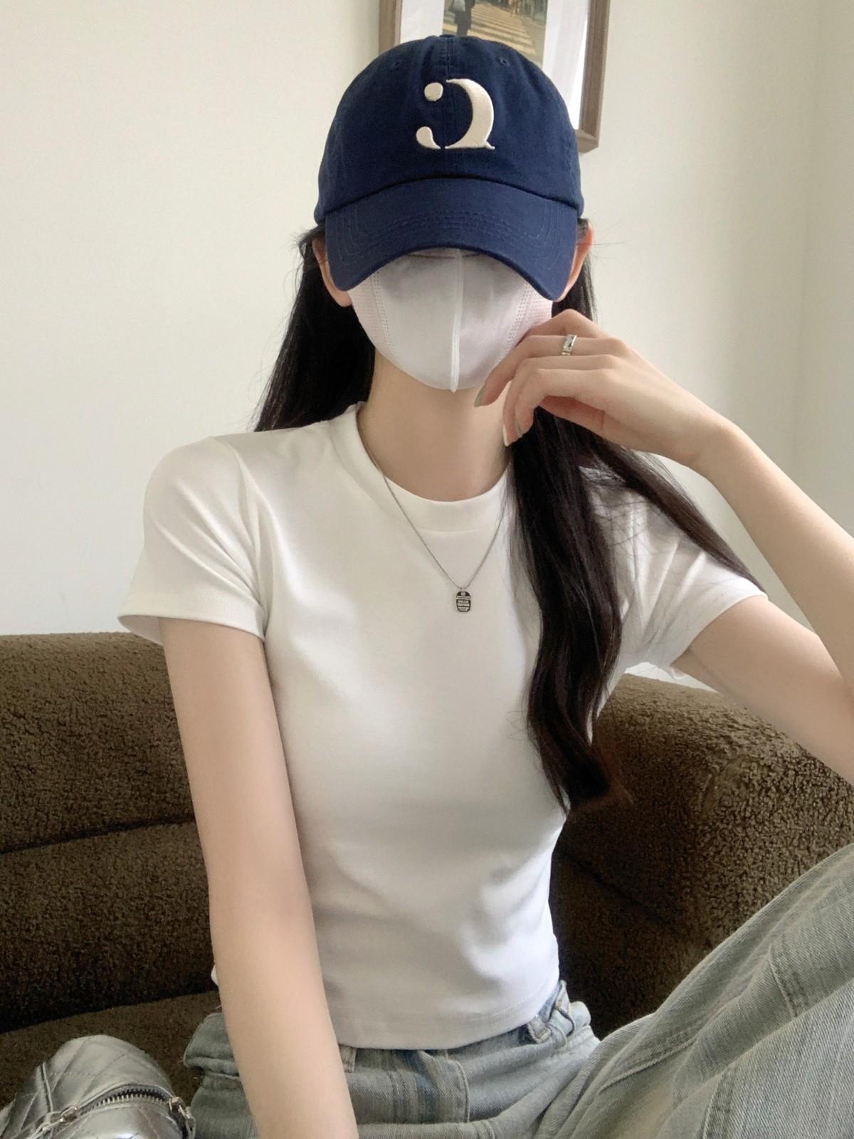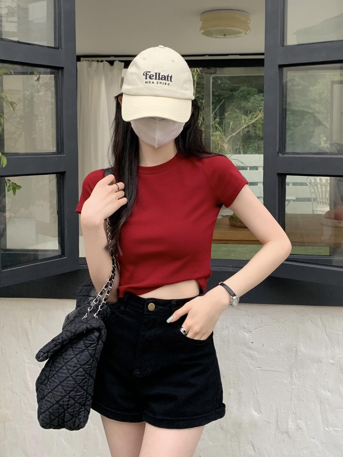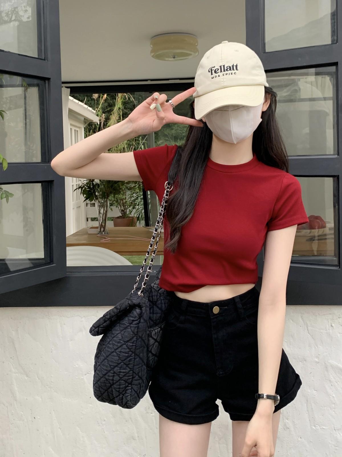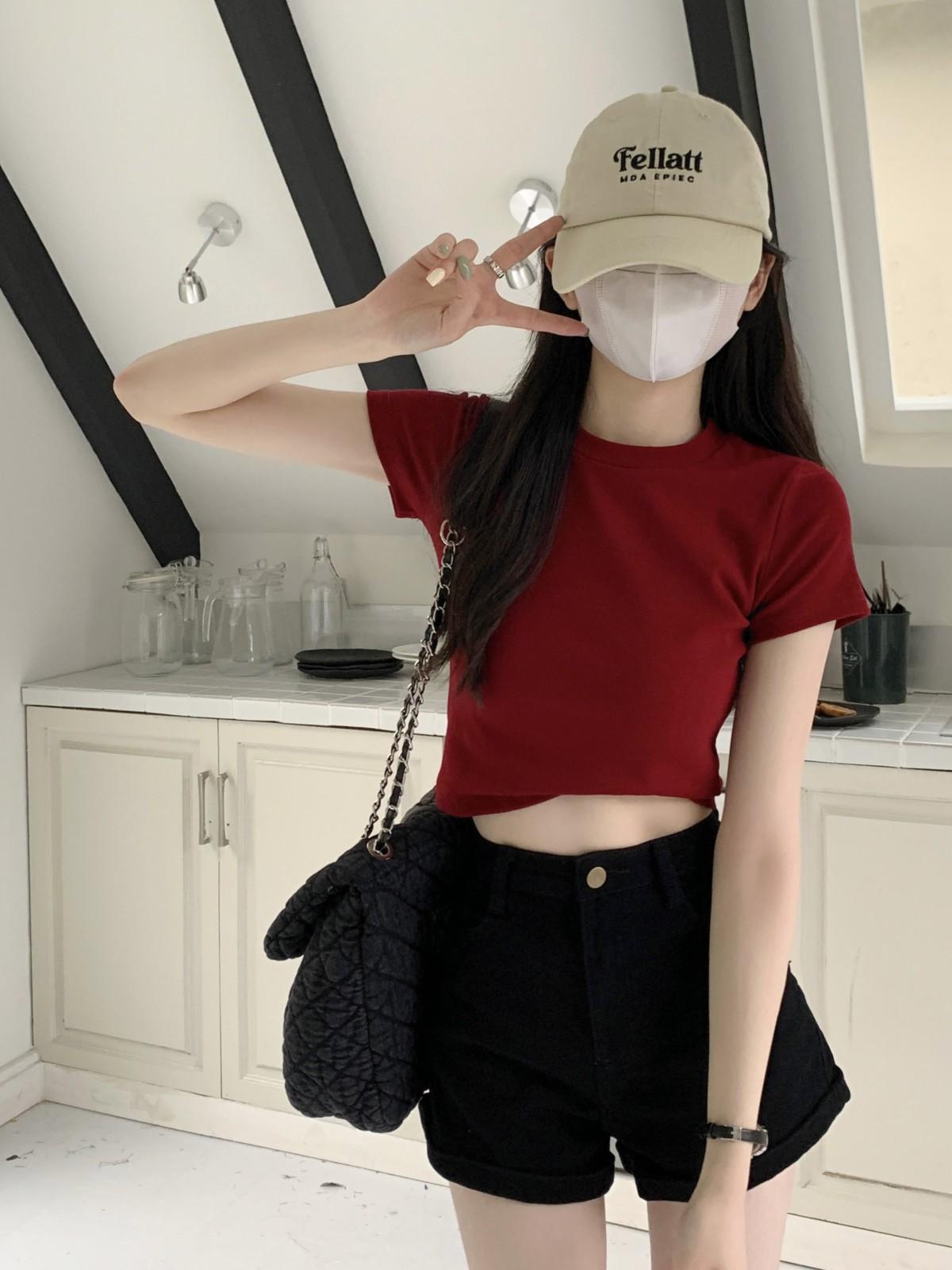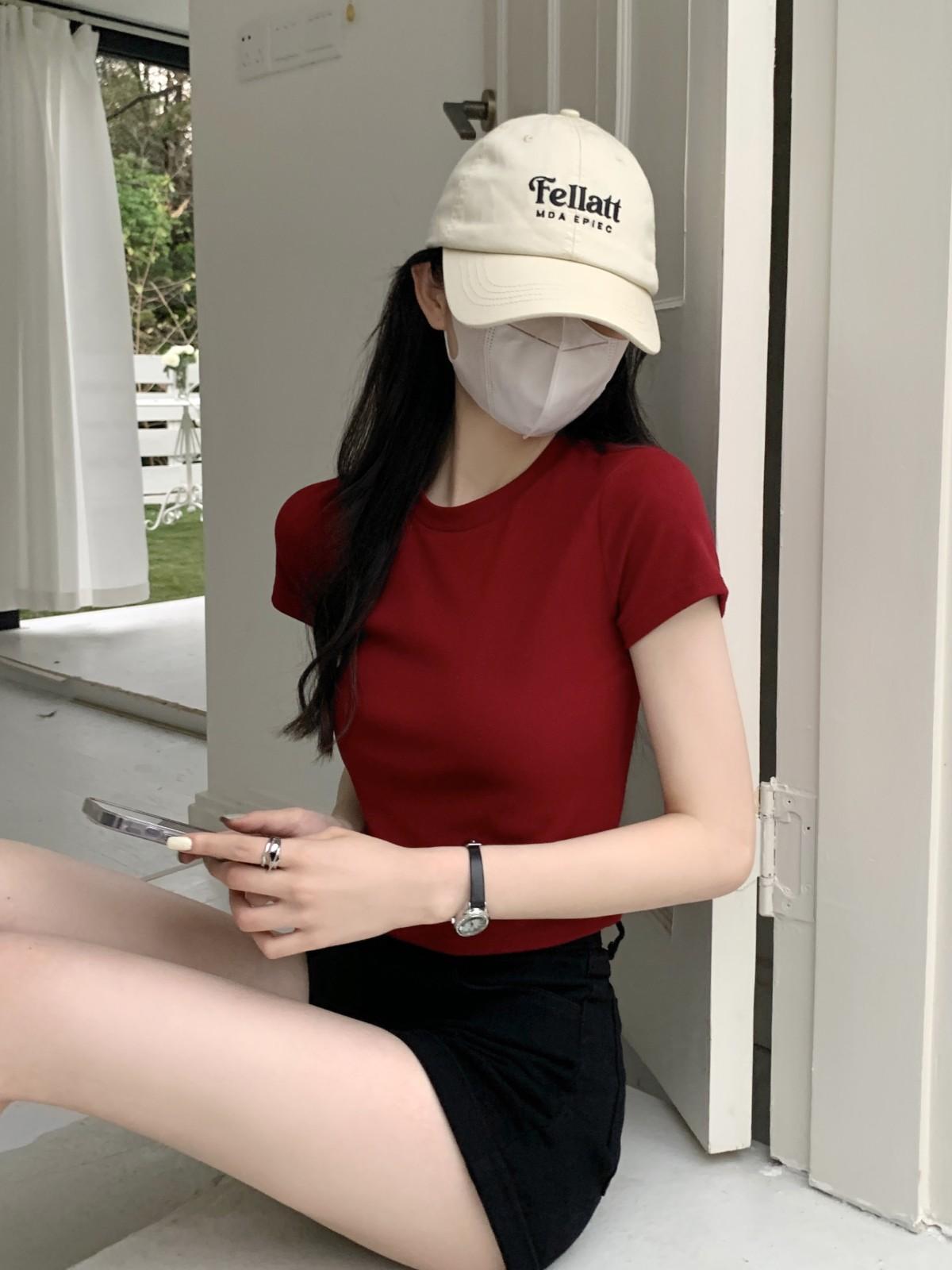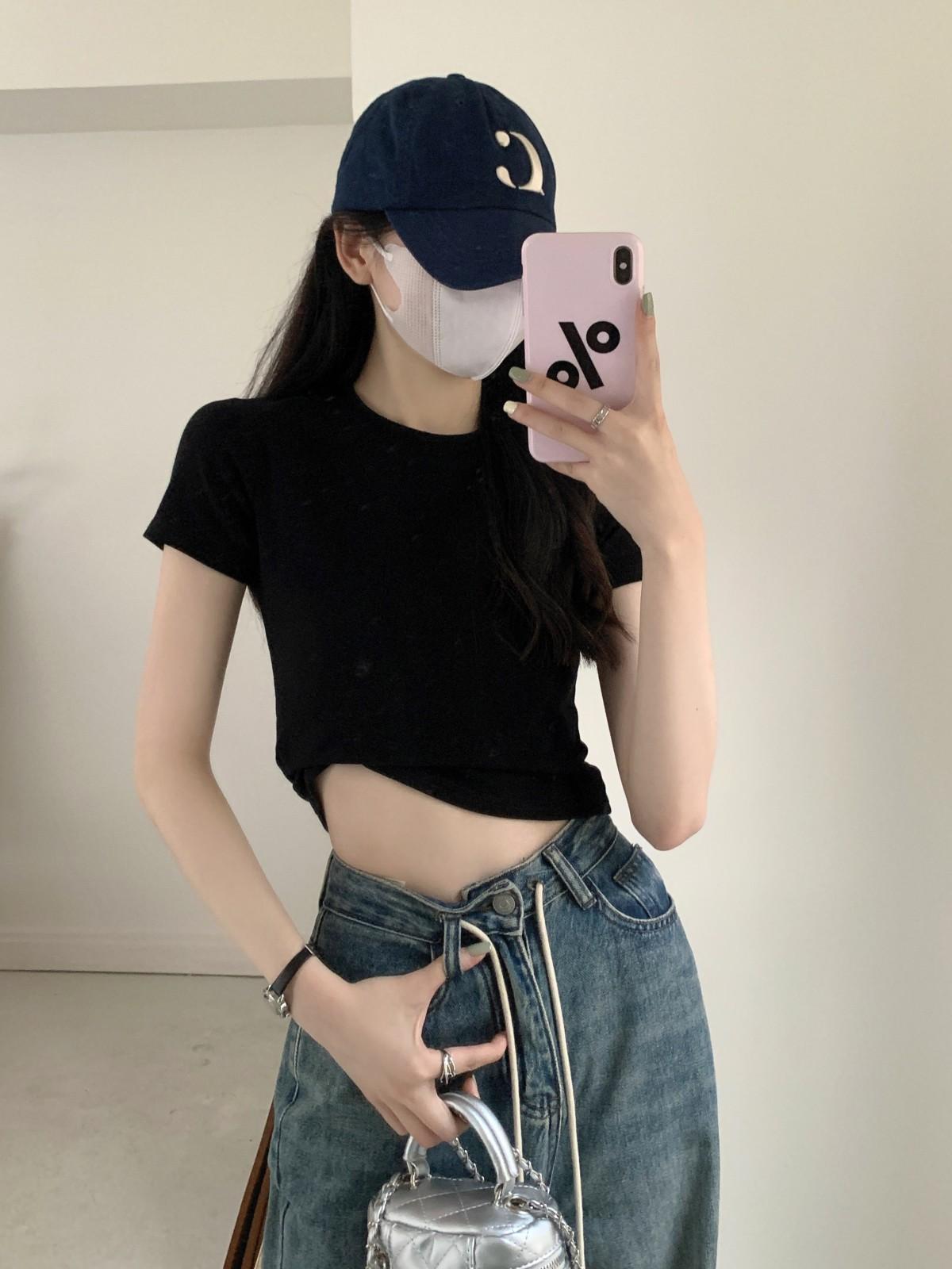 Foto Real Verano 2025 Estilo Coreano Ajustado Cuello Redondo Hombro Color Sólido Corto Versátil Camiseta de Manga Corta Tops de Chica Picante para Mujer