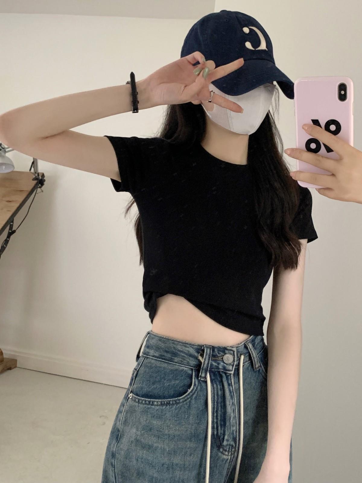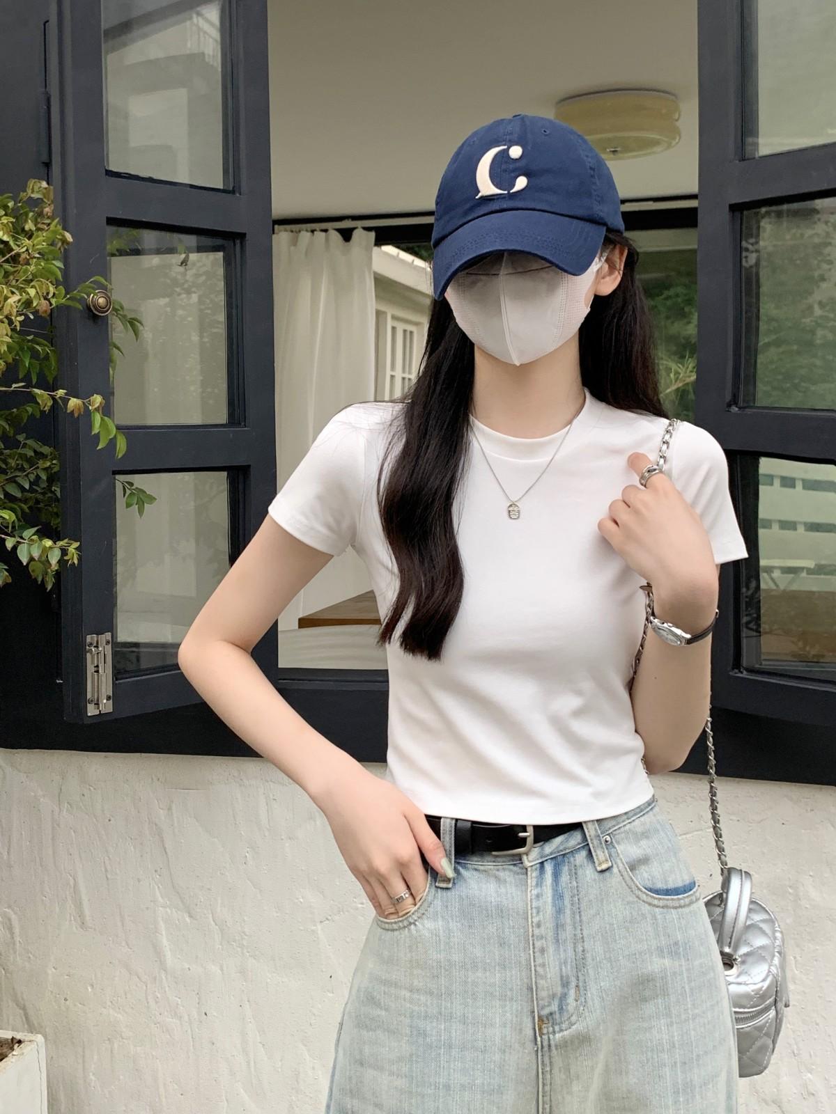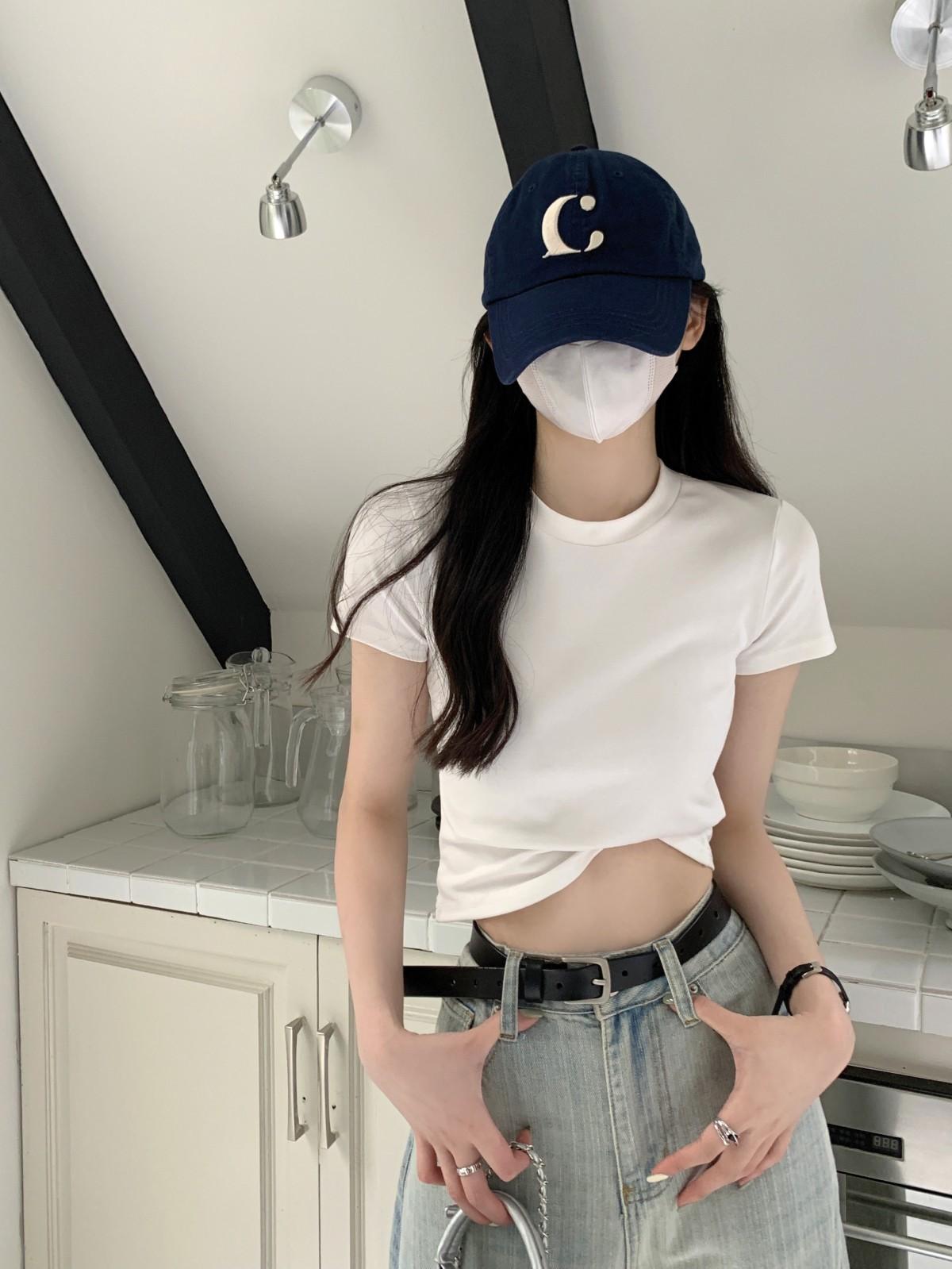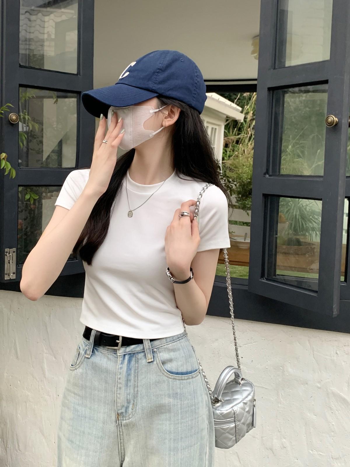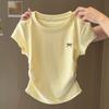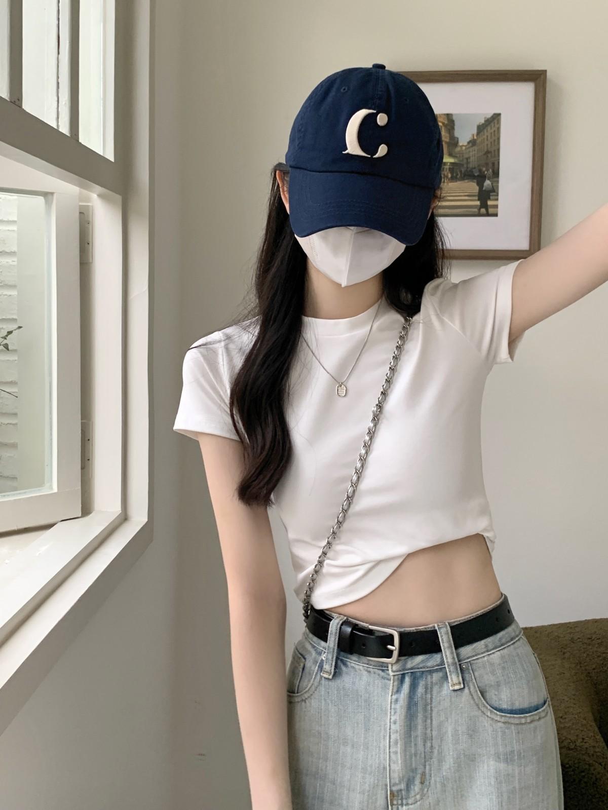 Foto Real Verano 2025 Estilo Coreano Ajustado Cuello Redondo Hombro Color Sólido Corto Versátil Camiseta de Manga Corta Tops de Chica Picante para Mujer