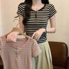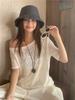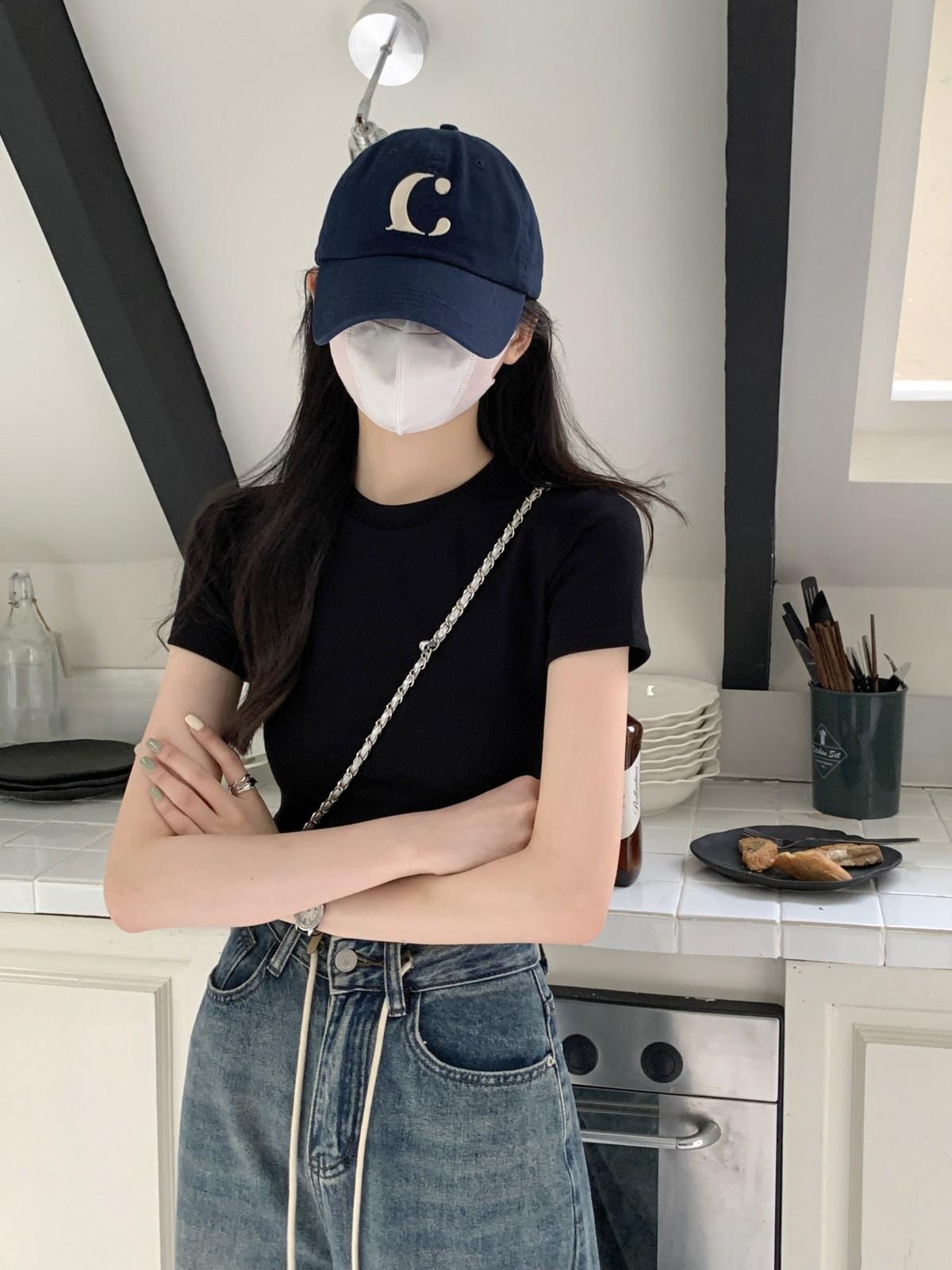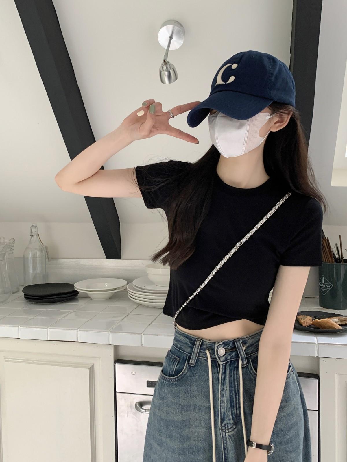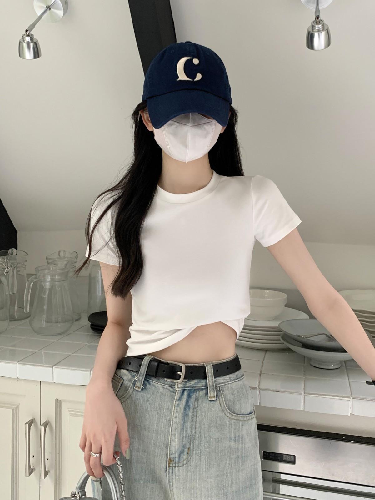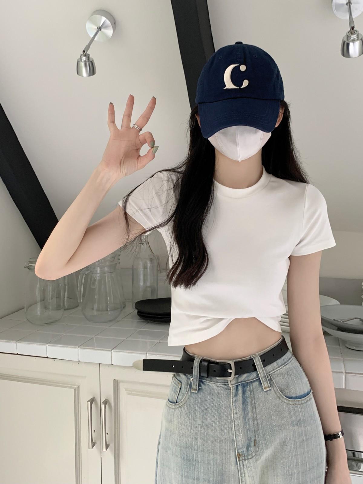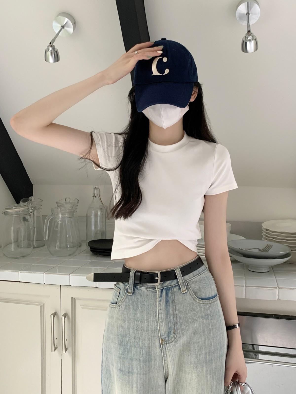 Foto Real Verano 2025 Estilo Coreano Ajustado Cuello Redondo Hombro Color Sólido Corto Versátil Camiseta de Manga Corta Tops de Chica Picante para Mujer