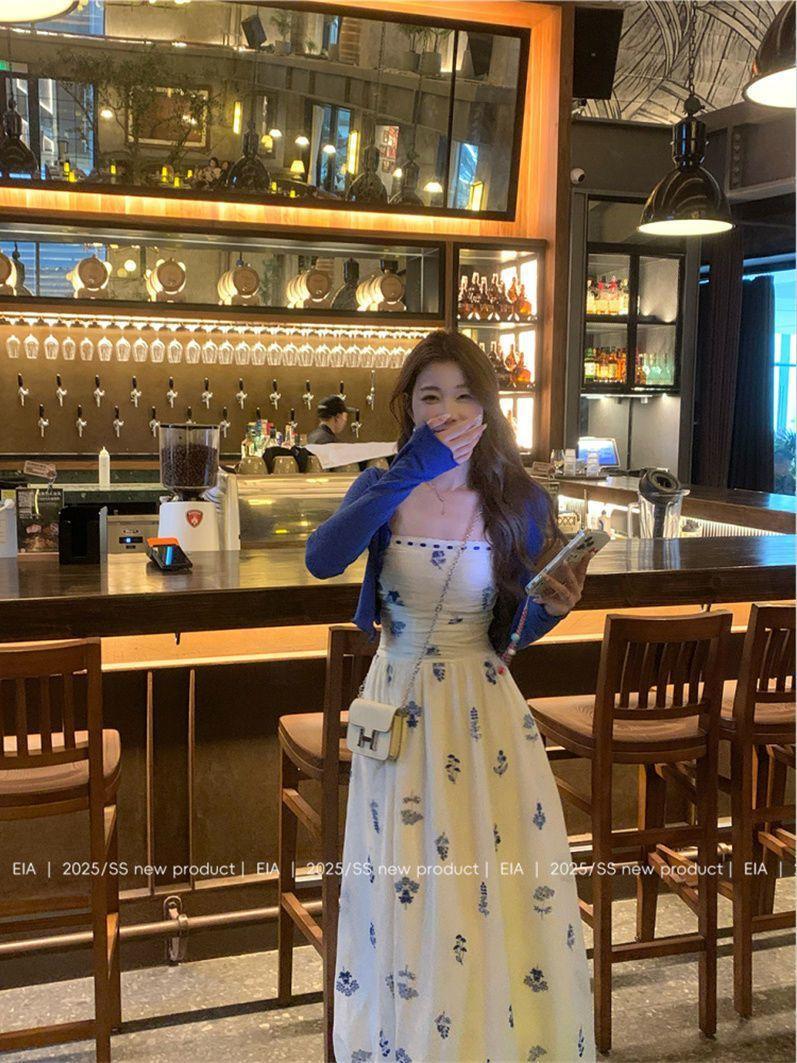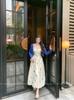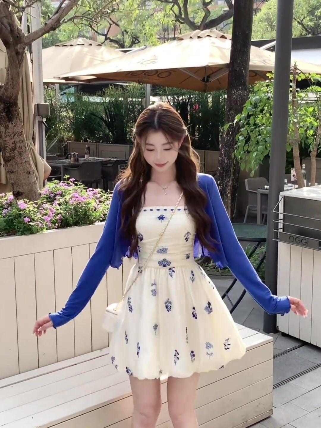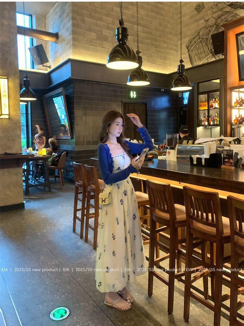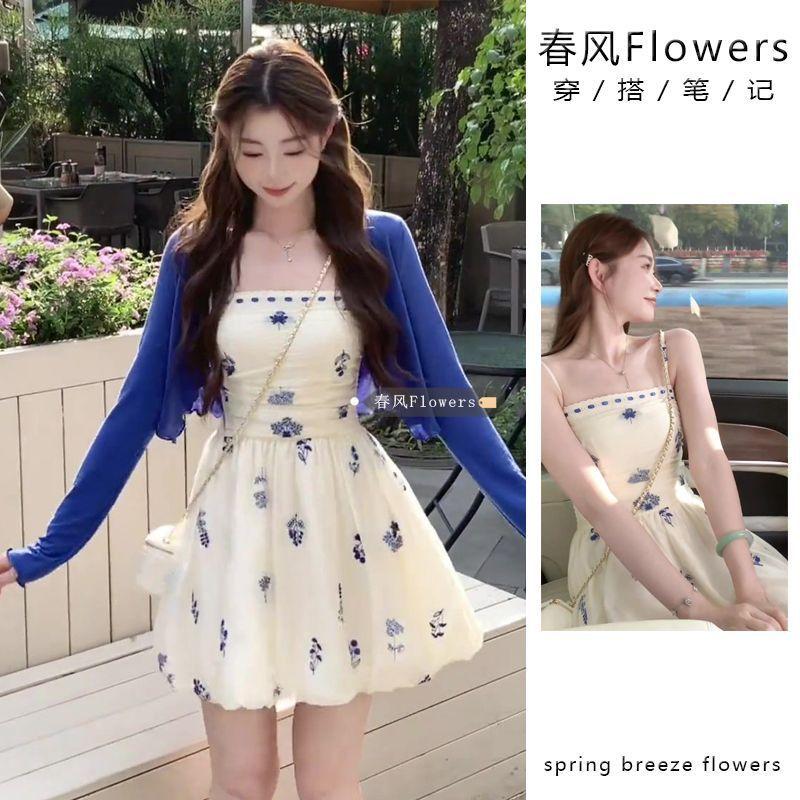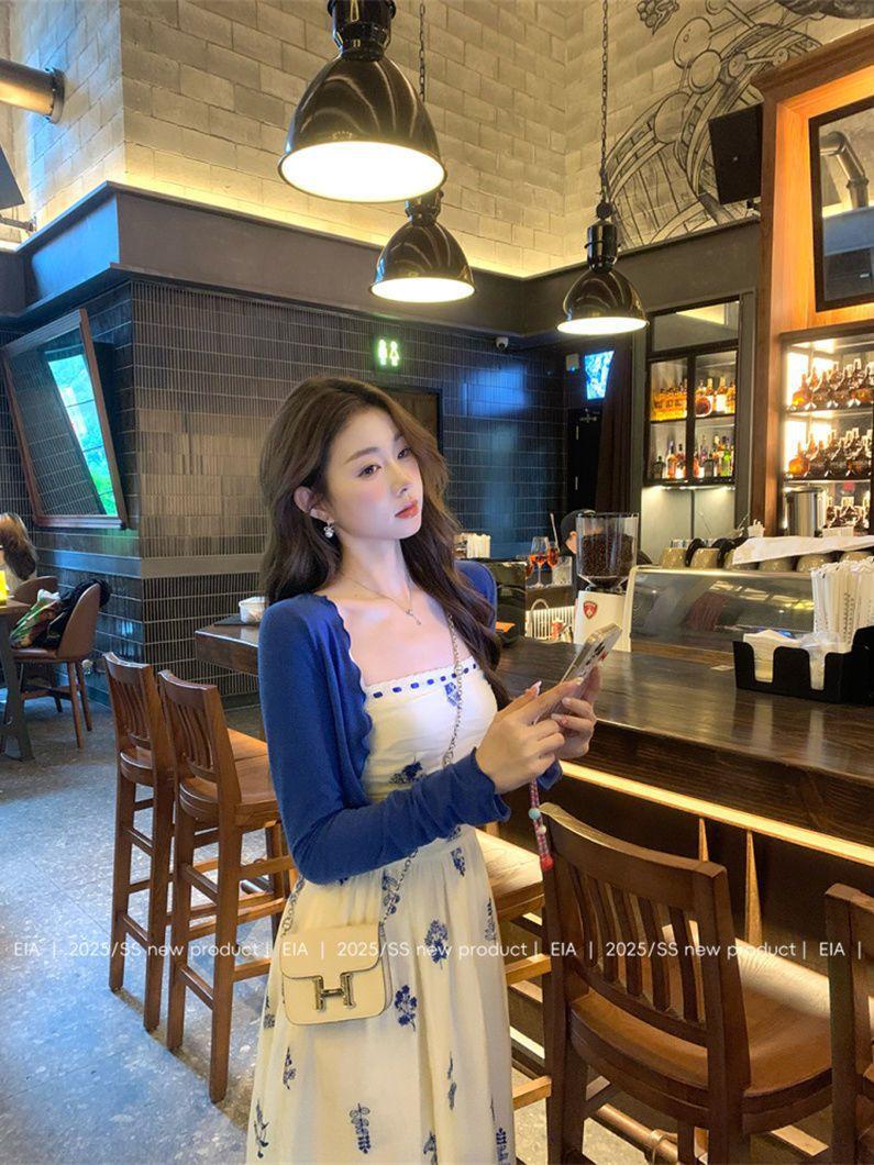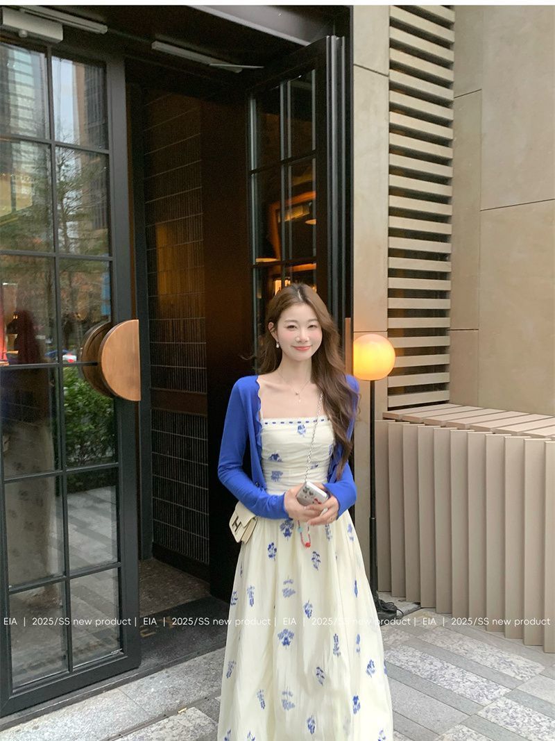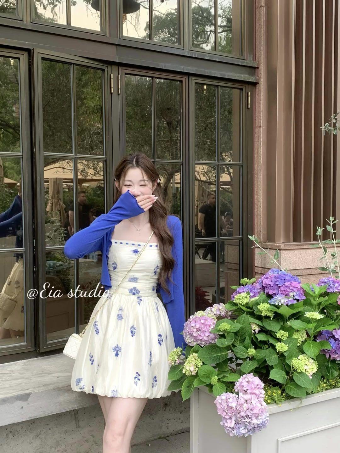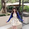 Vestido camisero floral azul Klein dulce y picante para mujer, verano, delgado, bloqueador solar, cárdigan, cintura, falda de capullo