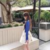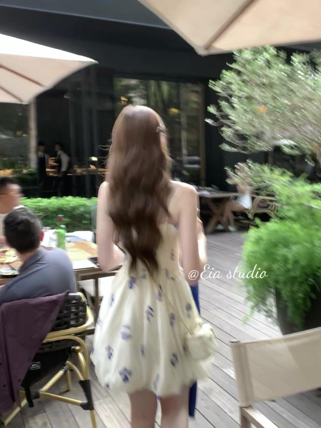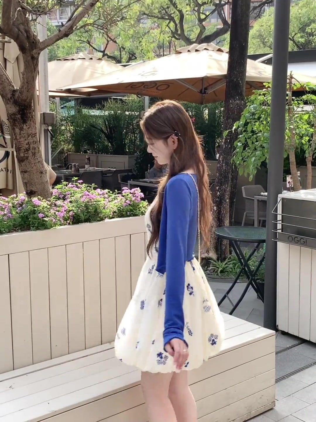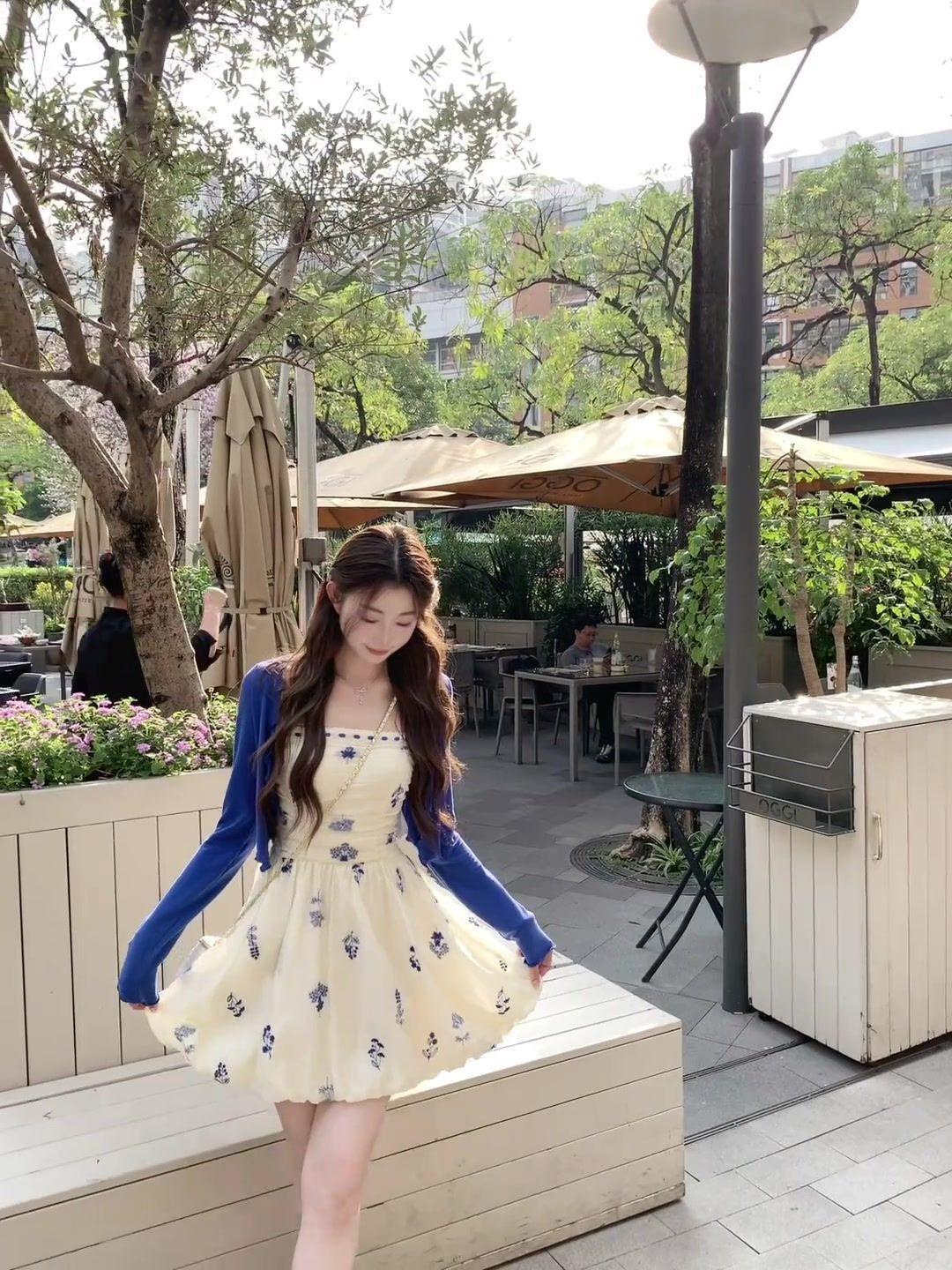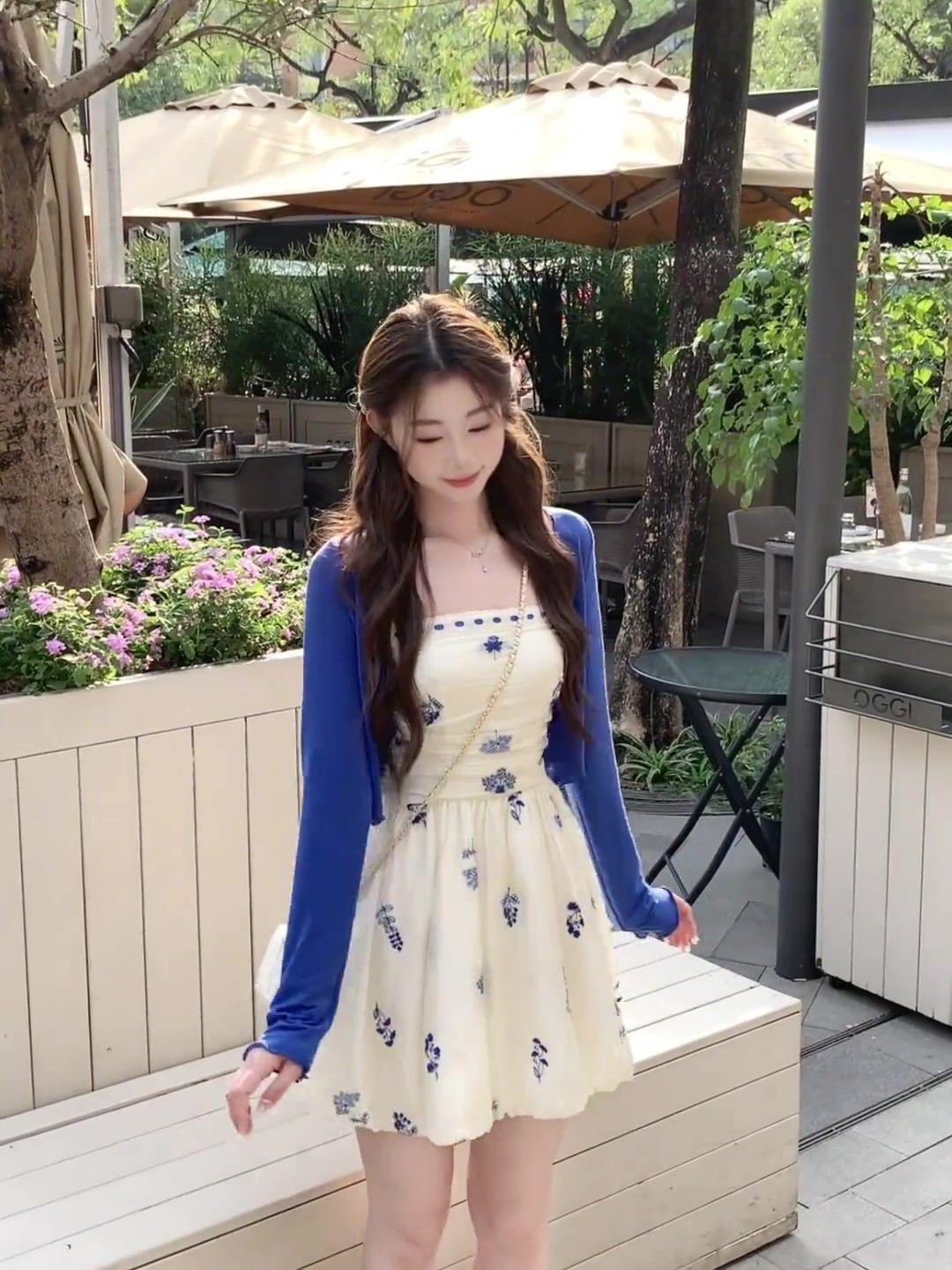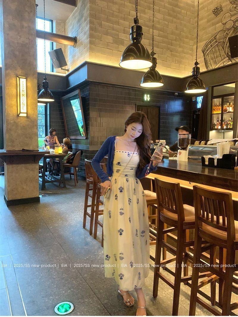 Vestido camisero floral azul Klein dulce y picante para mujer, verano, delgado, bloqueador solar, cárdigan, cintura, falda de capullo