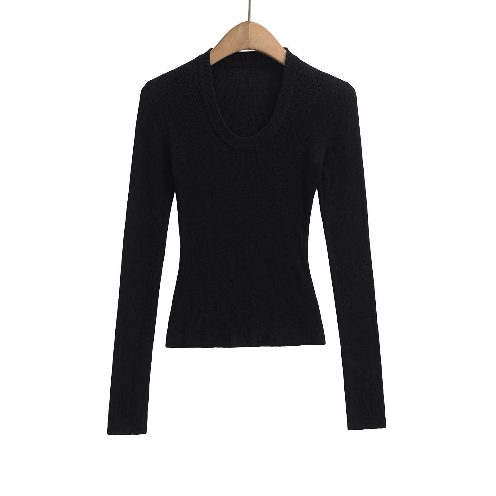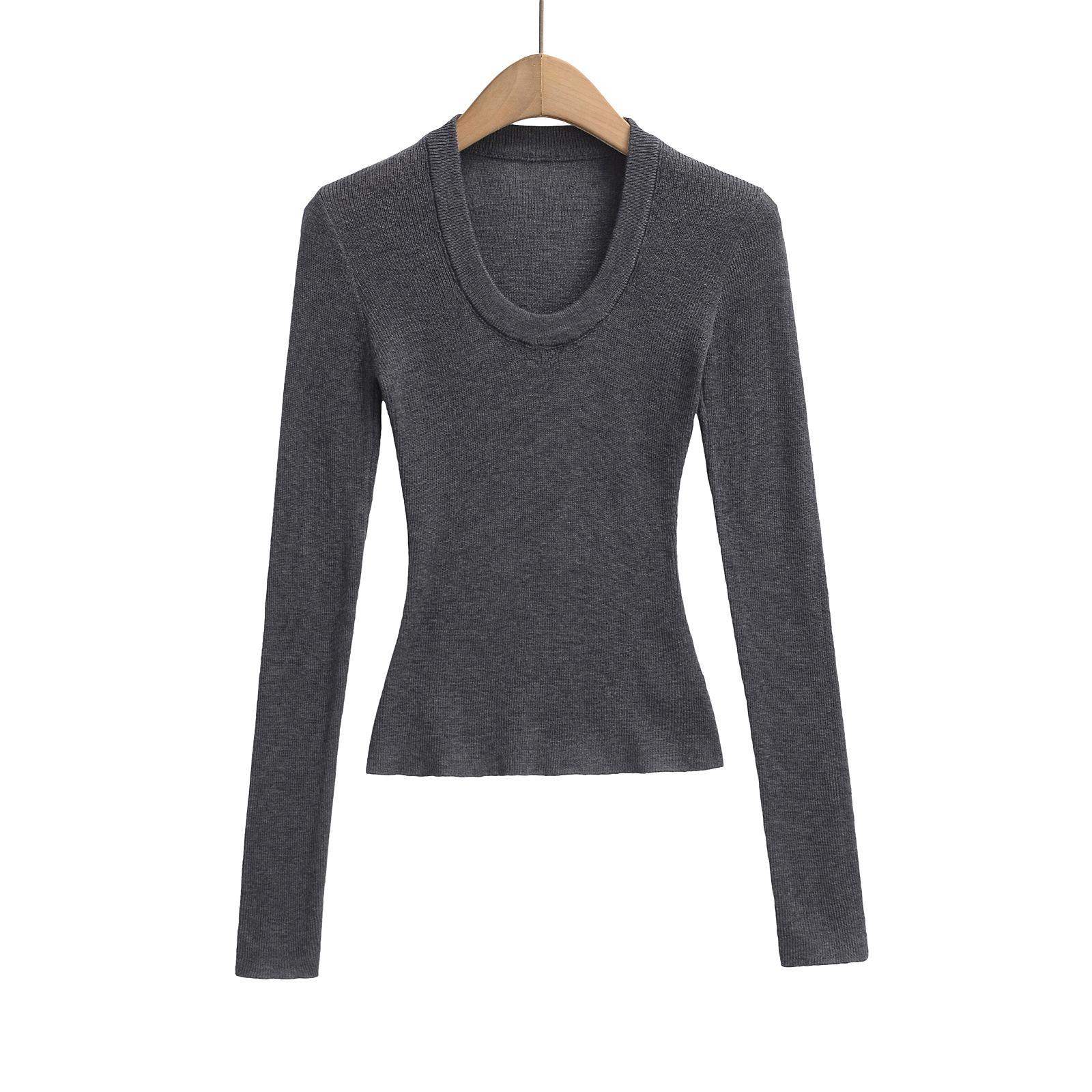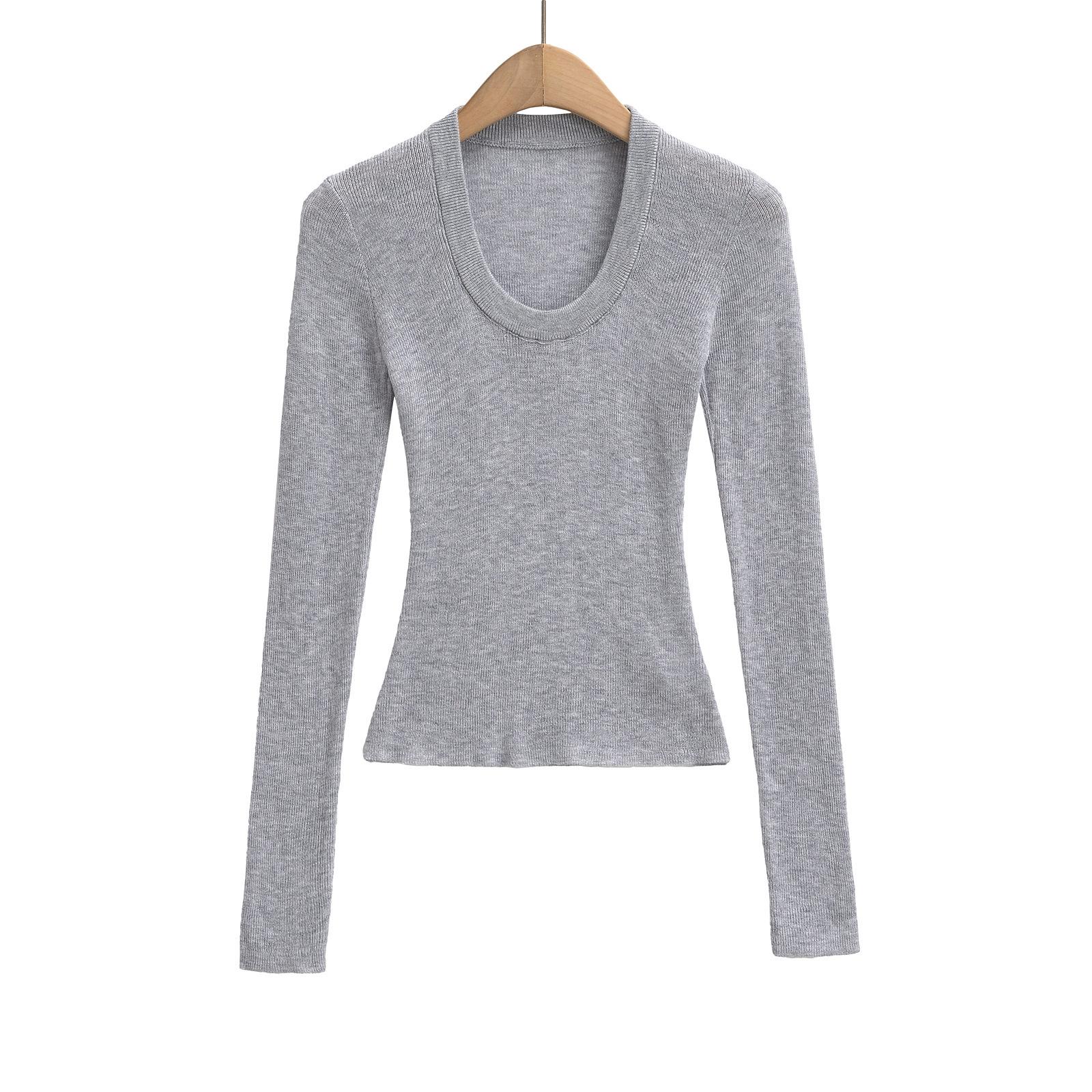 25030-2025 Nueva Moda Sexy Manga Larga Tejido Camisa Chaqueta Mujer Cuello Redondo Francés Ajustado Cuello U Suéter