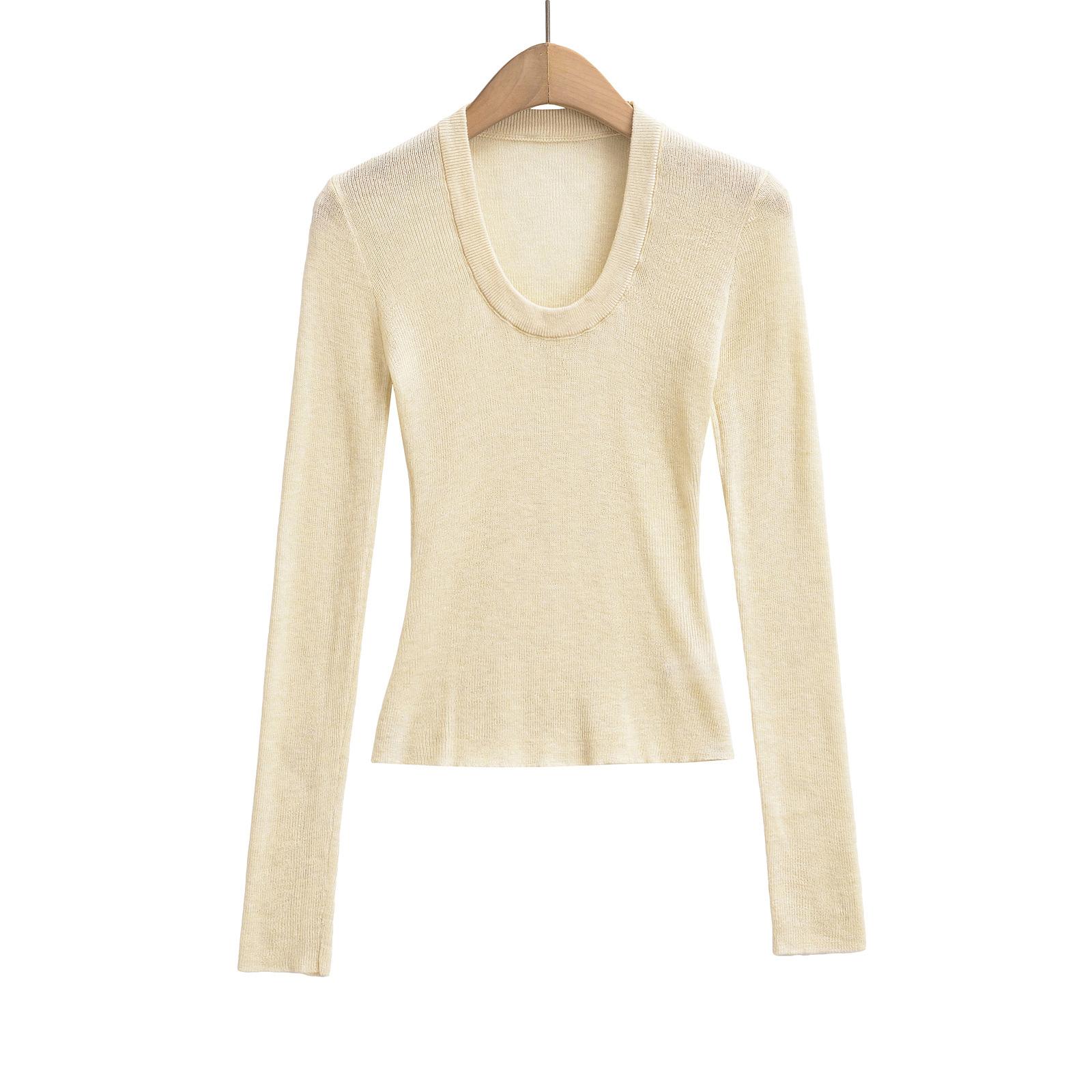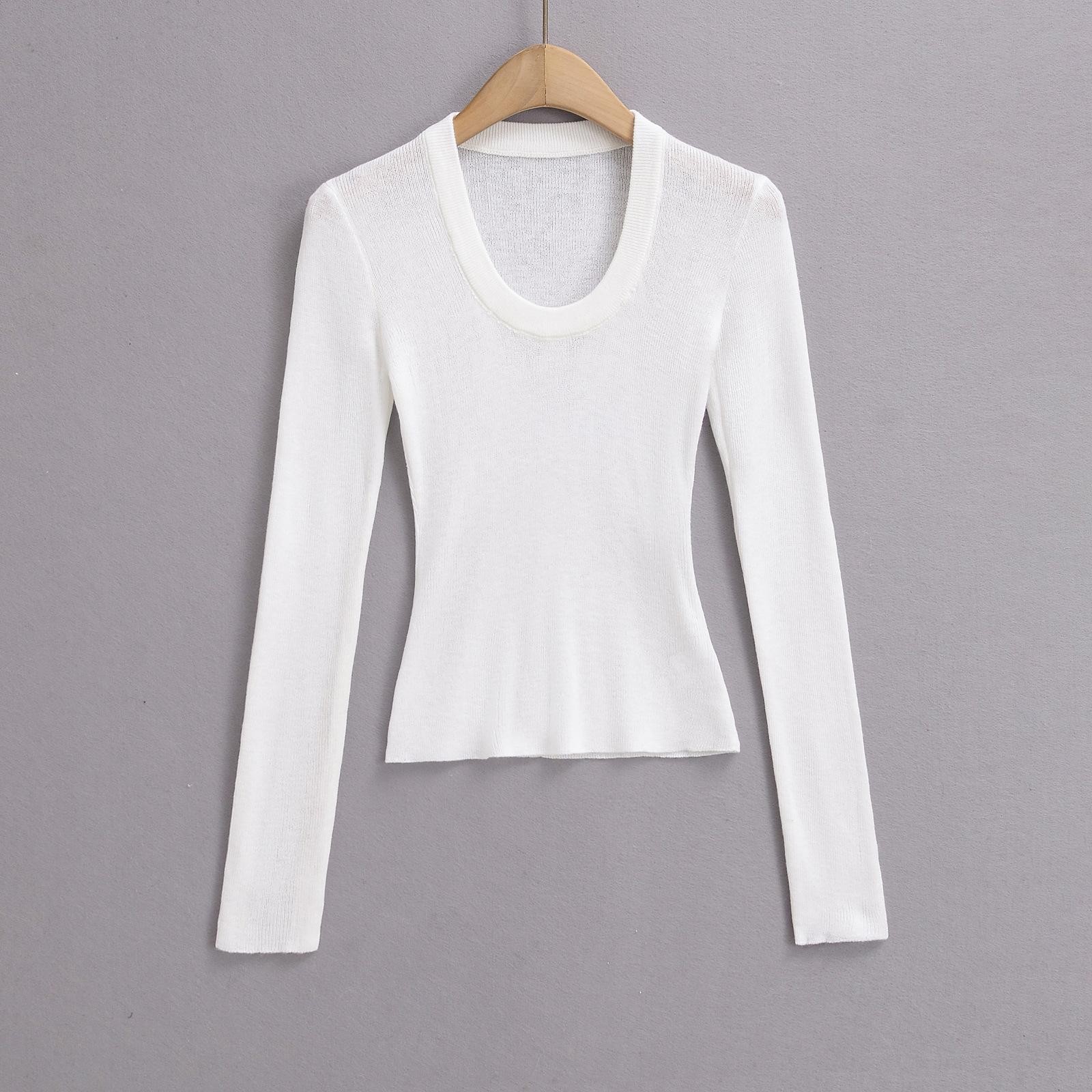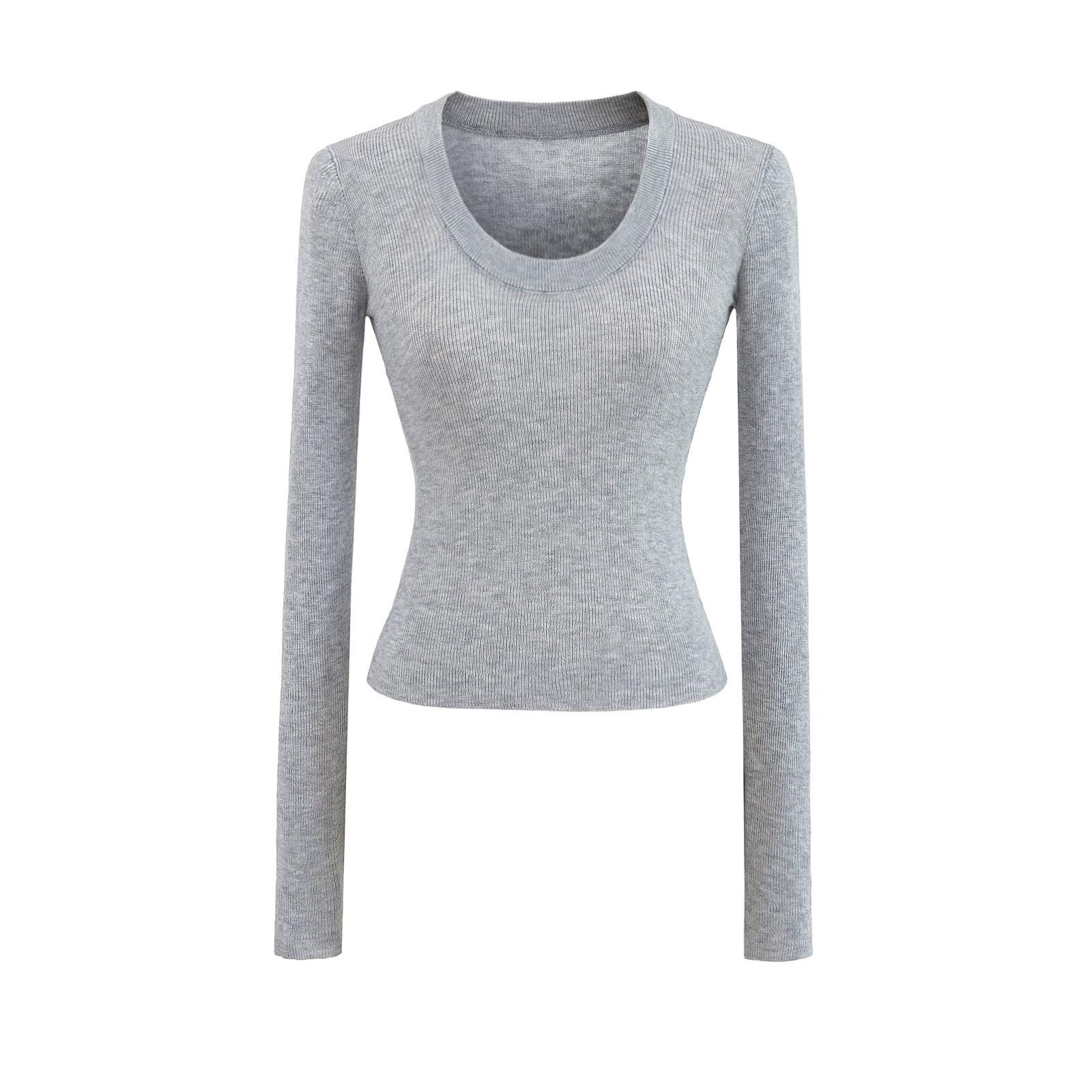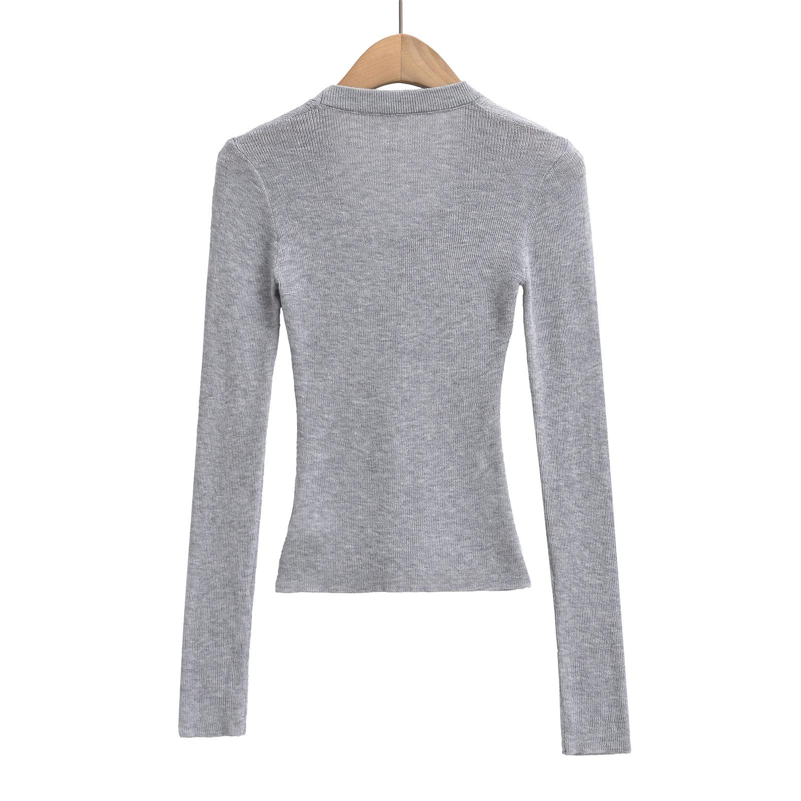 25030-2025 Nueva Moda Sexy Manga Larga Tejido Camisa Chaqueta Mujer Cuello Redondo Francés Ajustado Cuello U Suéter