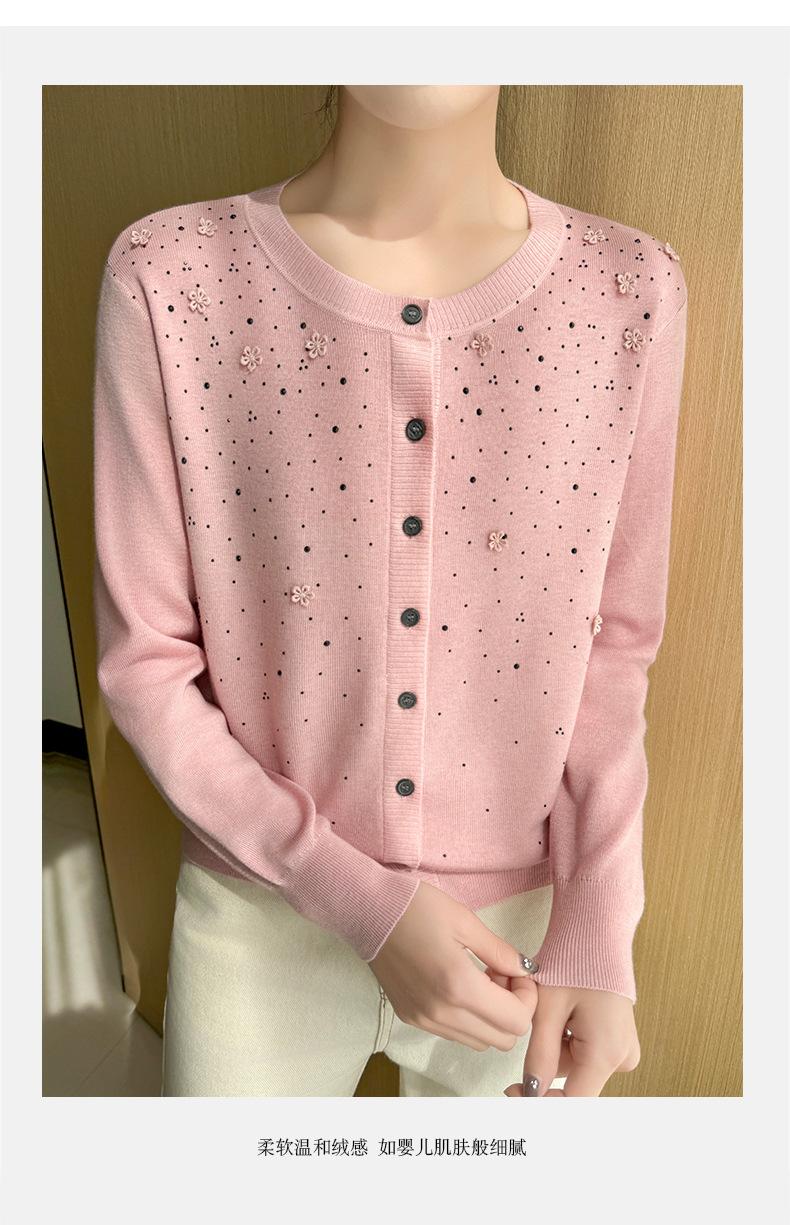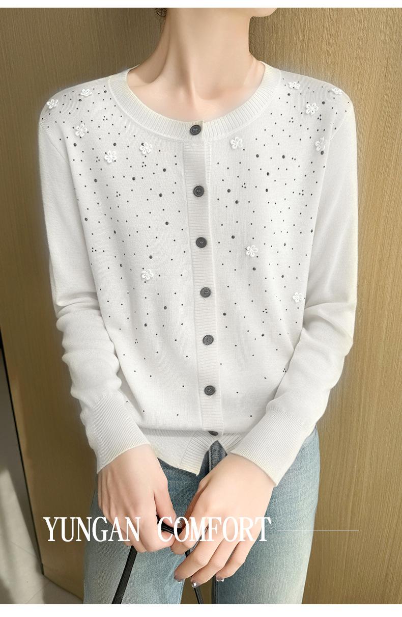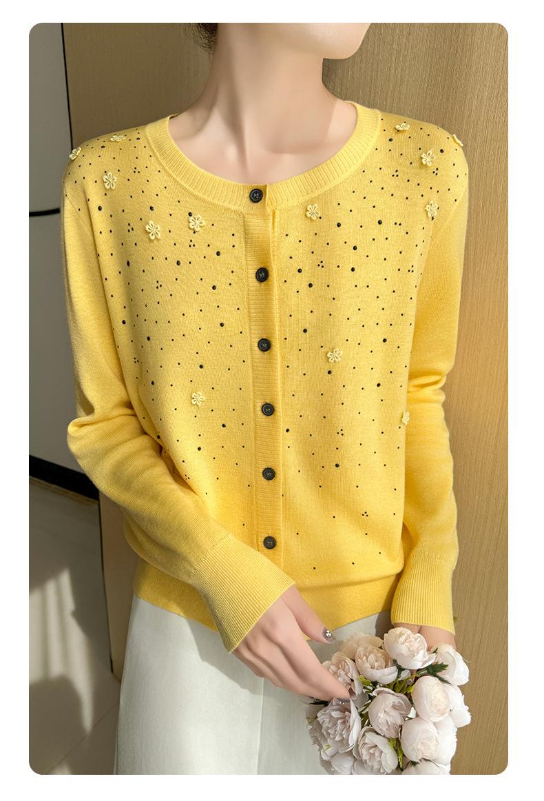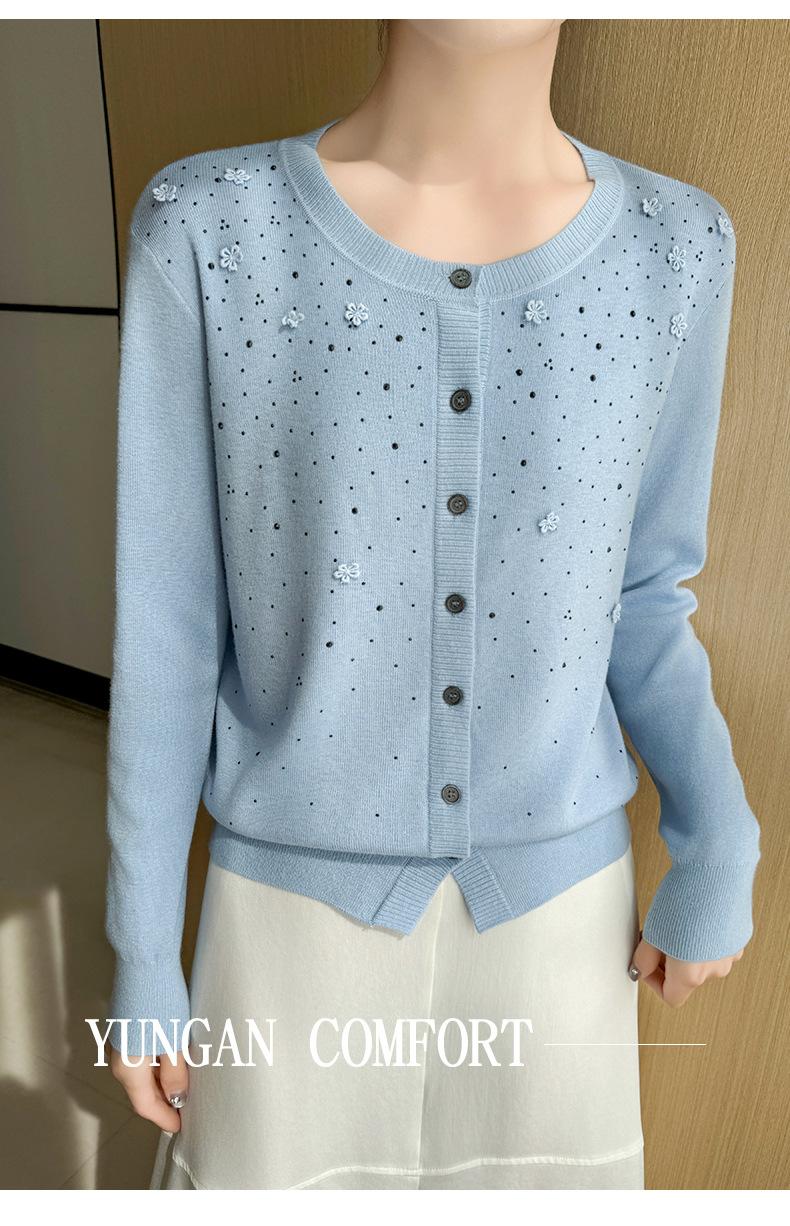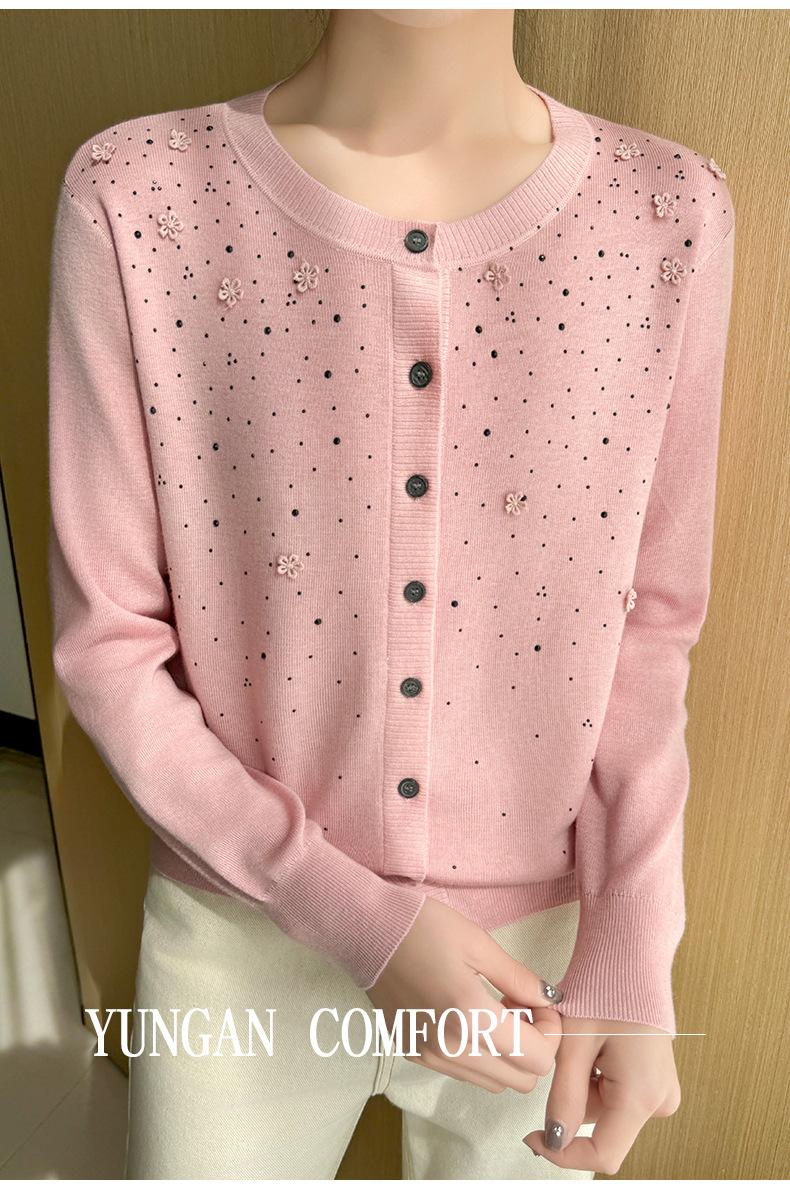 Cárdigan de Lana Fina Bordado Pesado para Mujer, Suéter Chaqueta de Punto de Manga Larga con Cuello Redondo y Pedrería, Top Holgado para Exterior