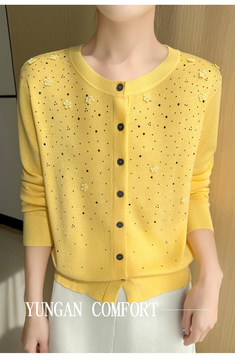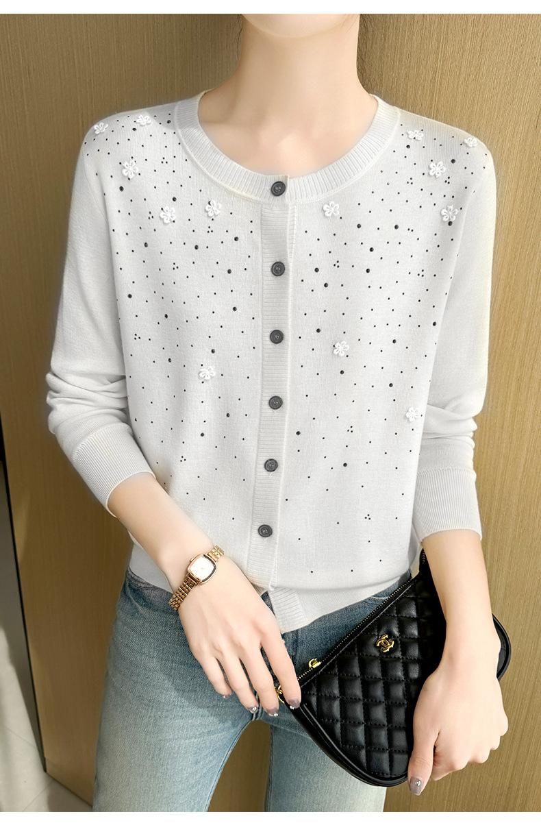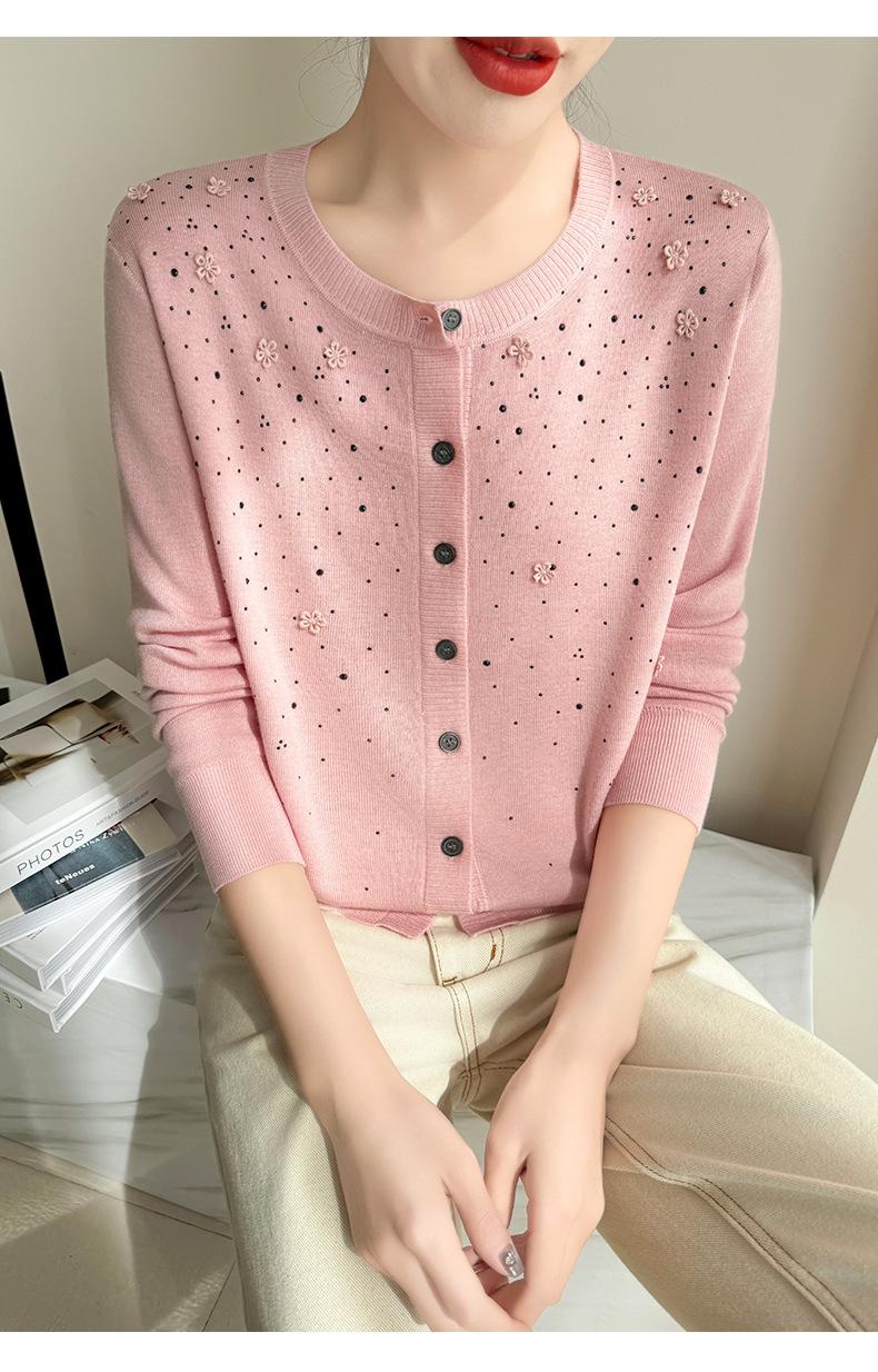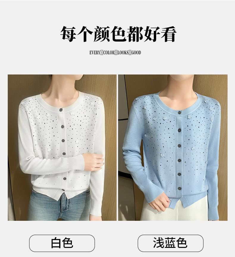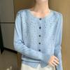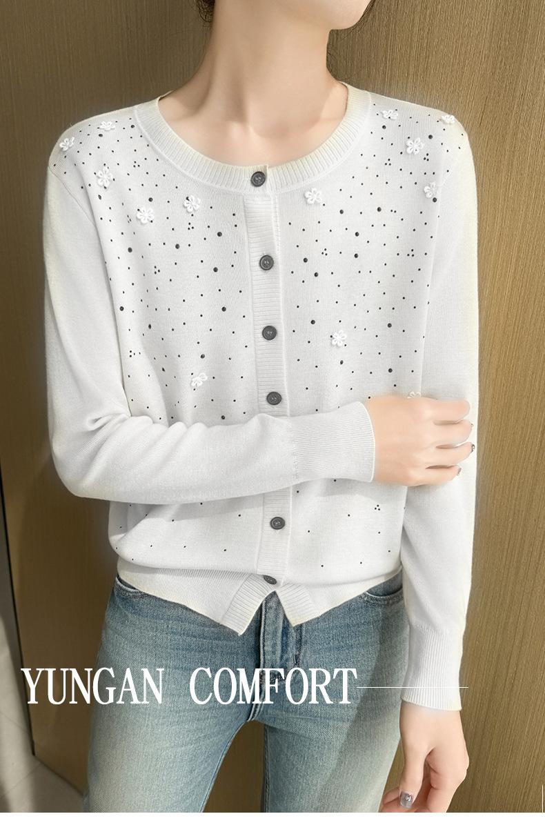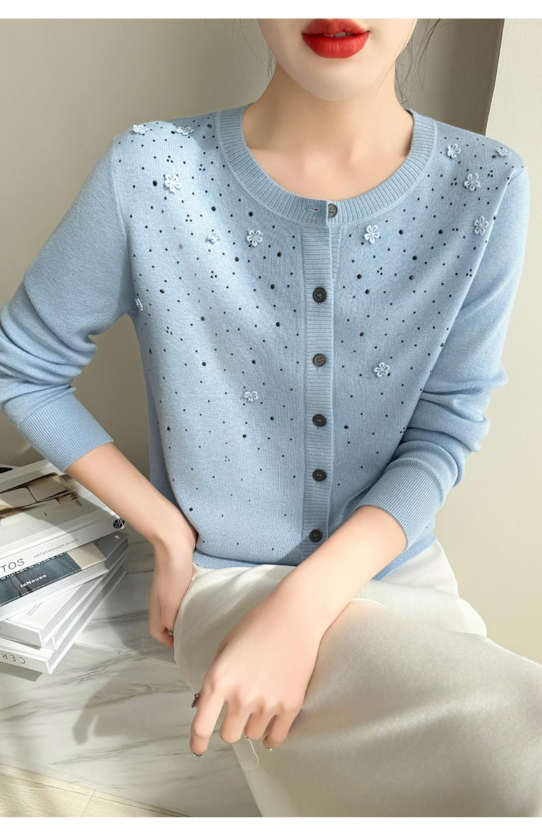 Cárdigan de Lana Fina Bordado Pesado para Mujer, Suéter Chaqueta de Punto de Manga Larga con Cuello Redondo y Pedrería, Top Holgado para Exterior
