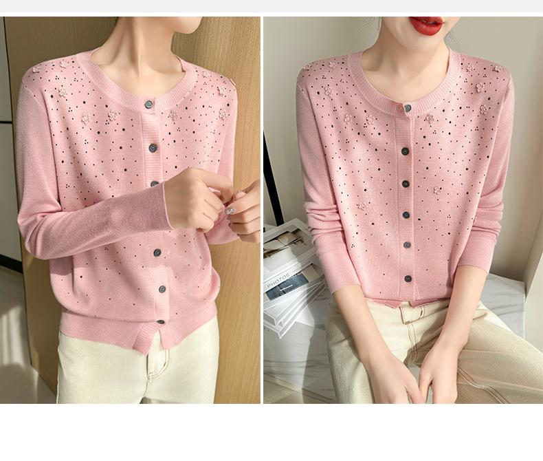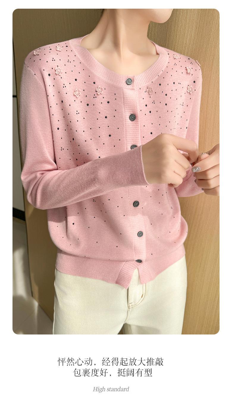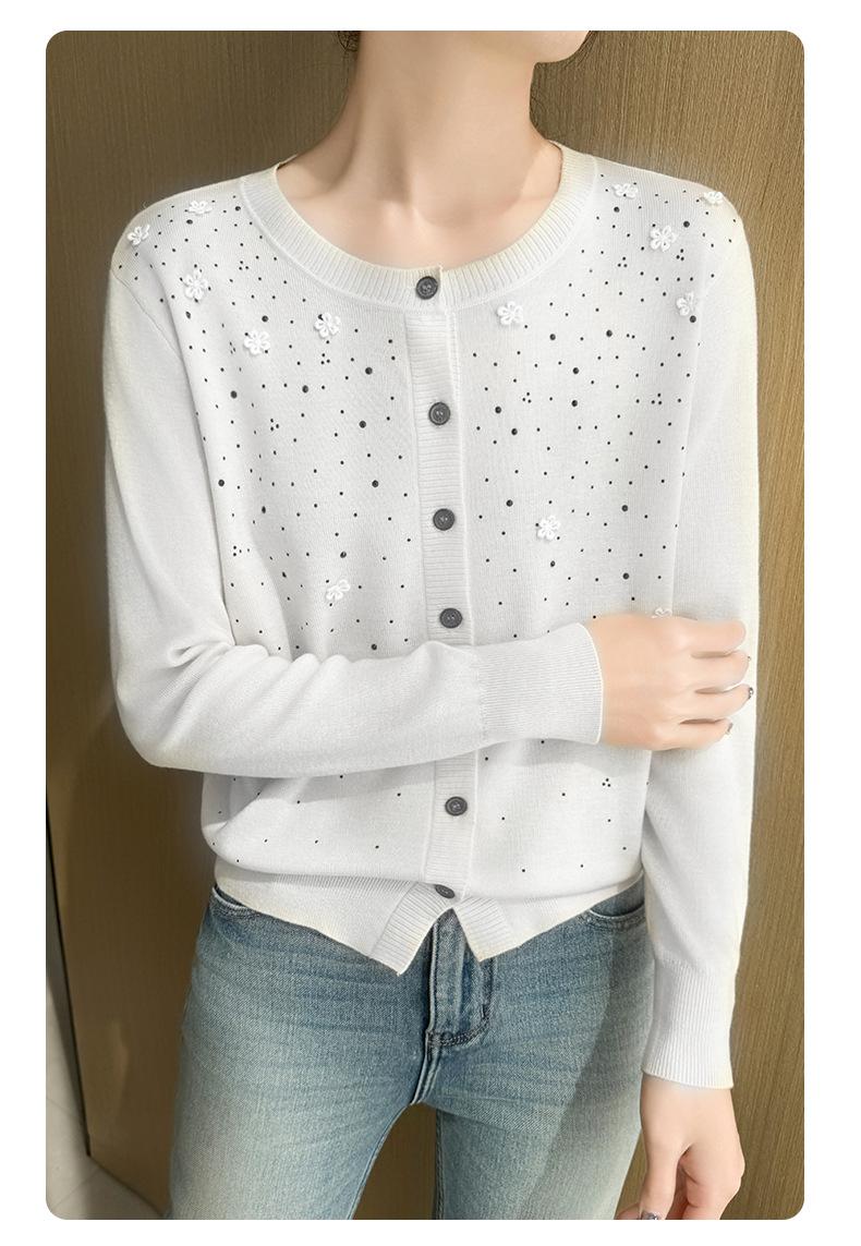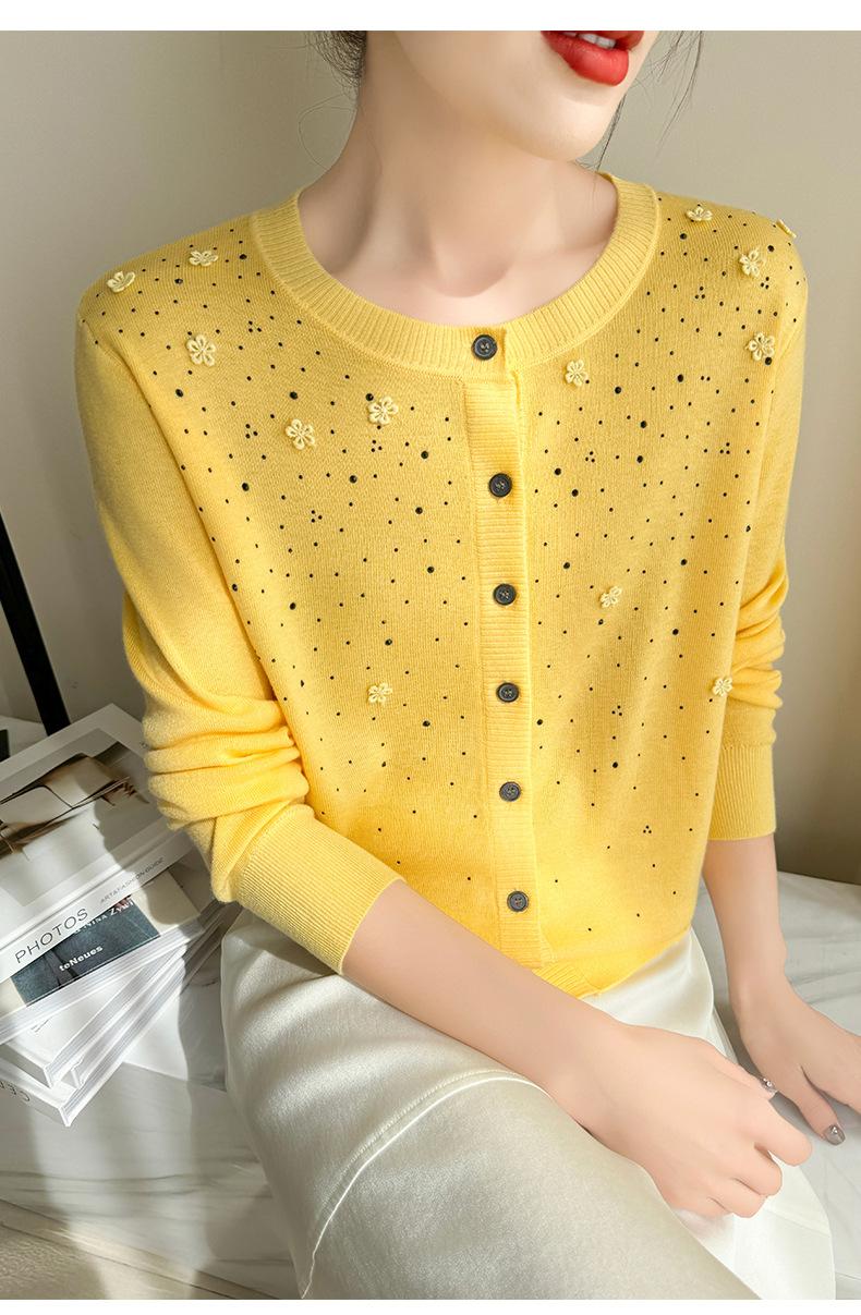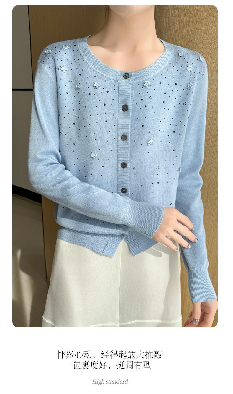 Cárdigan de Lana Fina Bordado Pesado para Mujer, Suéter Chaqueta de Punto de Manga Larga con Cuello Redondo y Pedrería, Top Holgado para Exterior