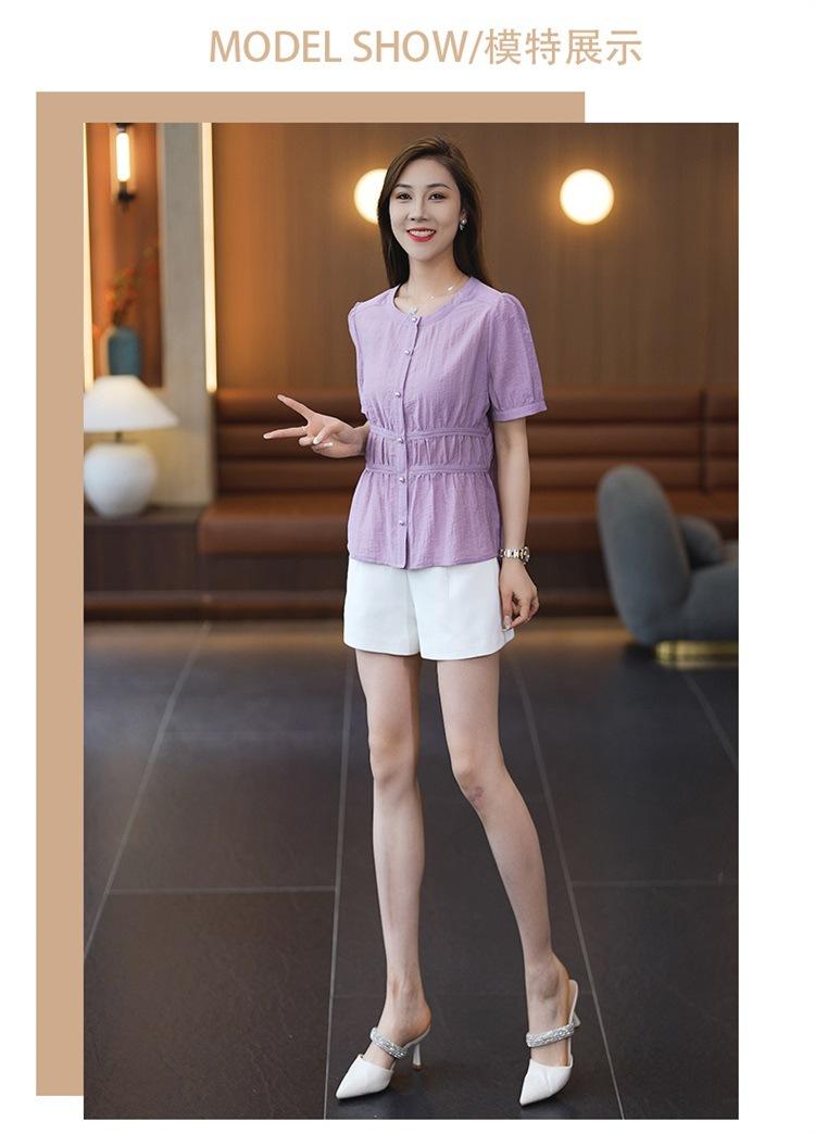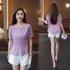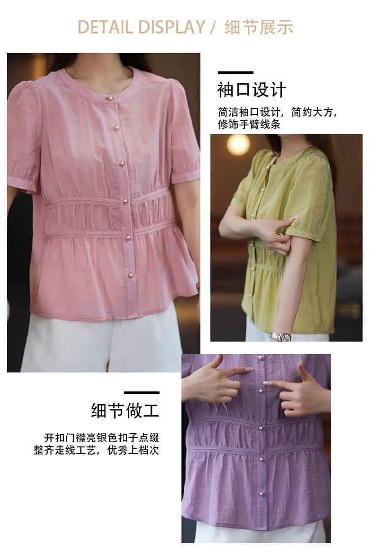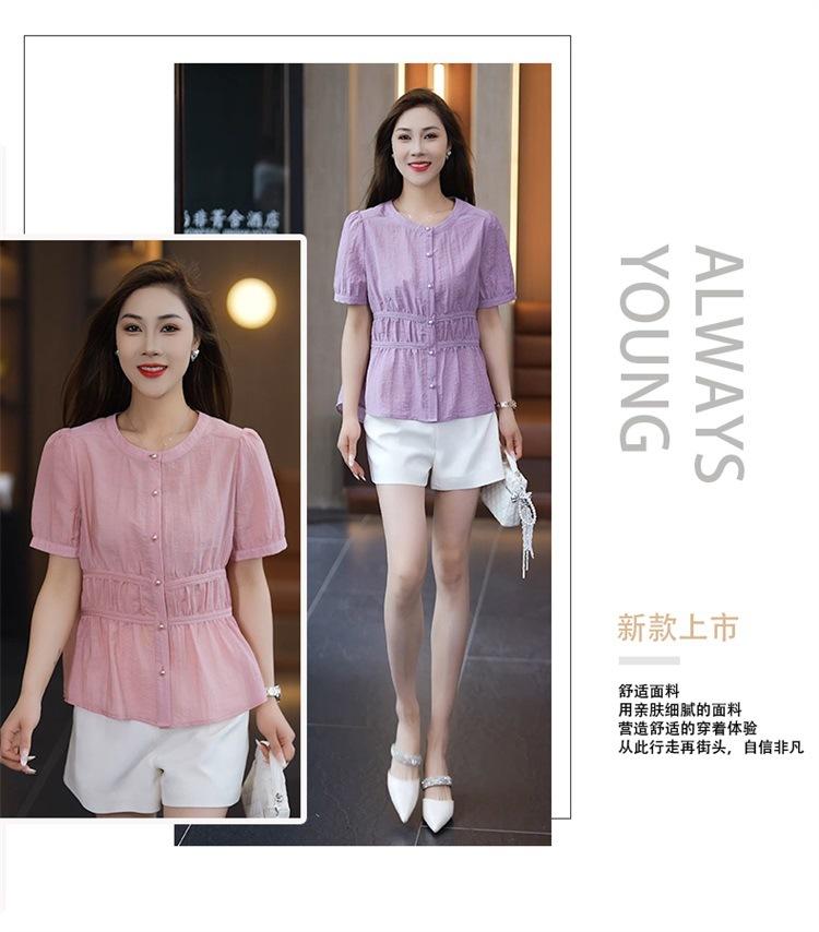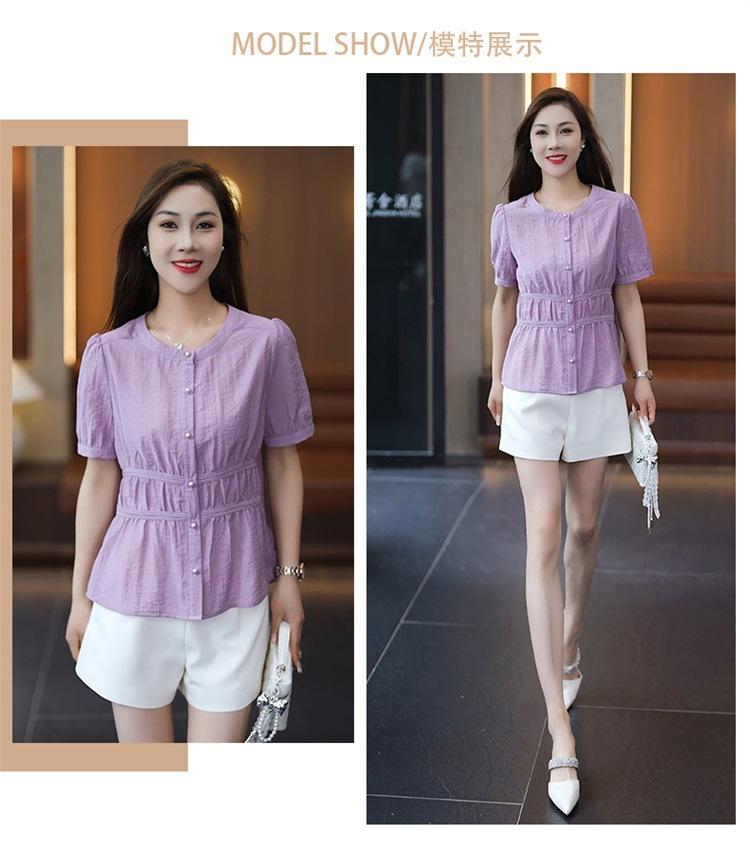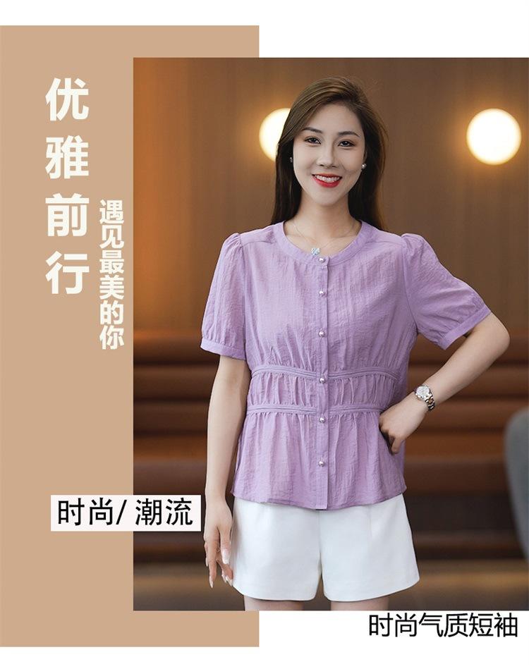 Ropa de Verano Nueva 2025, Camisa de Gasa Morada de Manga Corta de Talla Grande para Mujer, Holgada, Cubre Vientre, Aspecto Adelgazante, Reductor de Edad, Camisa Versátil