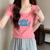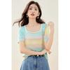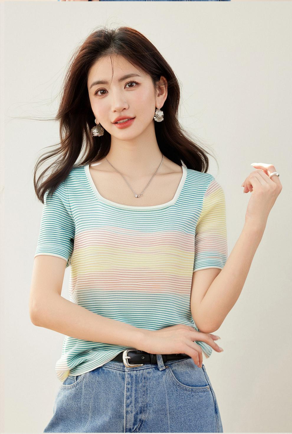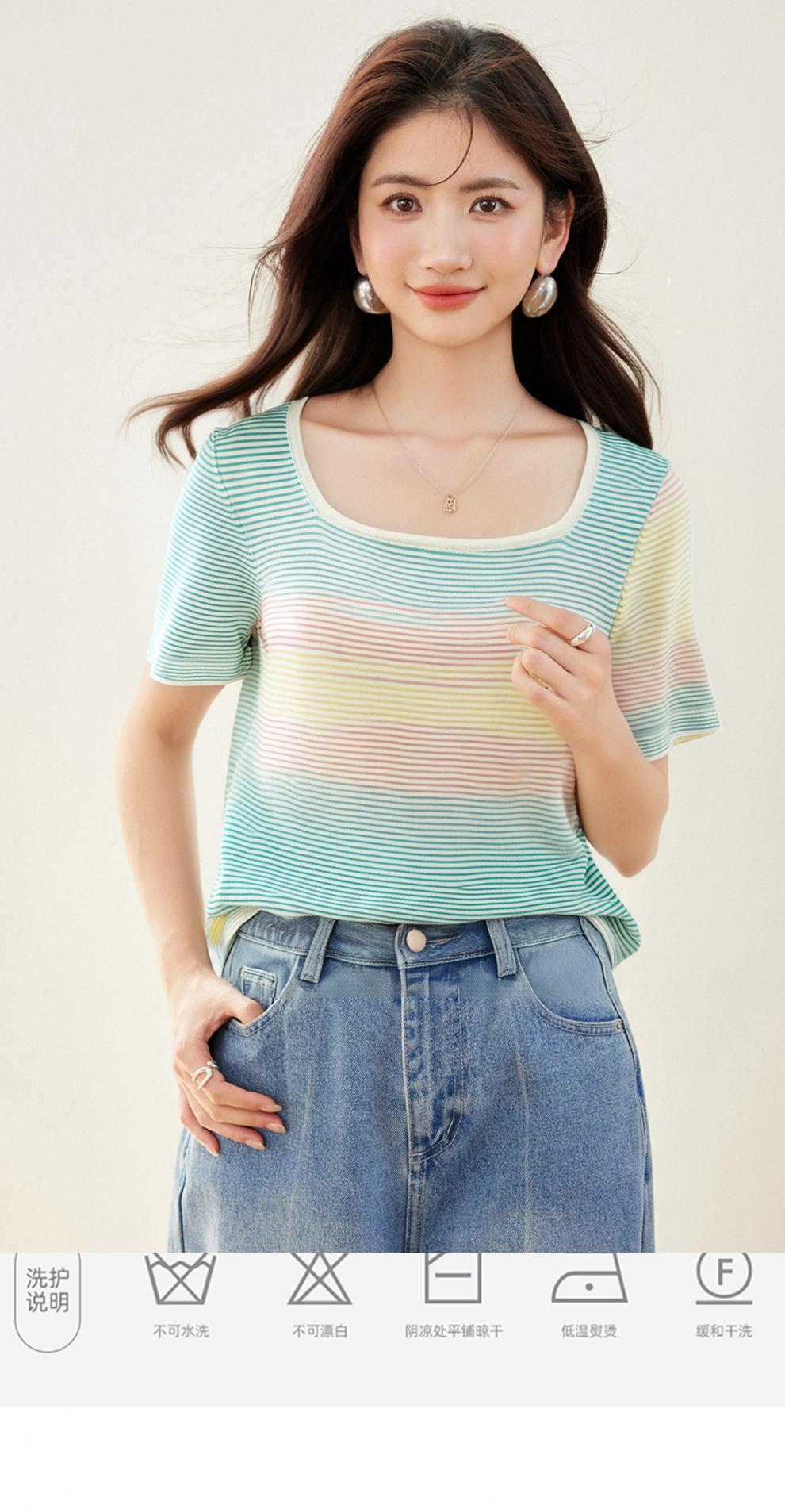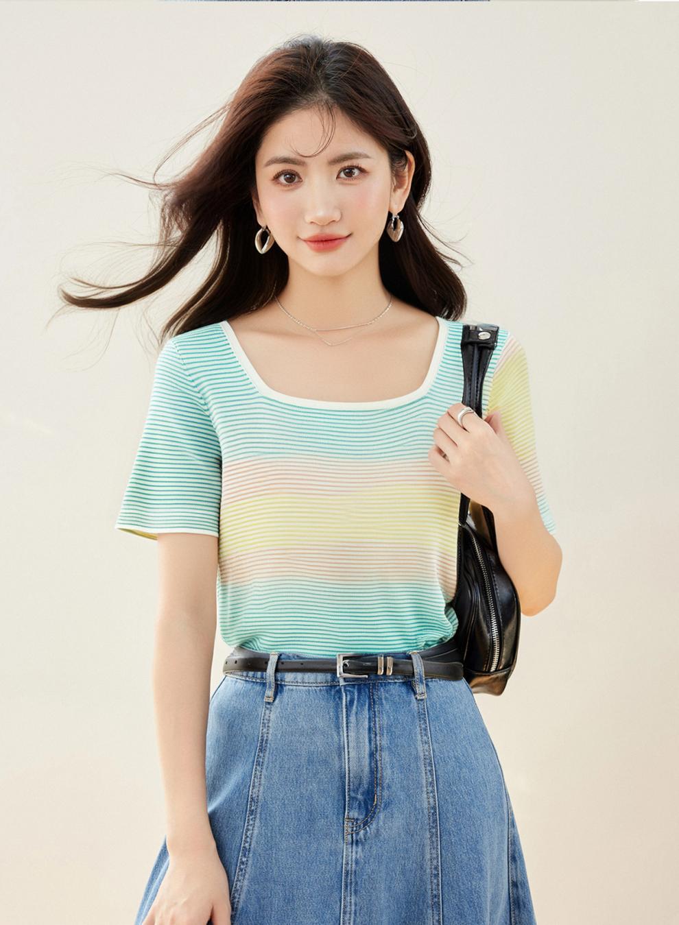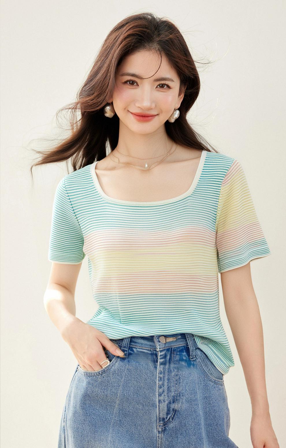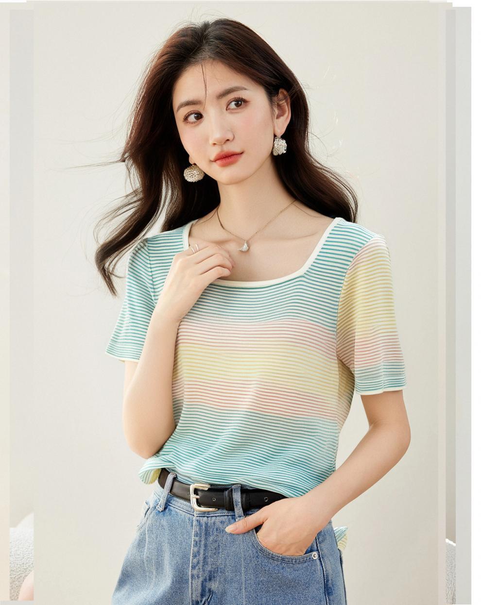Verano Nuevo Cuello Cuadrado Color Degradado Suelto Moda Manga Corta Slim Camiseta Tops para Mujer