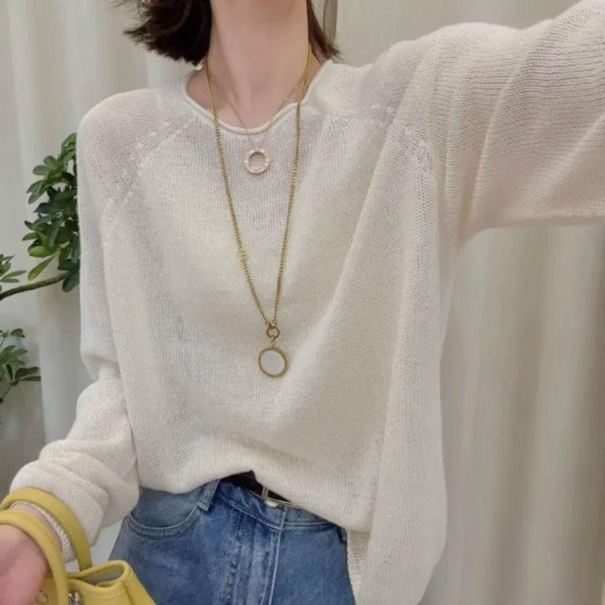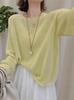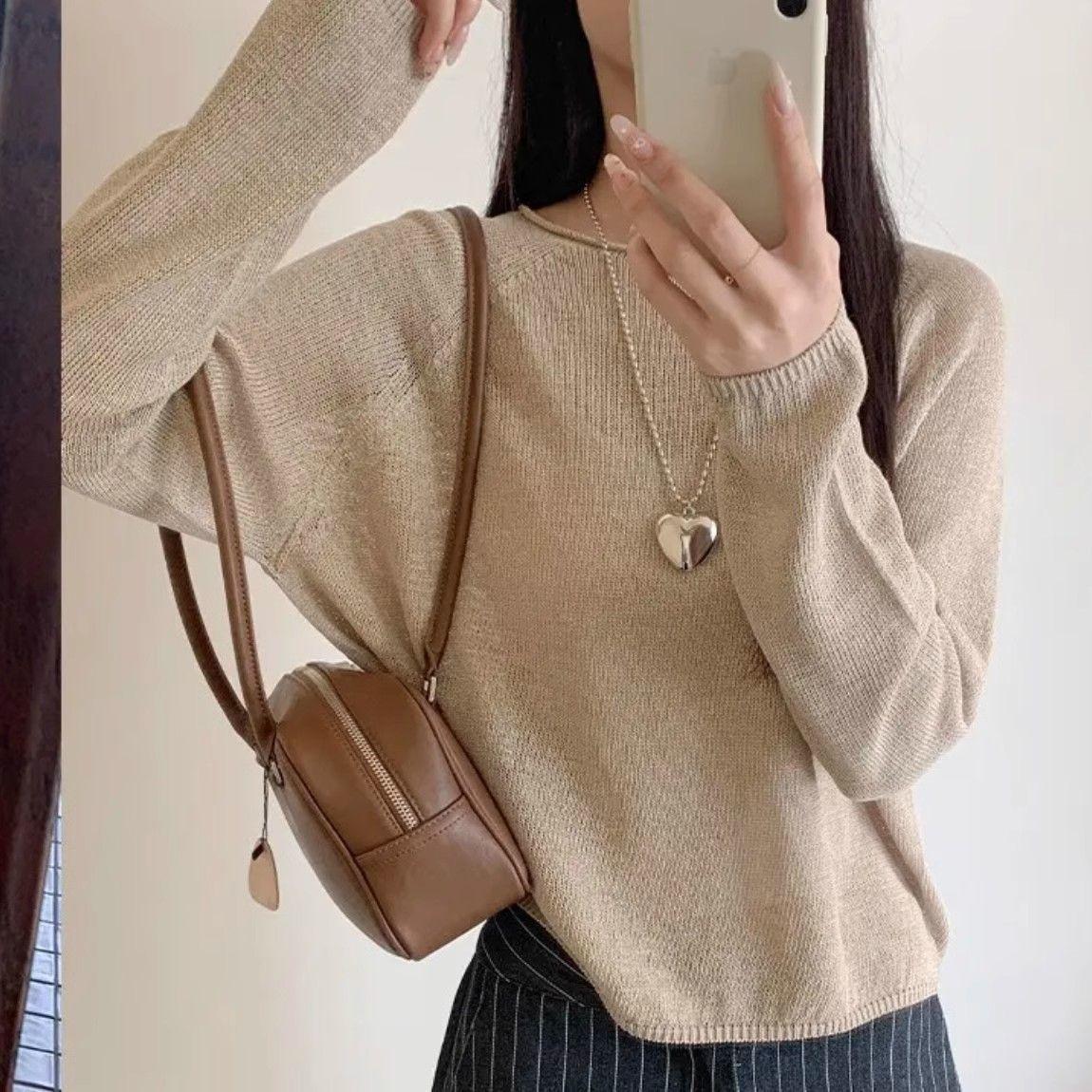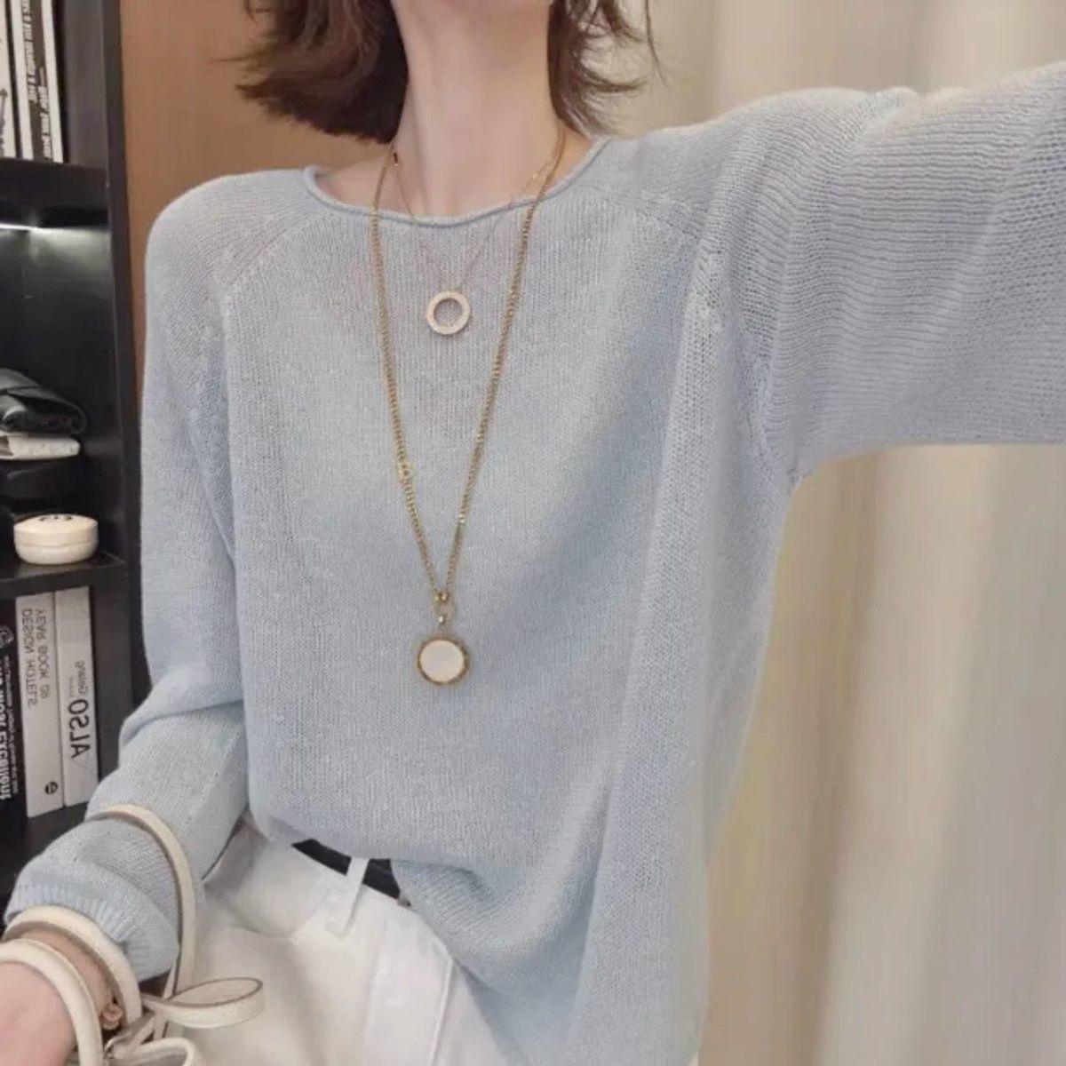 Tejido de punto de manga larga de color puro de alta gama estilo coreano a la moda para mujer 2025 verano nuevo cuello redondo blusa top protección solar