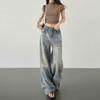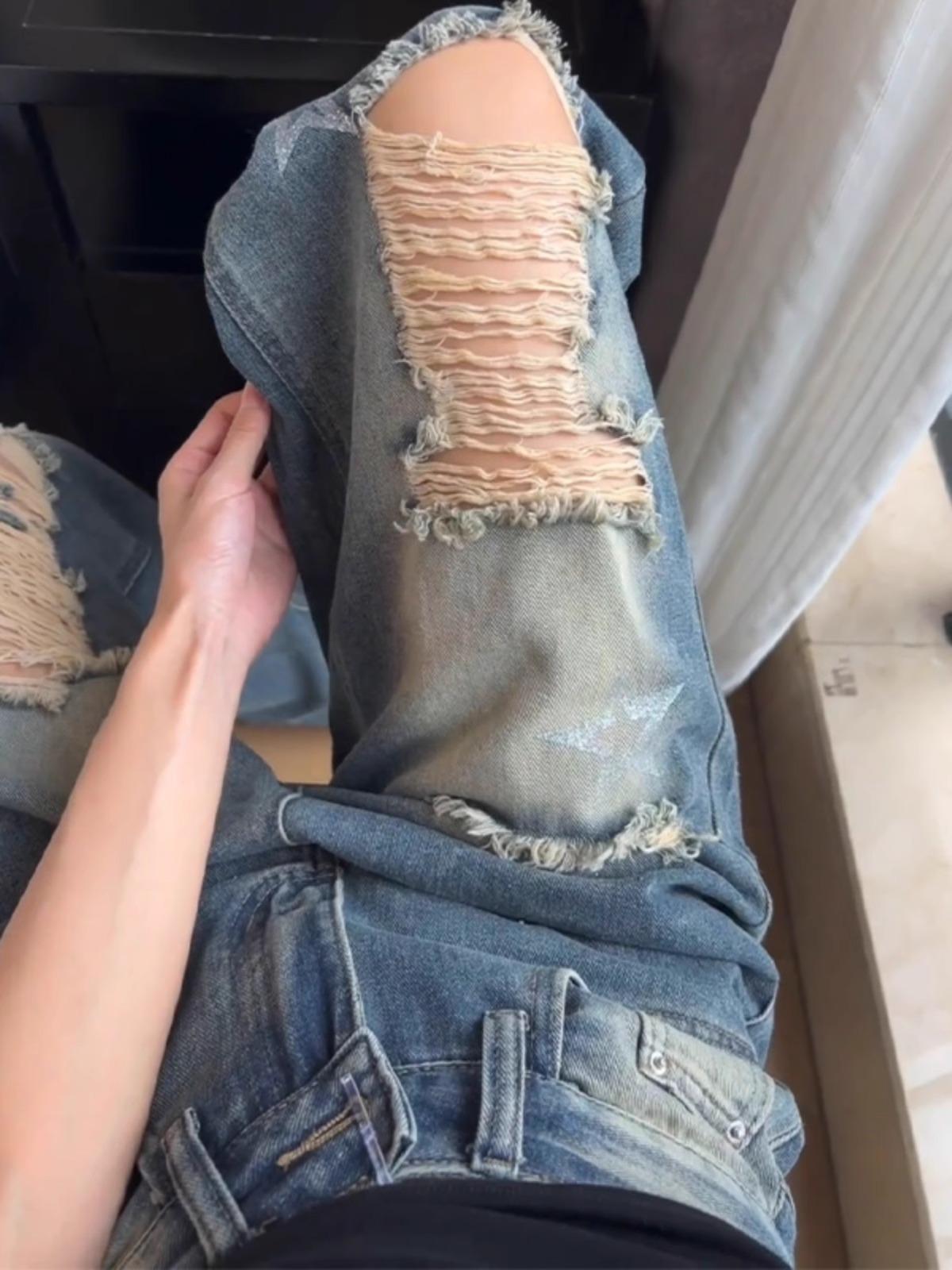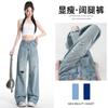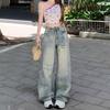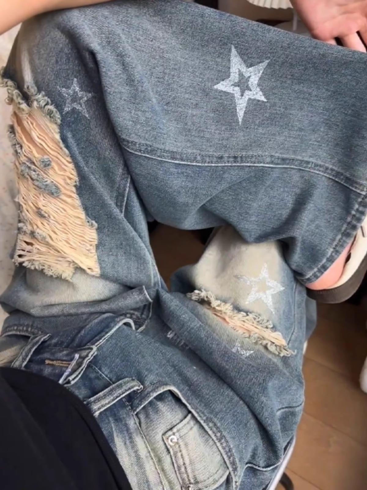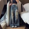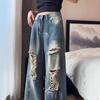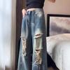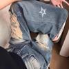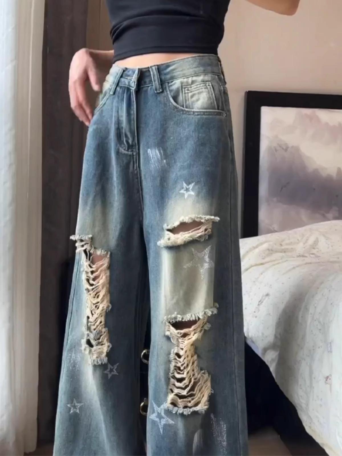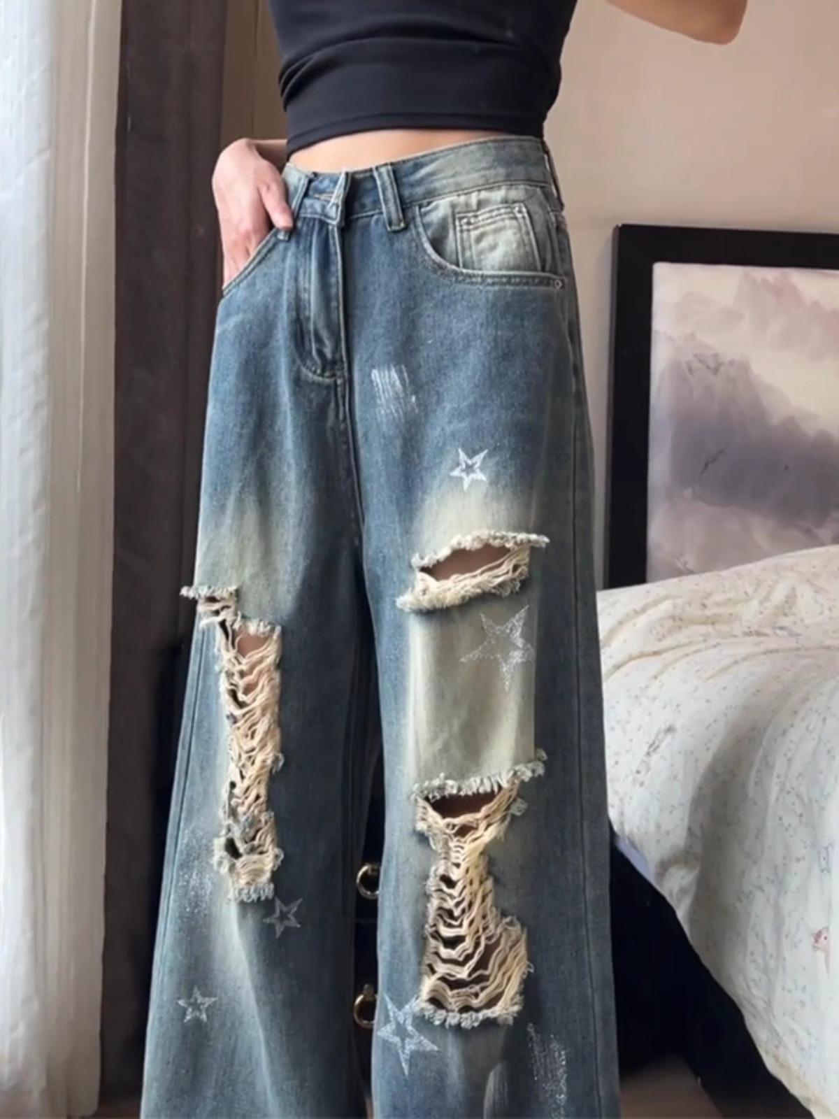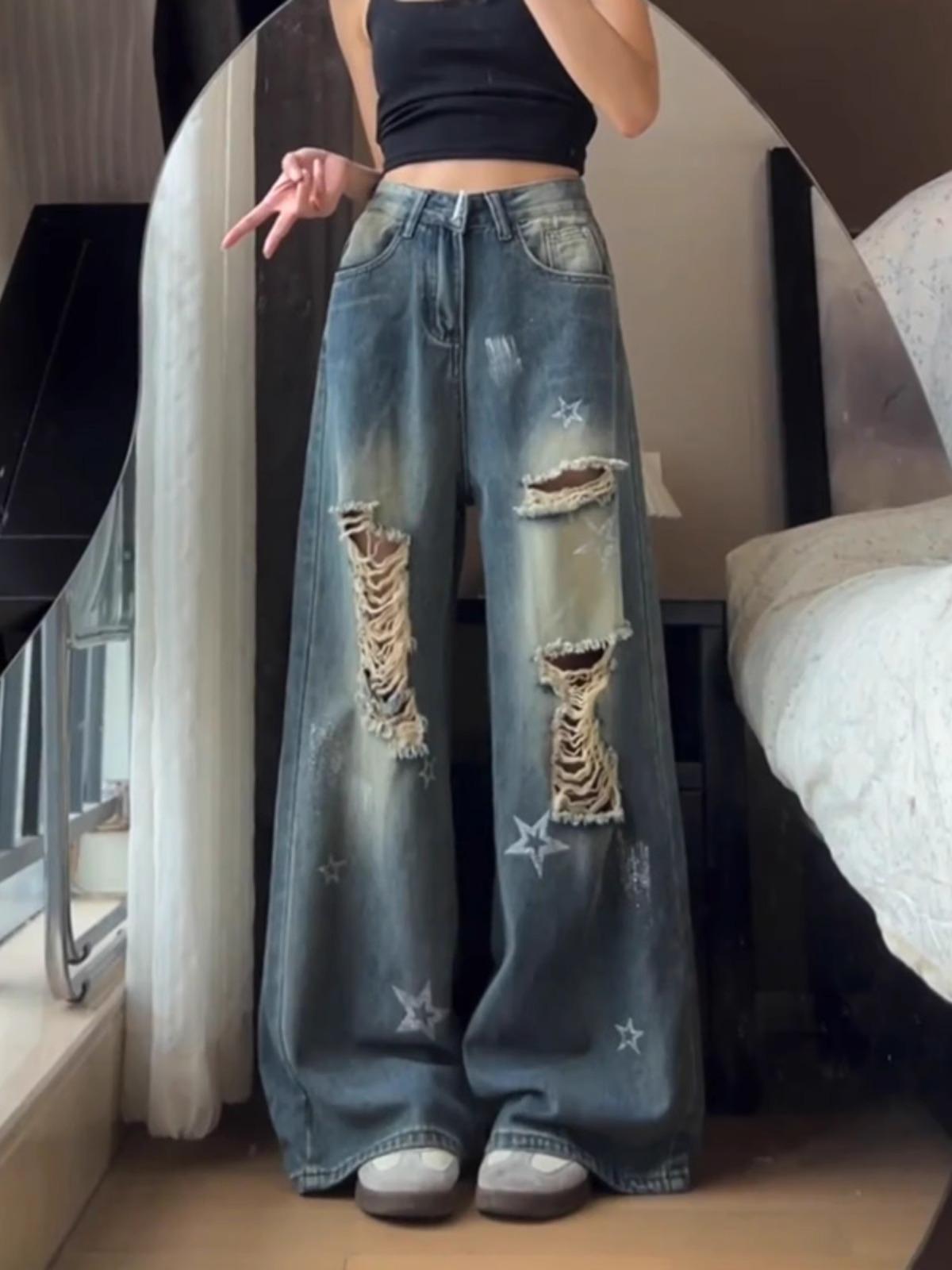 Jeans de Pierna Ancha Rotos con Estrella de Diseño para Mujer 2025 Verano Nuevo Americano Retro Cintura Alta Sueltos Rectos