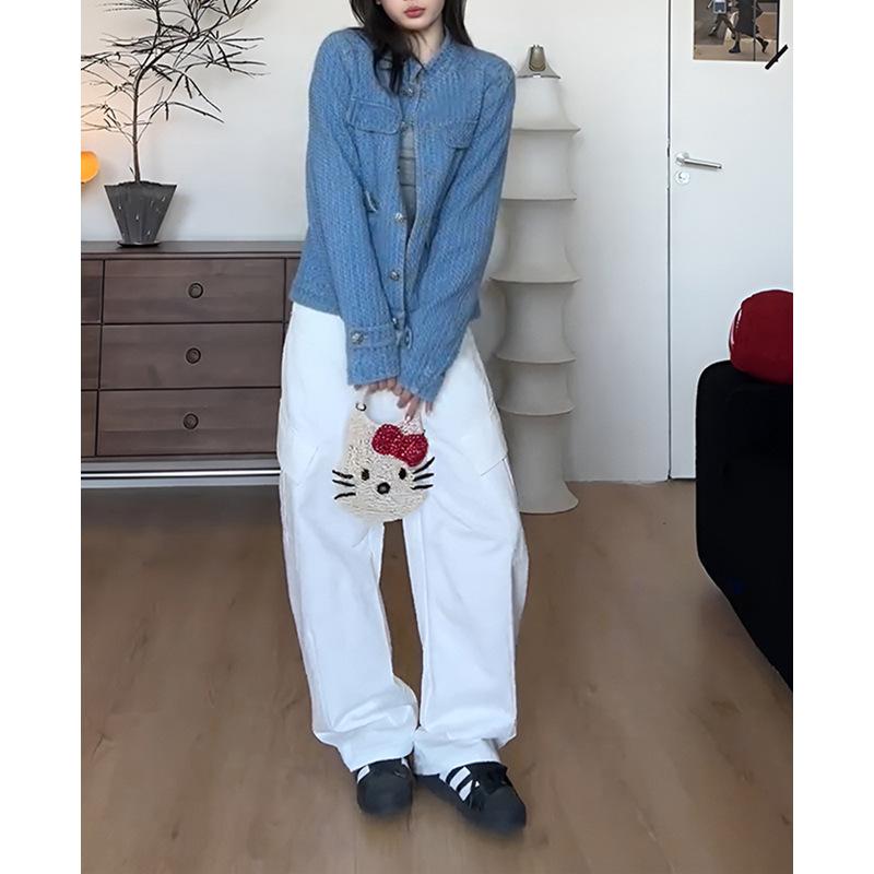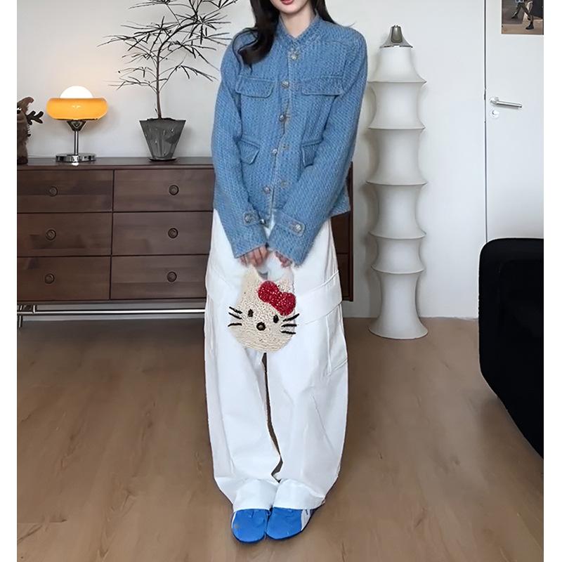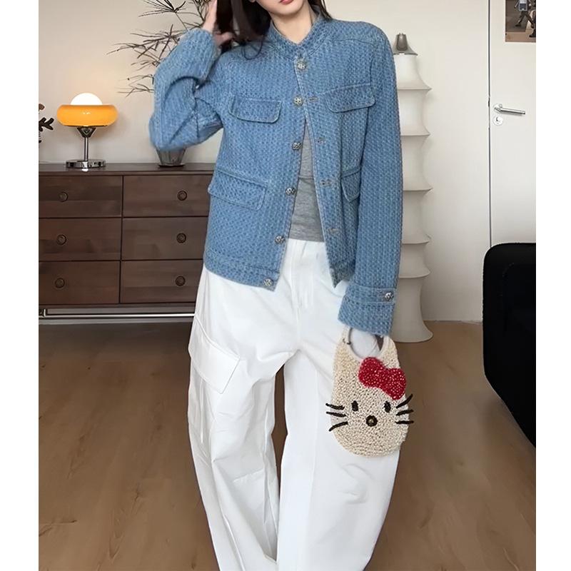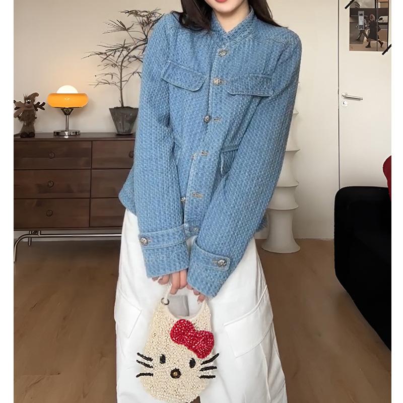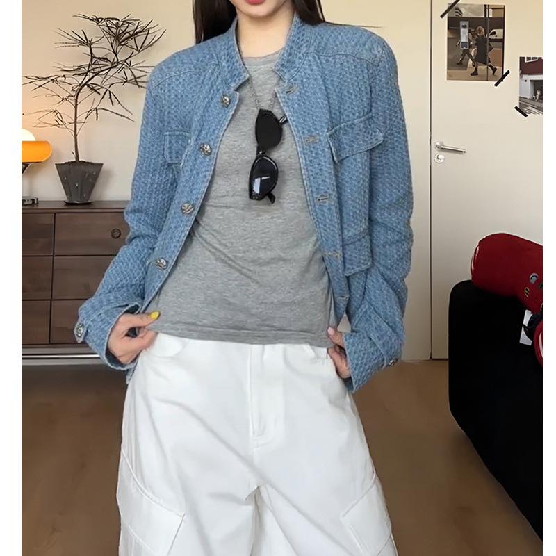 Tops de mezclilla estilo tweed Primavera y Otoño 2025 Casual Suelto Cuello alto Top corto Más fácil de combinar Ropa de mujer con temperamento
