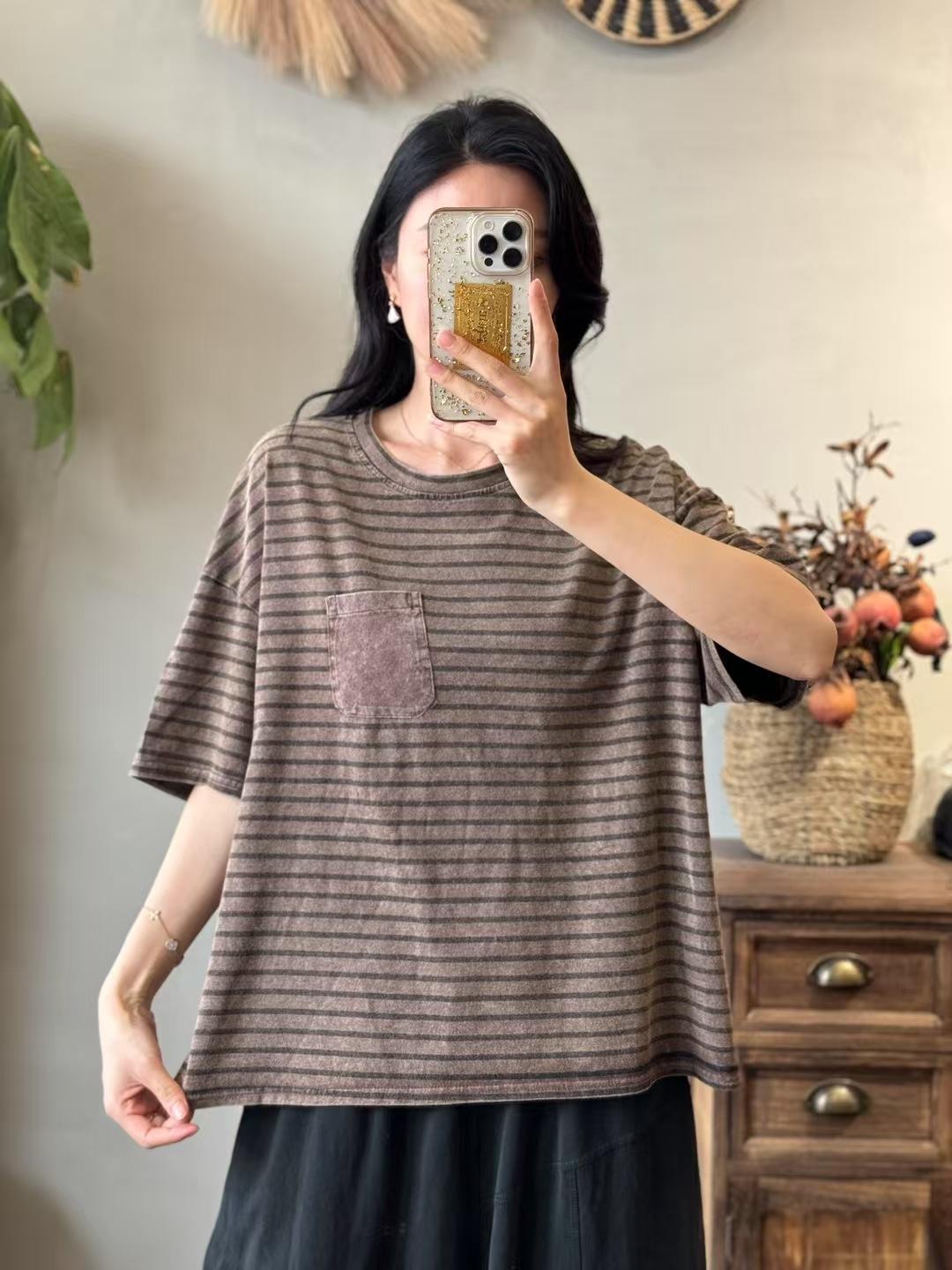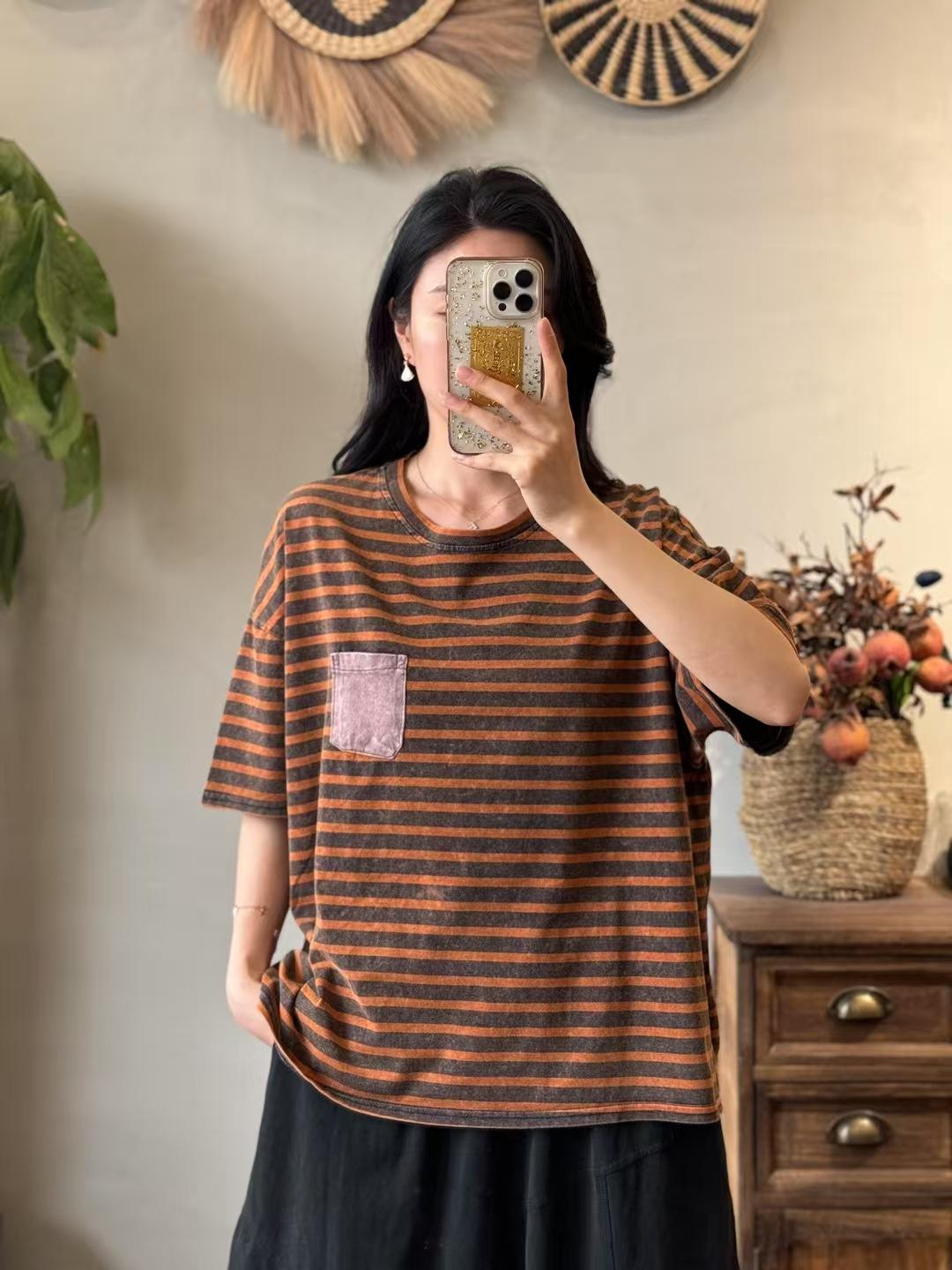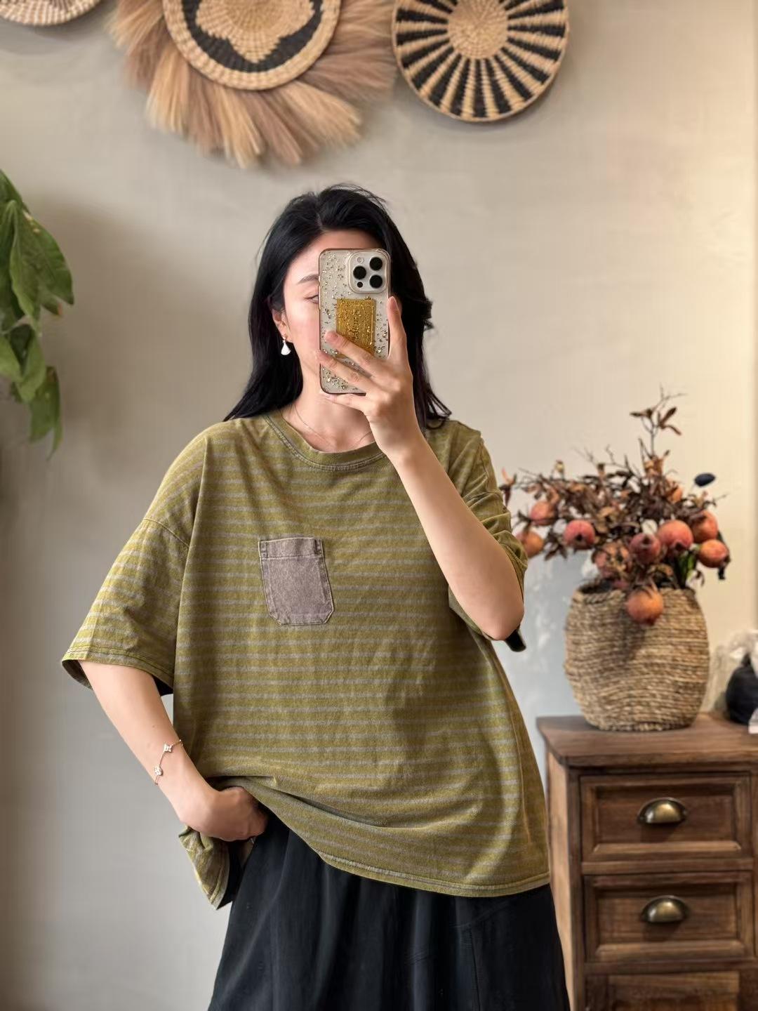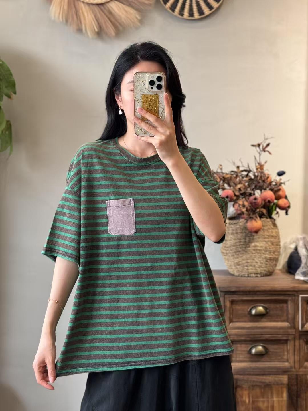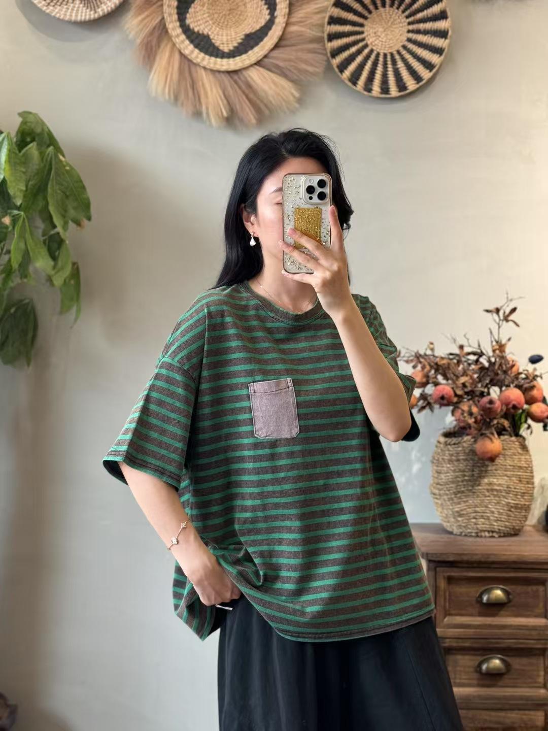 2025 Verano Nuevo Artístico Rayado Cuello Redondo Jersey Camiseta de Mujer con Bolsillo de Parche Holgada Adelgazante Manga Corta Top