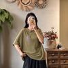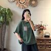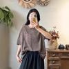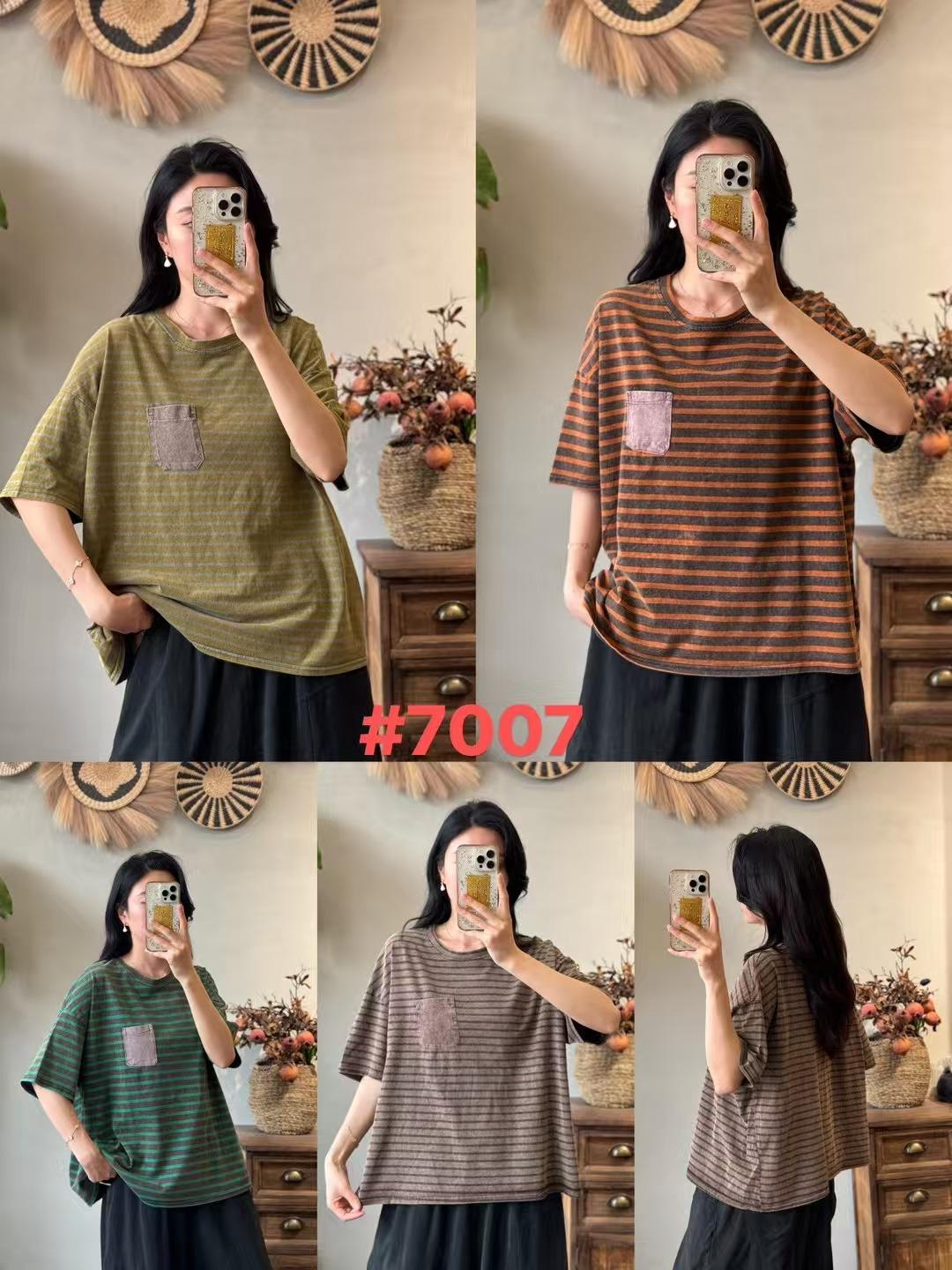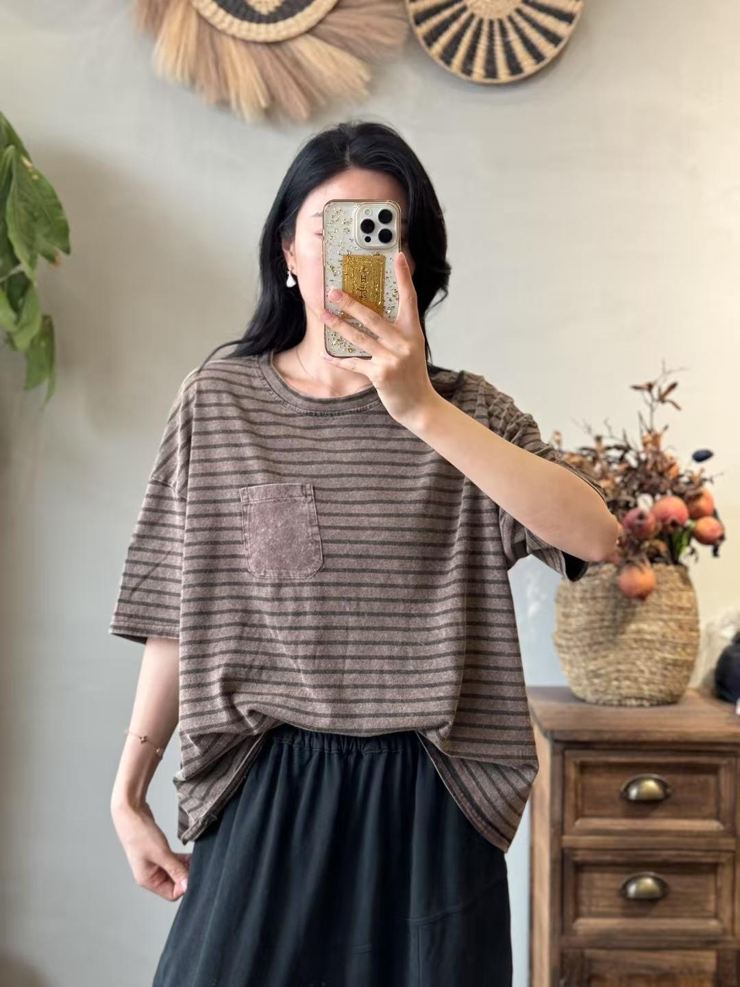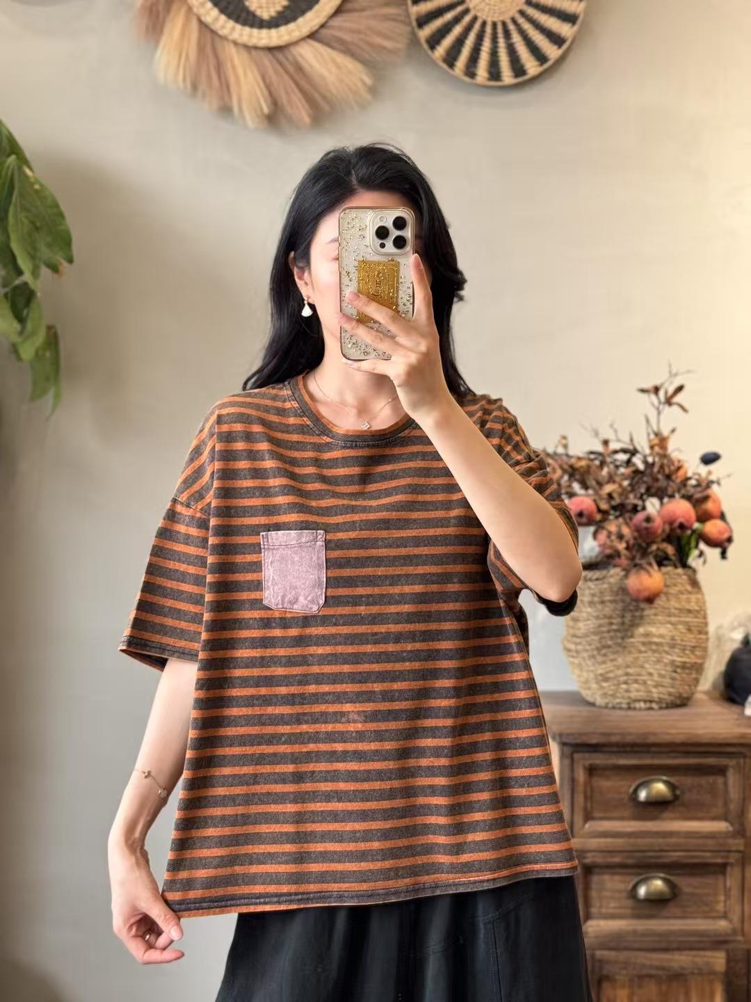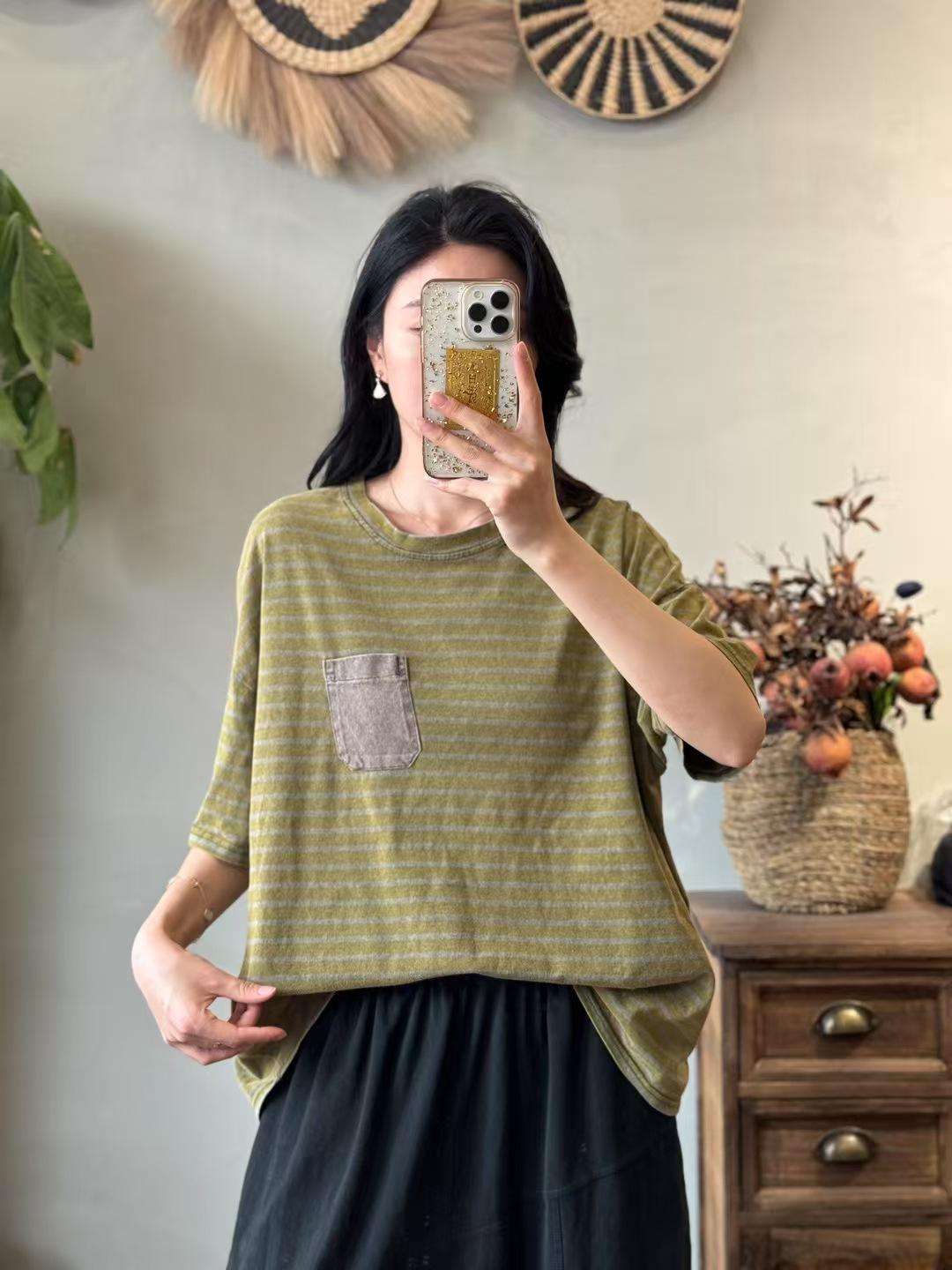 2025 Verano Nuevo Artístico Rayado Cuello Redondo Jersey Camiseta de Mujer con Bolsillo de Parche Holgada Adelgazante Manga Corta Top