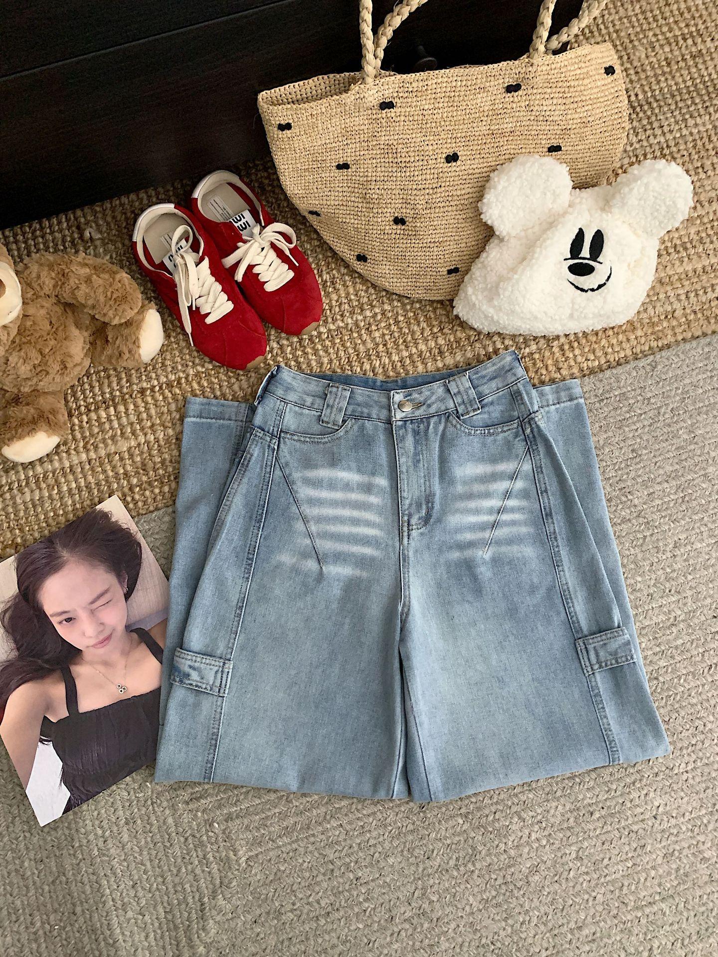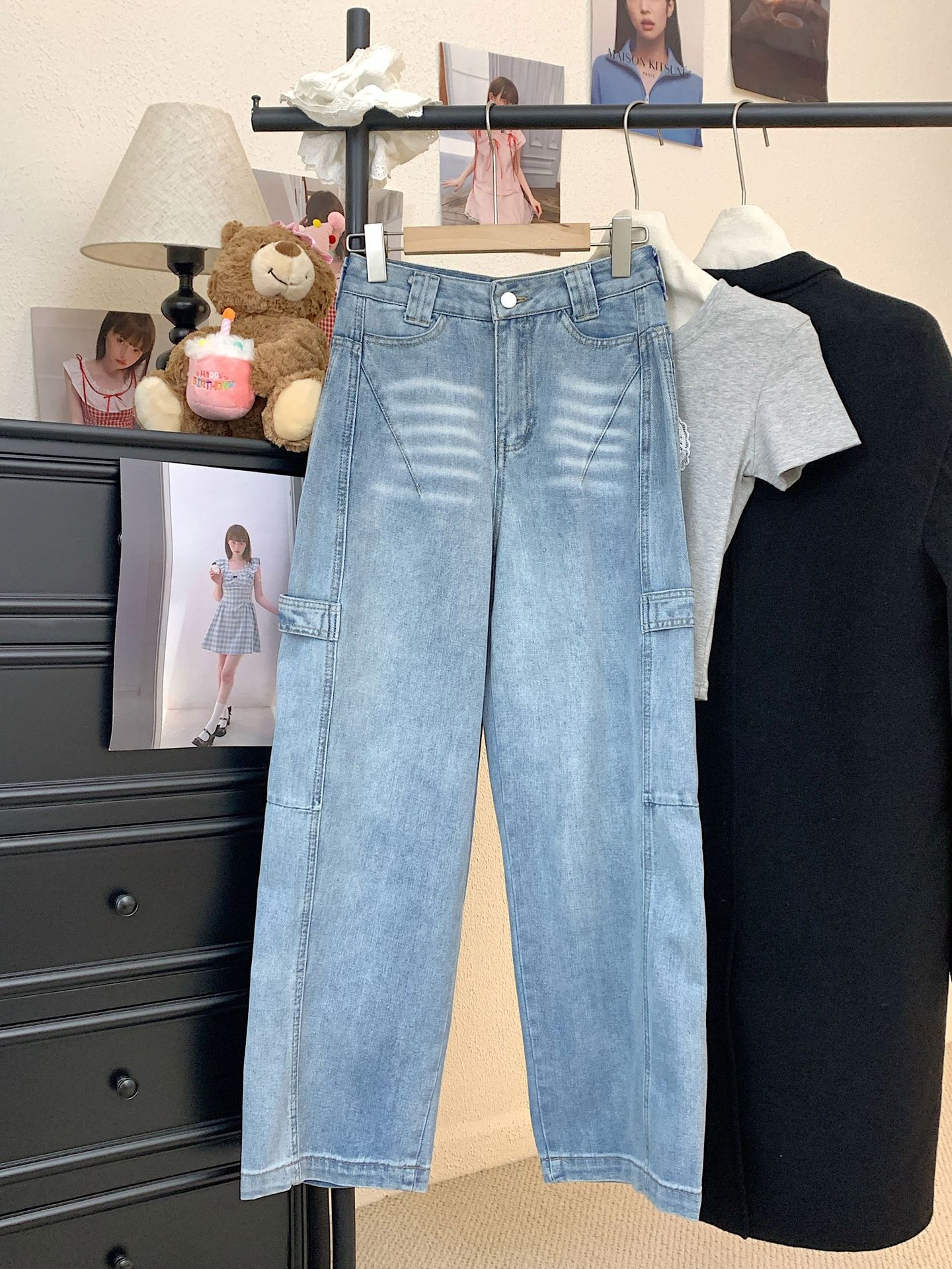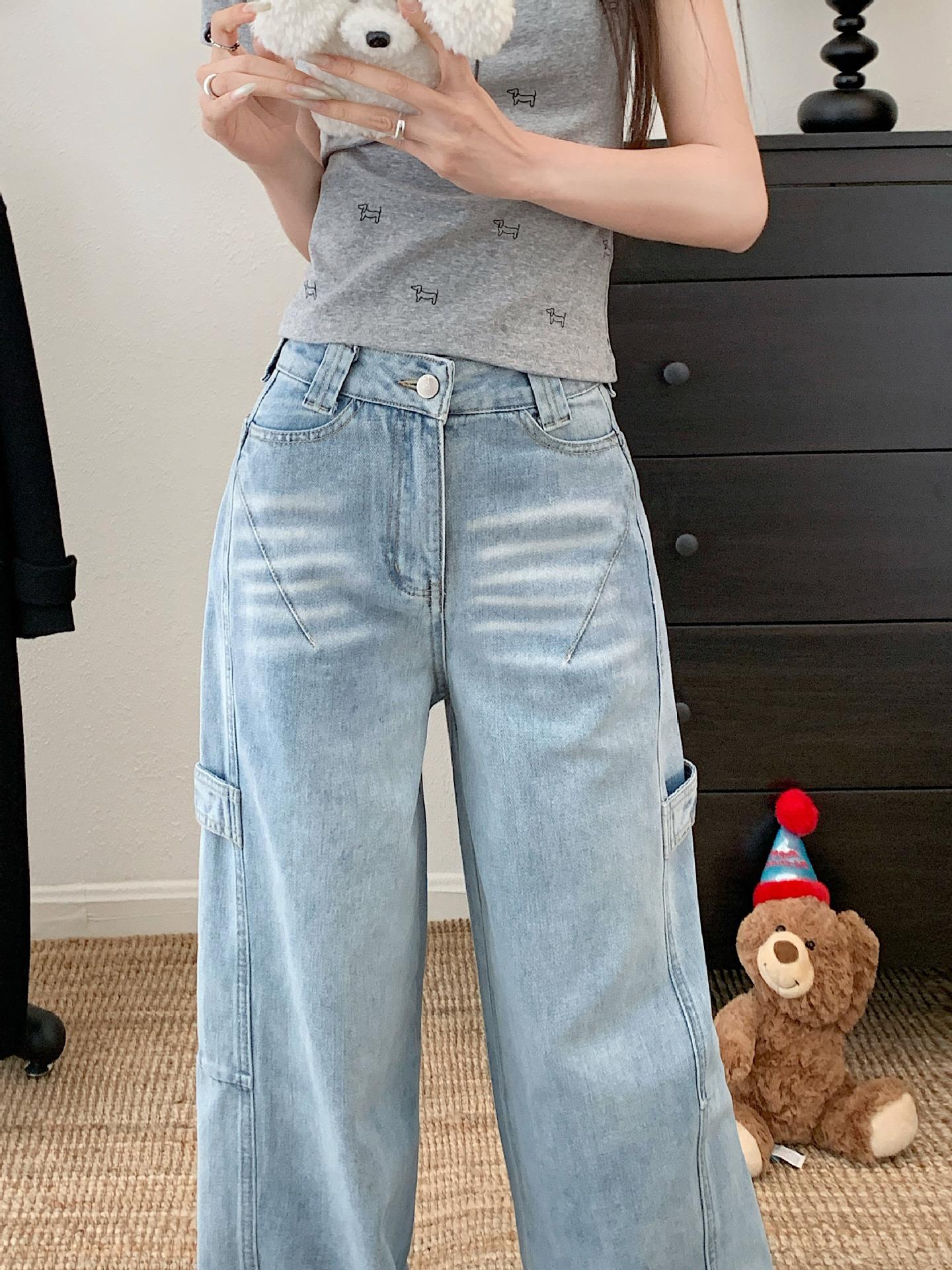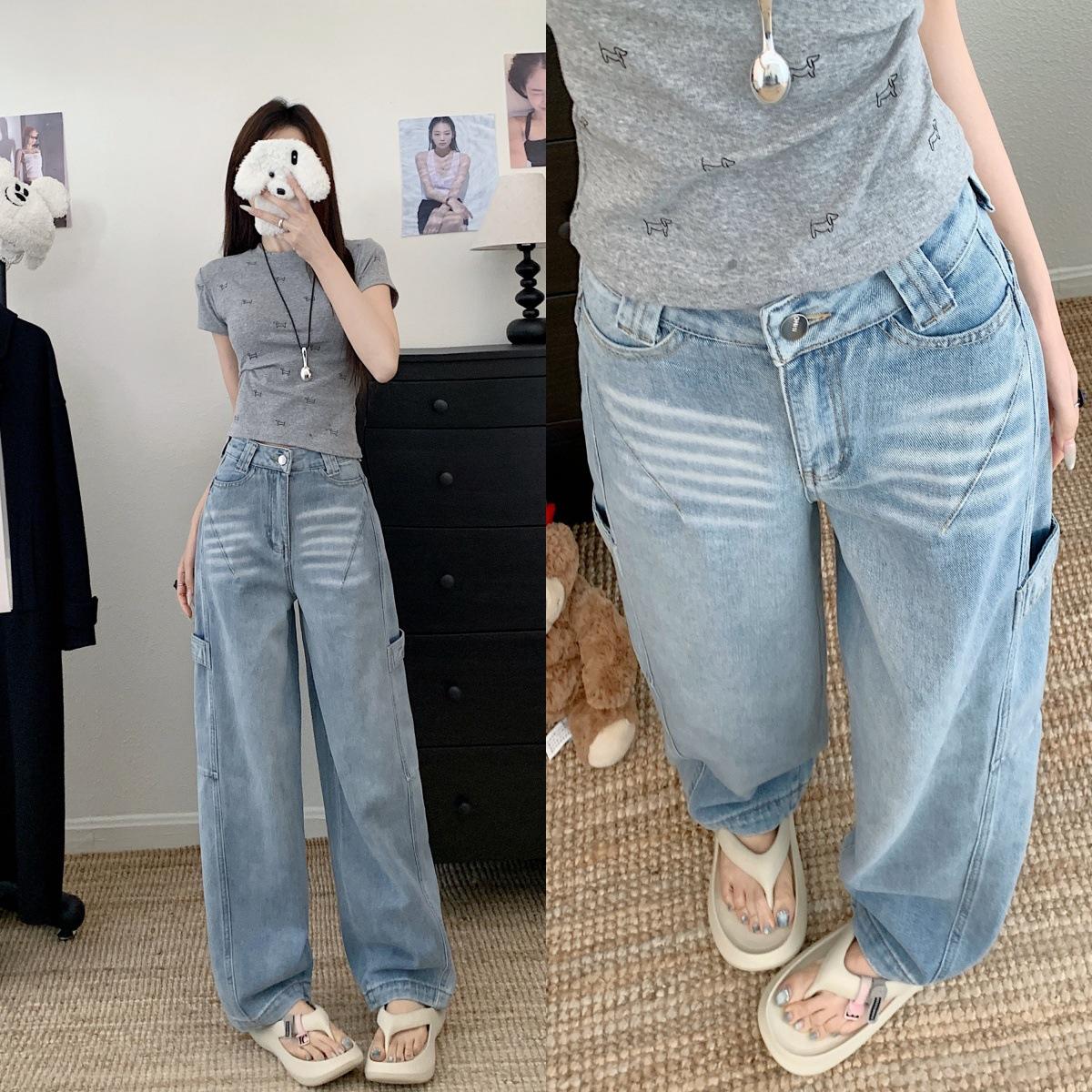 Azul claro Jeans Machete para Mujer Primavera y Verano Nuevo Cintura Alta Diseño Adelgazante Sentido High Street Ropa de Trabajo Pantalones Pierna Ancha