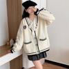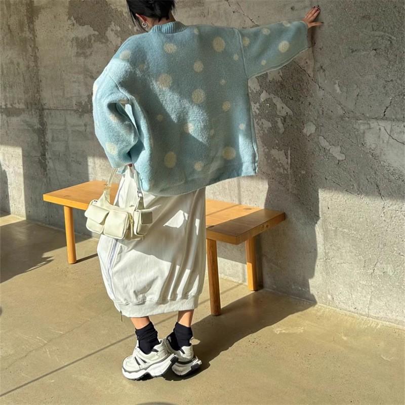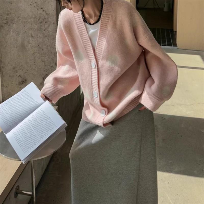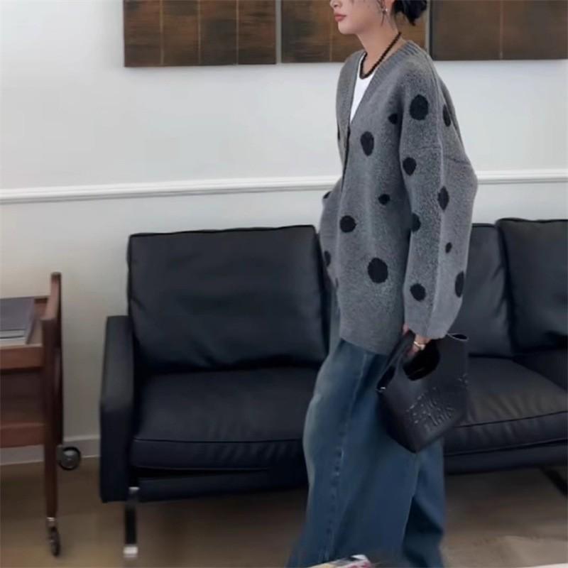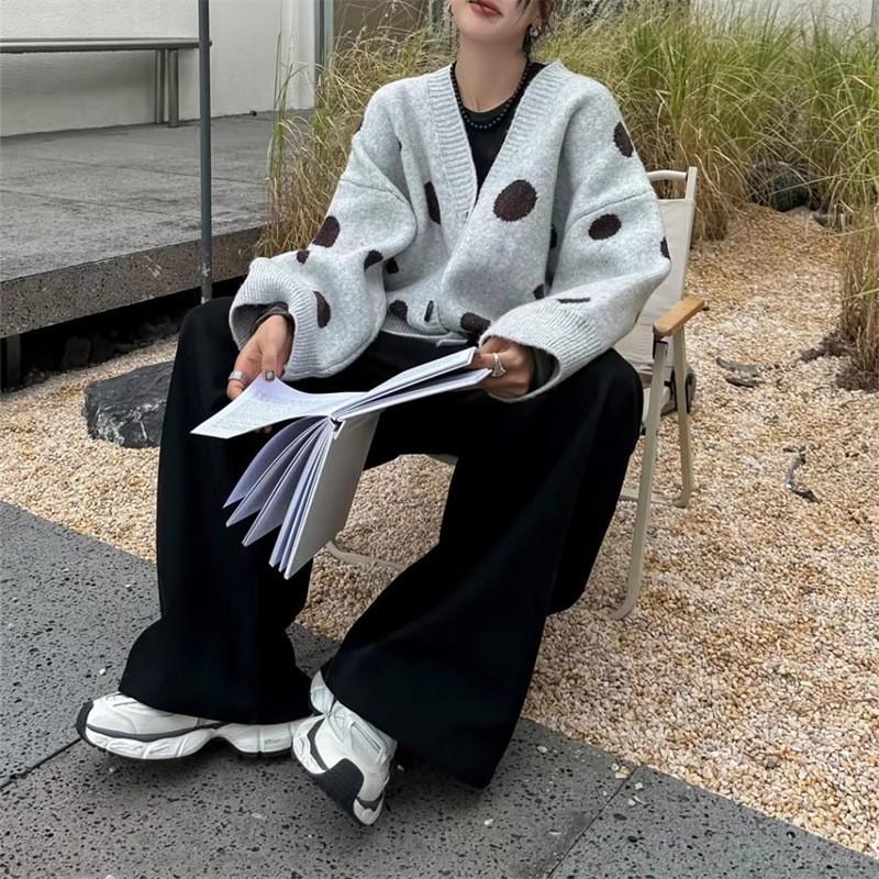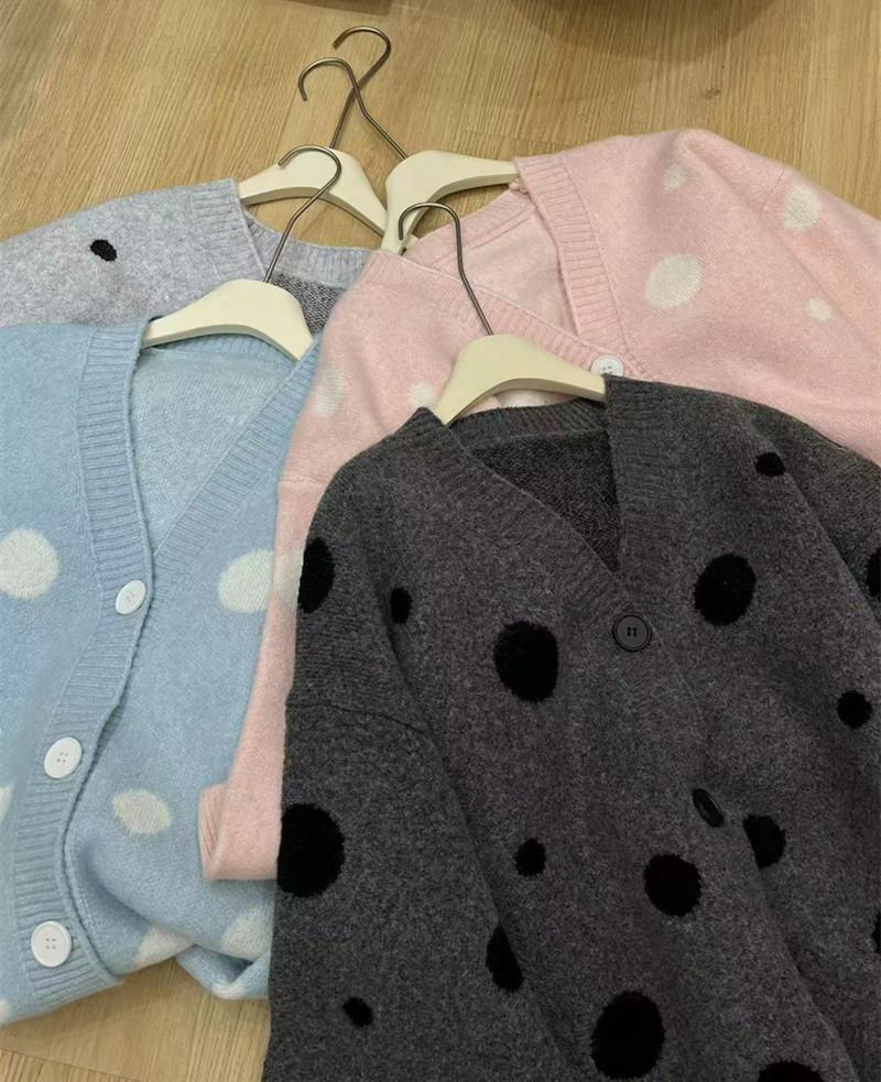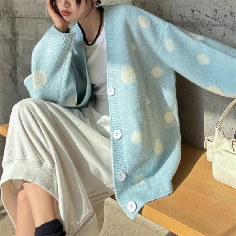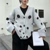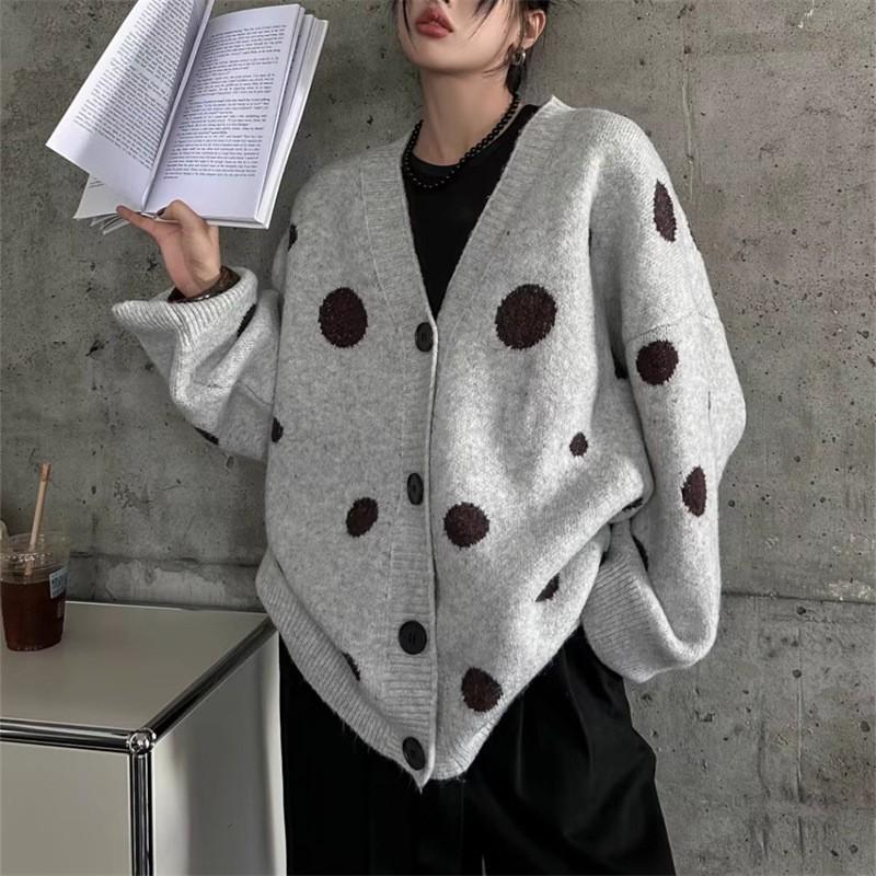 Cárdigan de Punto Oversize de Otoño e Invierno con Cuello en V Estilo Coreano para Mujer 2024, Diseño Trendy con Suéter Abrigo Estilo Retro de Lunares