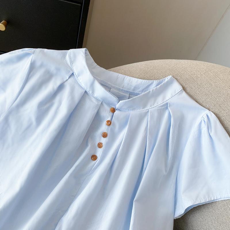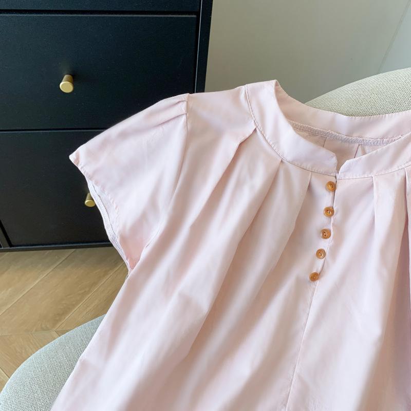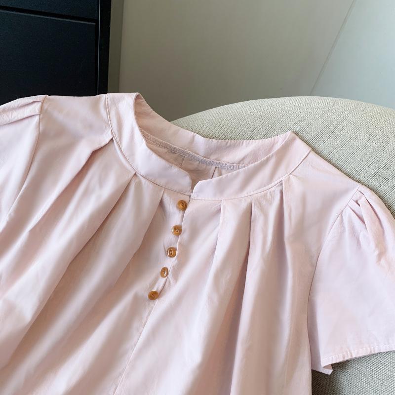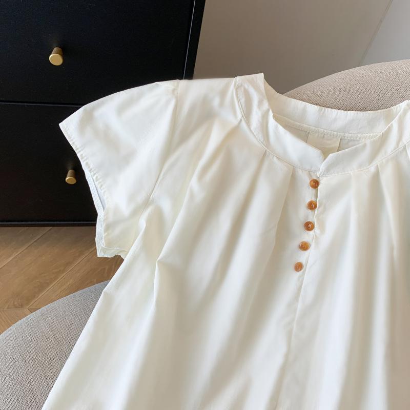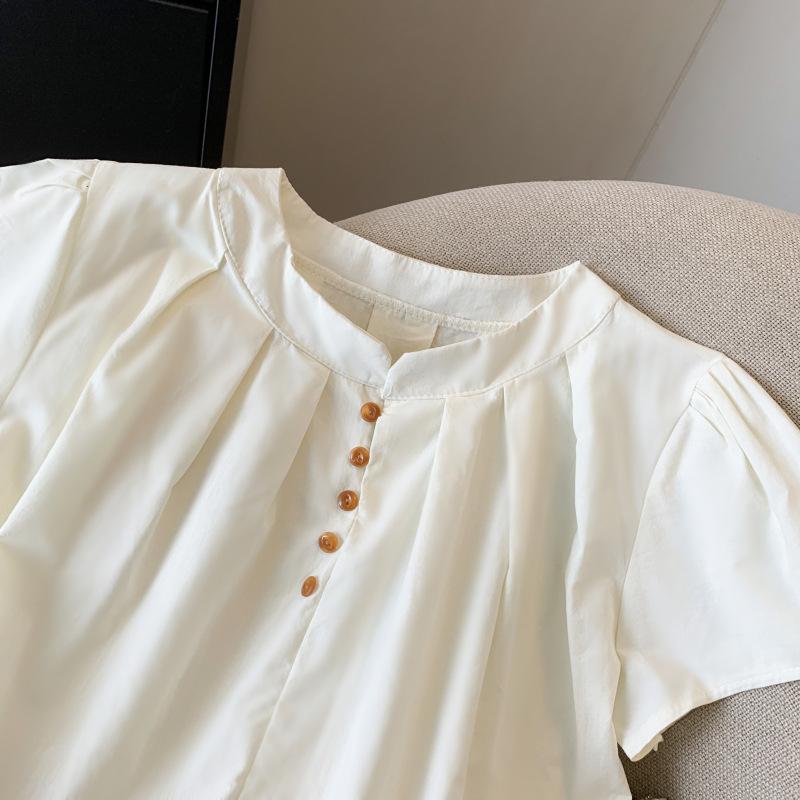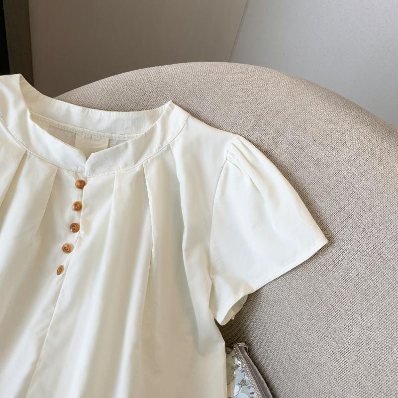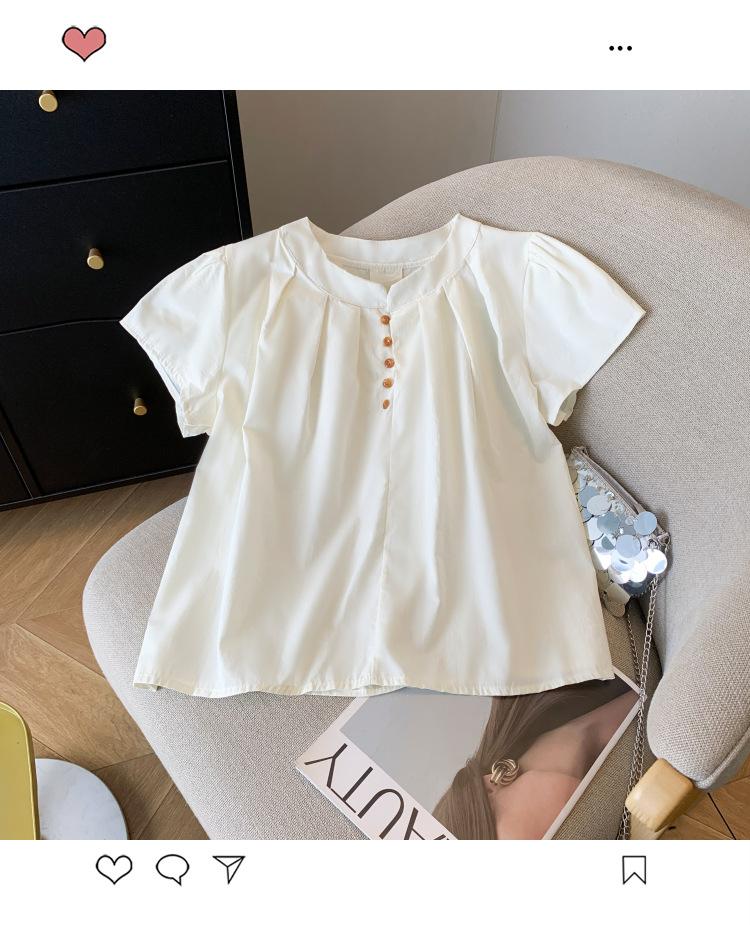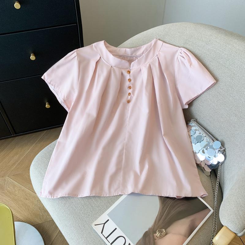 Camisa Top de Manga Corta con Cuello Redondo y Botones Franceses para Mujer, Casual, Holgada, Adelgazante, Elegante
