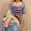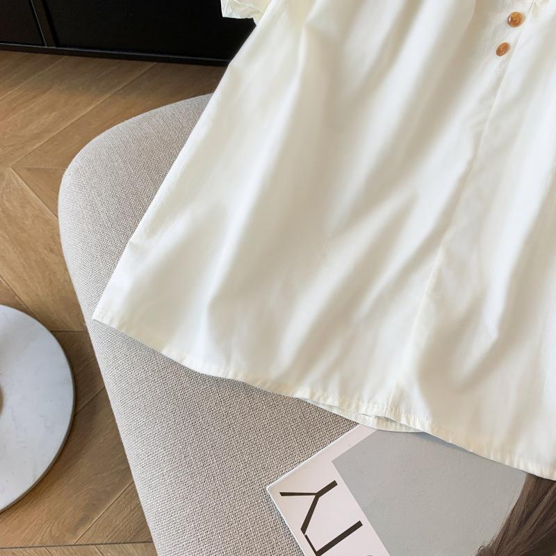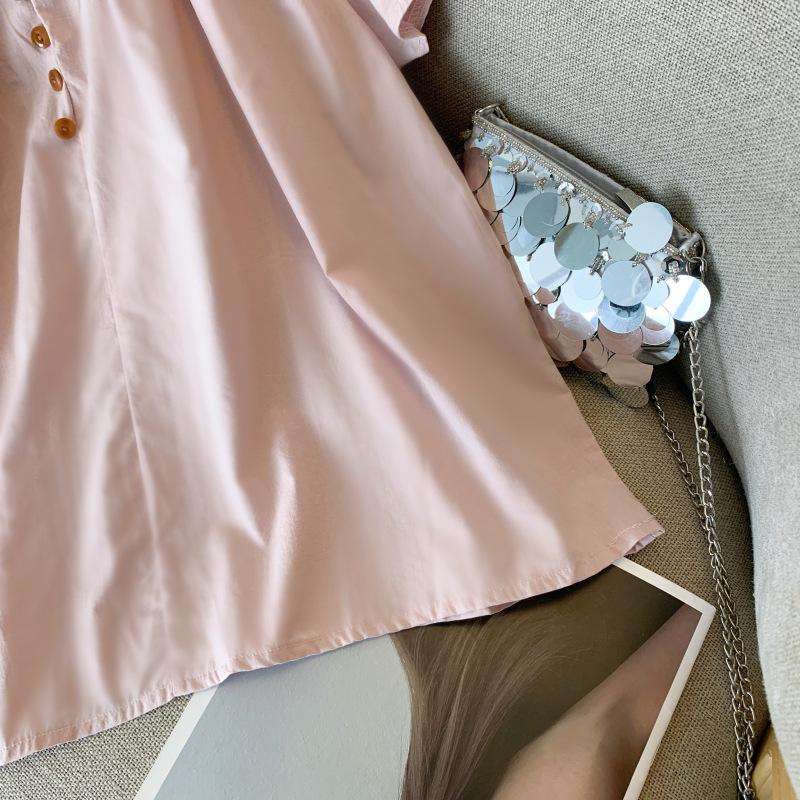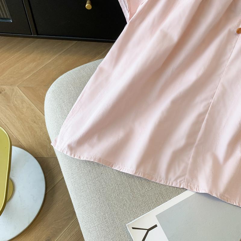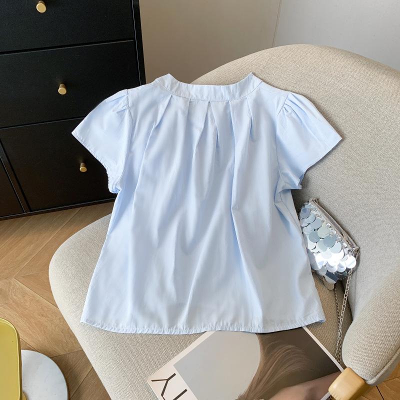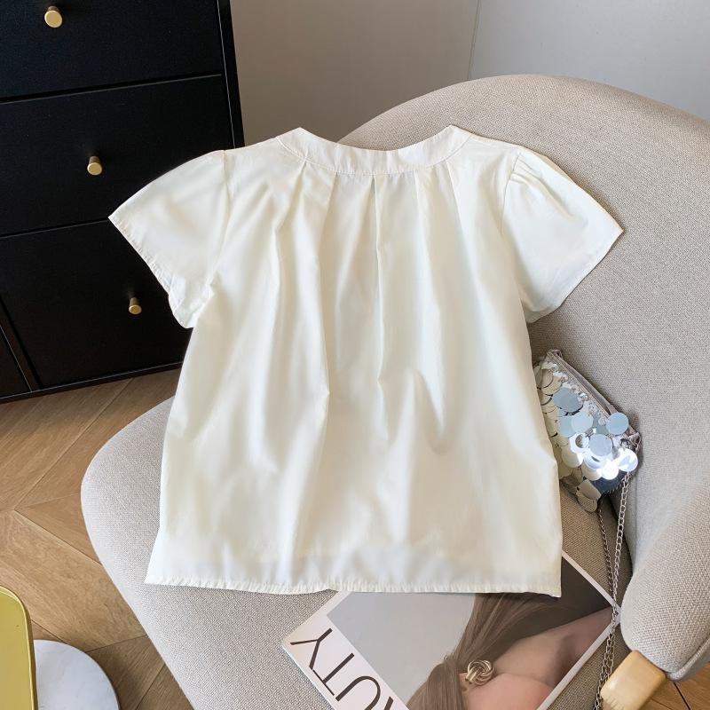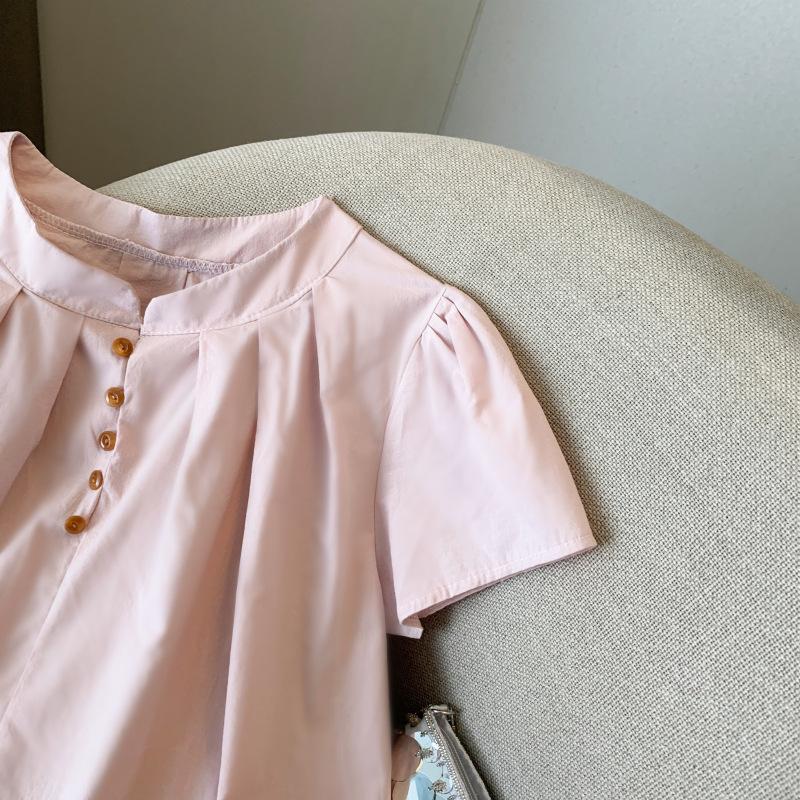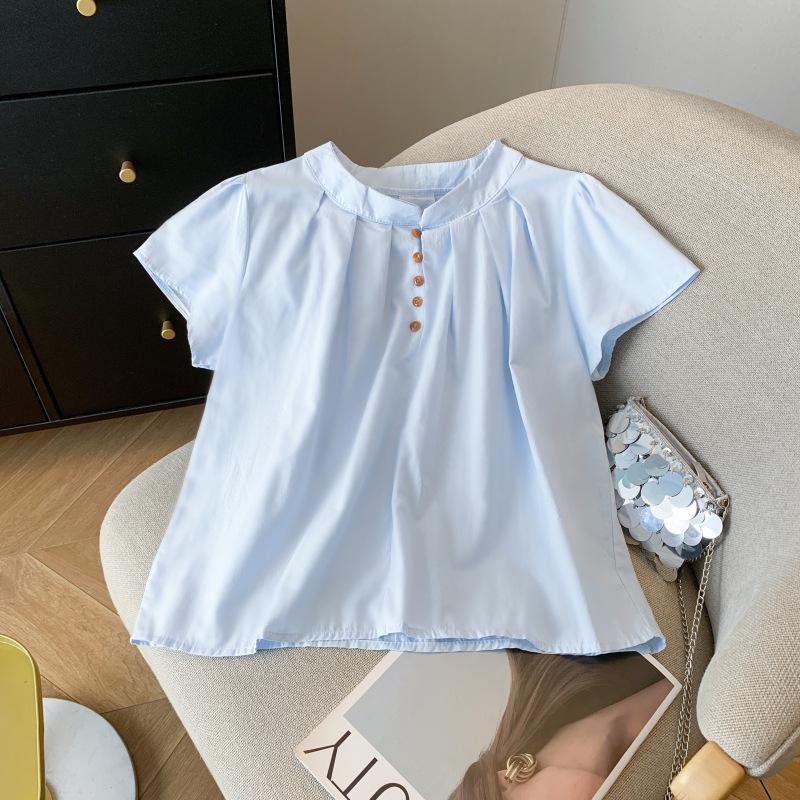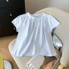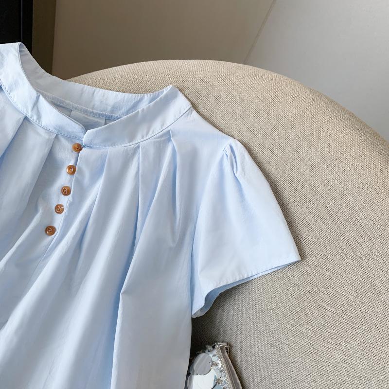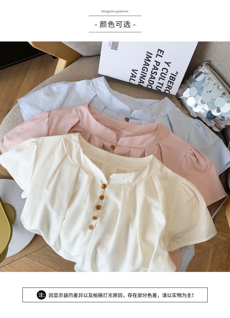 Camisa Top de Manga Corta con Cuello Redondo y Botones Franceses para Mujer, Casual, Holgada, Adelgazante, Elegante