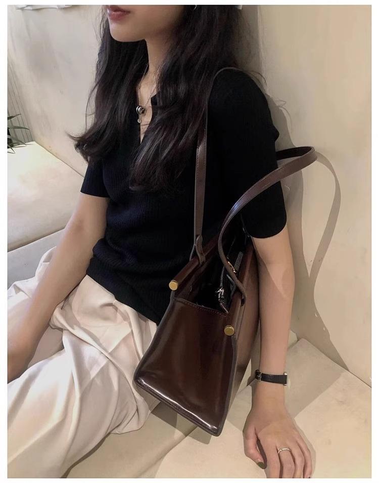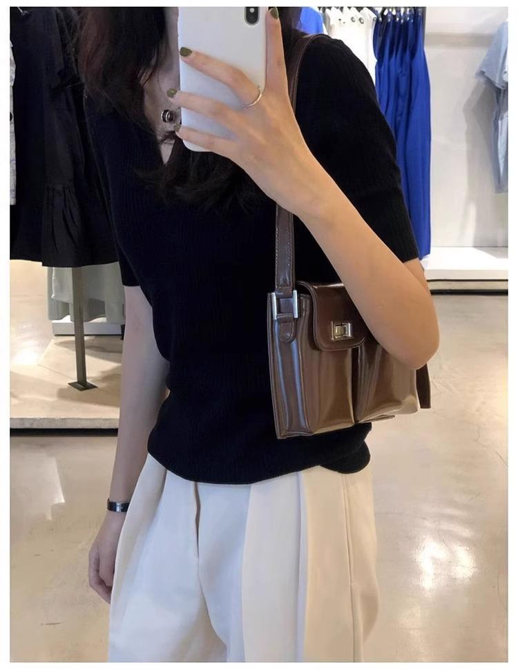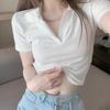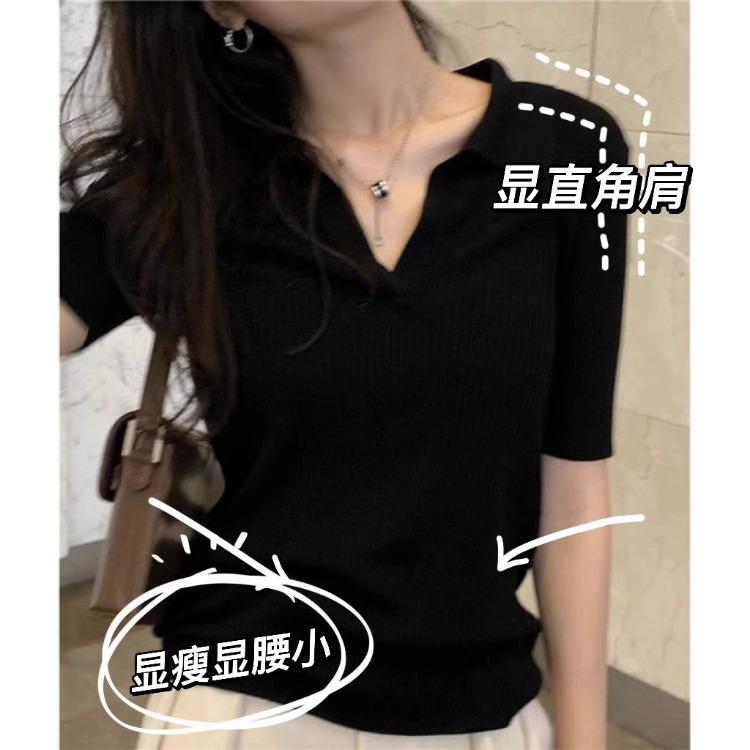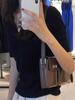 Playera Negra de Cuello en V de Manga Corta con Hombro para Mujer Verano de Alta Gama Ajustada Adelgazante Pequeña Chic Clavícula Top Corto