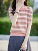Venta al por mayor Verano Nuevo Algodón Cuello Redondo Tejido de Punto Camiseta de Manga Corta Corte para Mujer Jersey Jacquard con Aberturas Camiseta Base Top