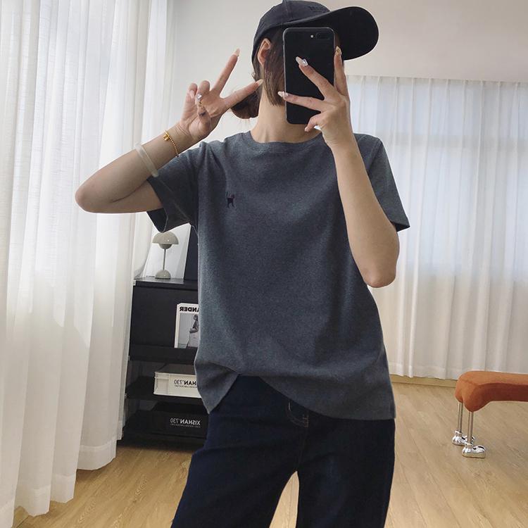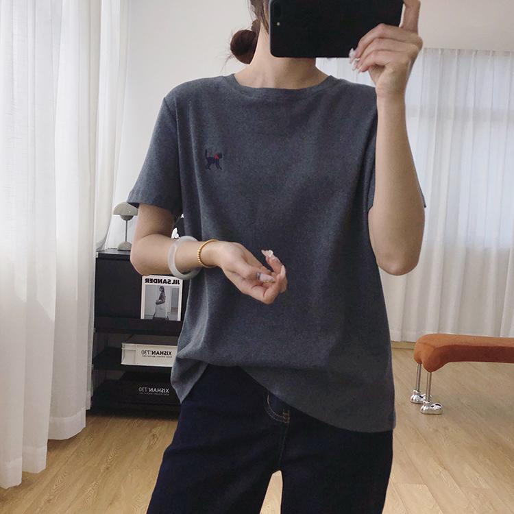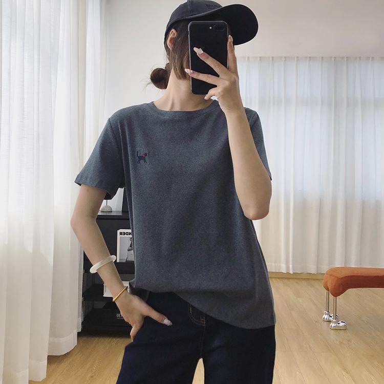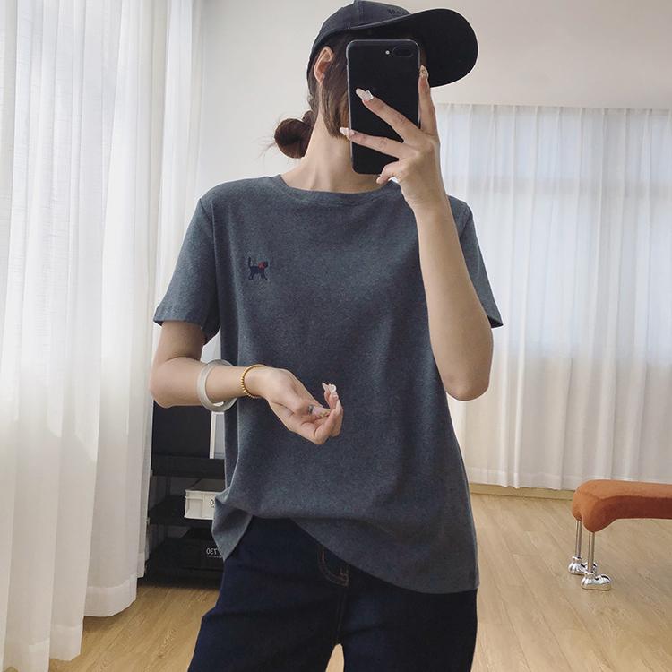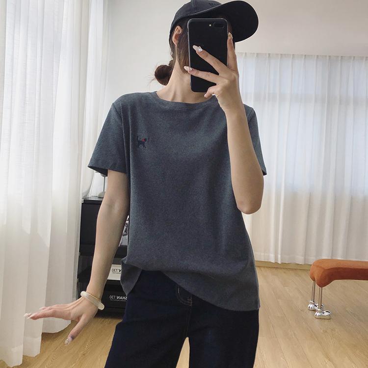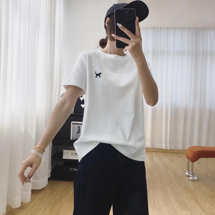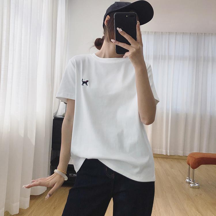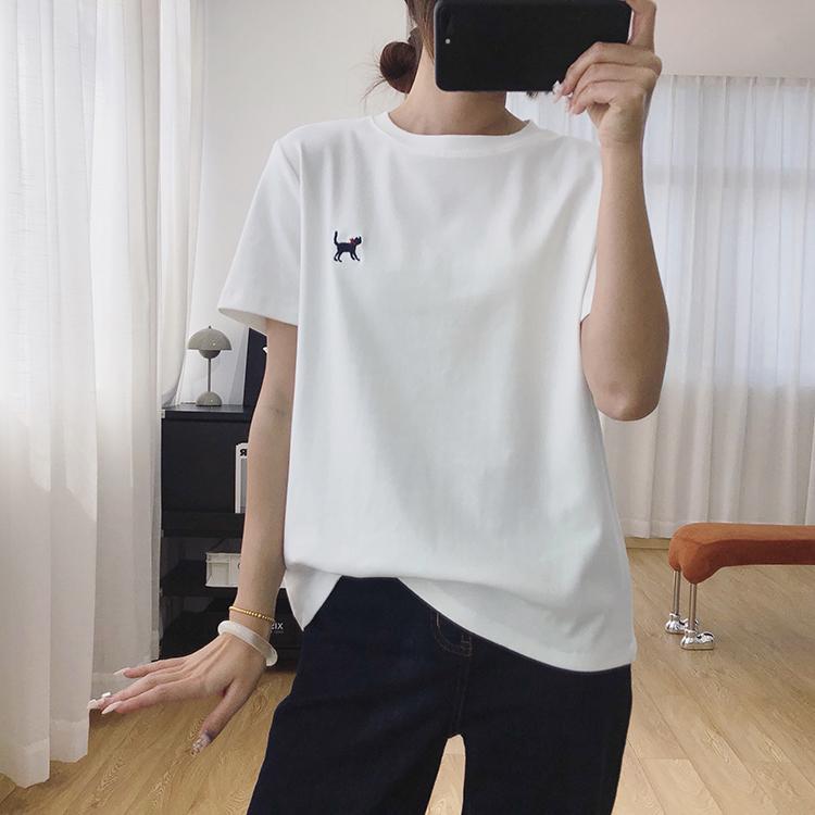 Camiseta de Manga Corta Casual Simple Bordada Suave y Delicada con la Piel para Mujer Verano Algodón 2025 Nueva Cuello Redondo Holgada para Verano