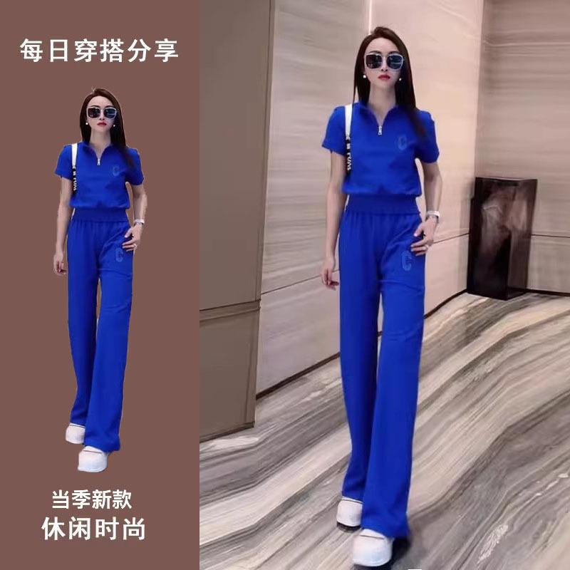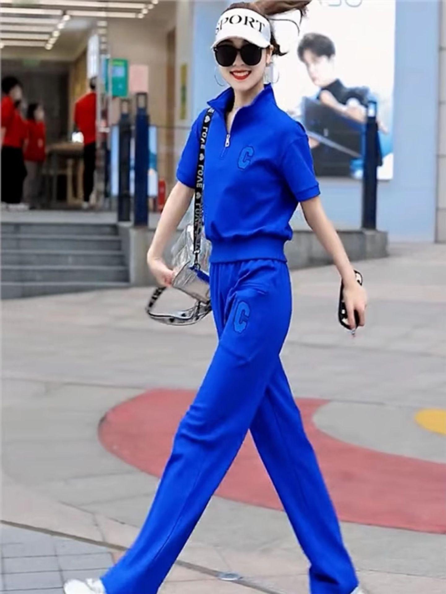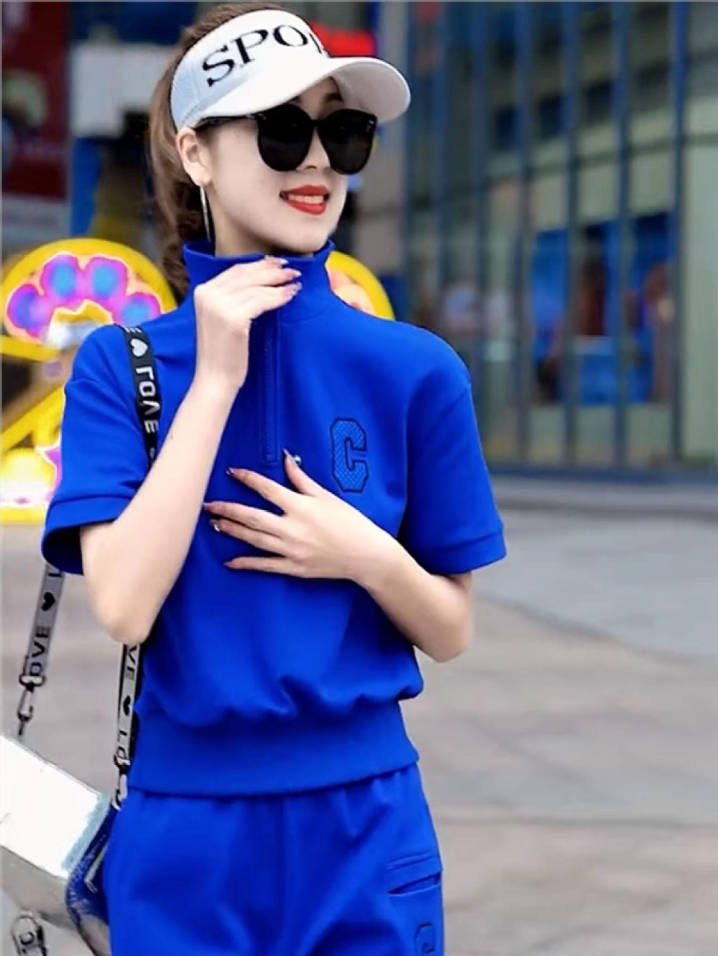 Traje Deportivo y de Ocio para Mujer 2025 Verano Nuevo Estilo Cuello Alto Azul Media Cremallera Look Adelgazante Conjunto de Dos Piezas Moderno