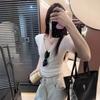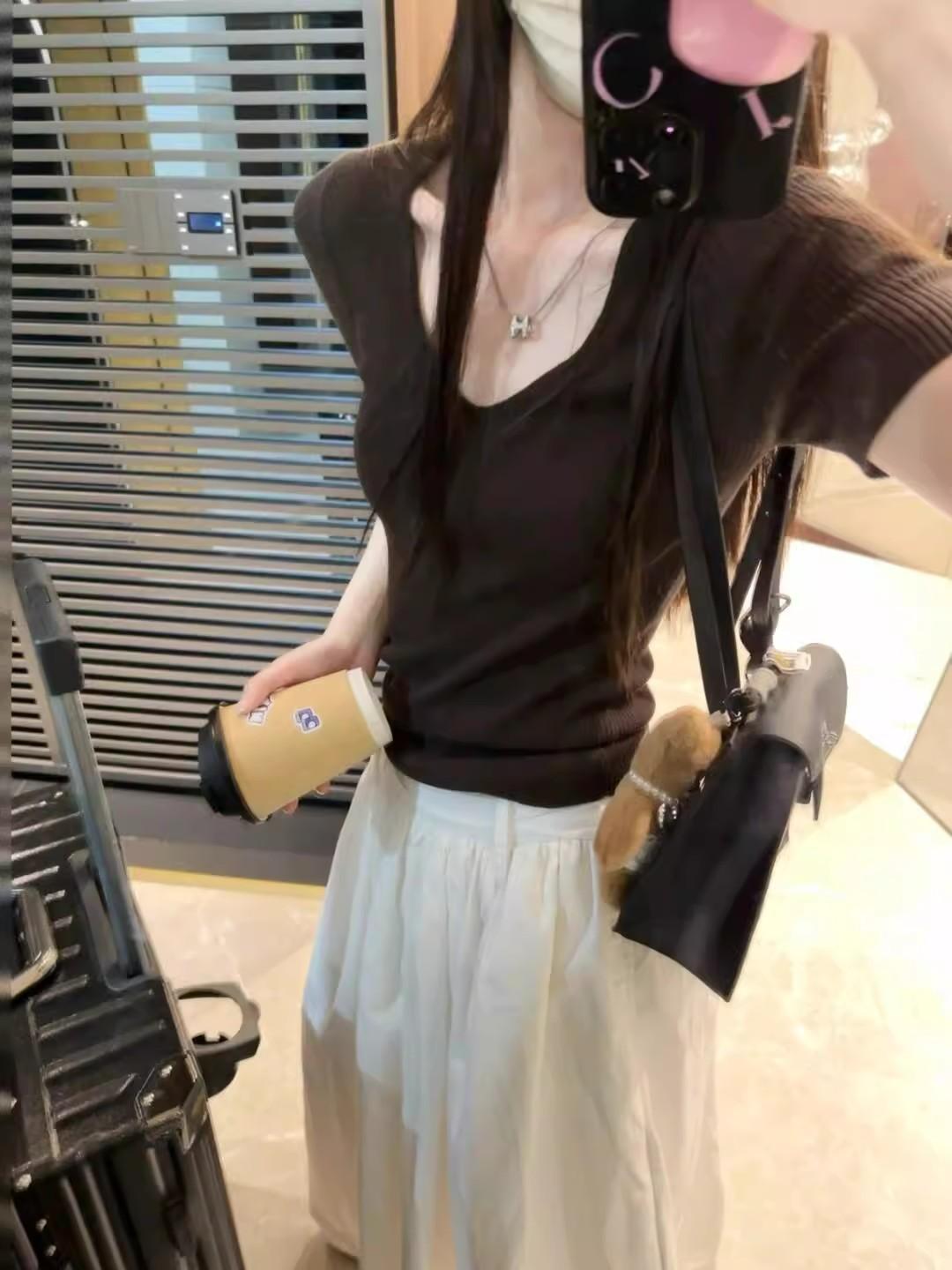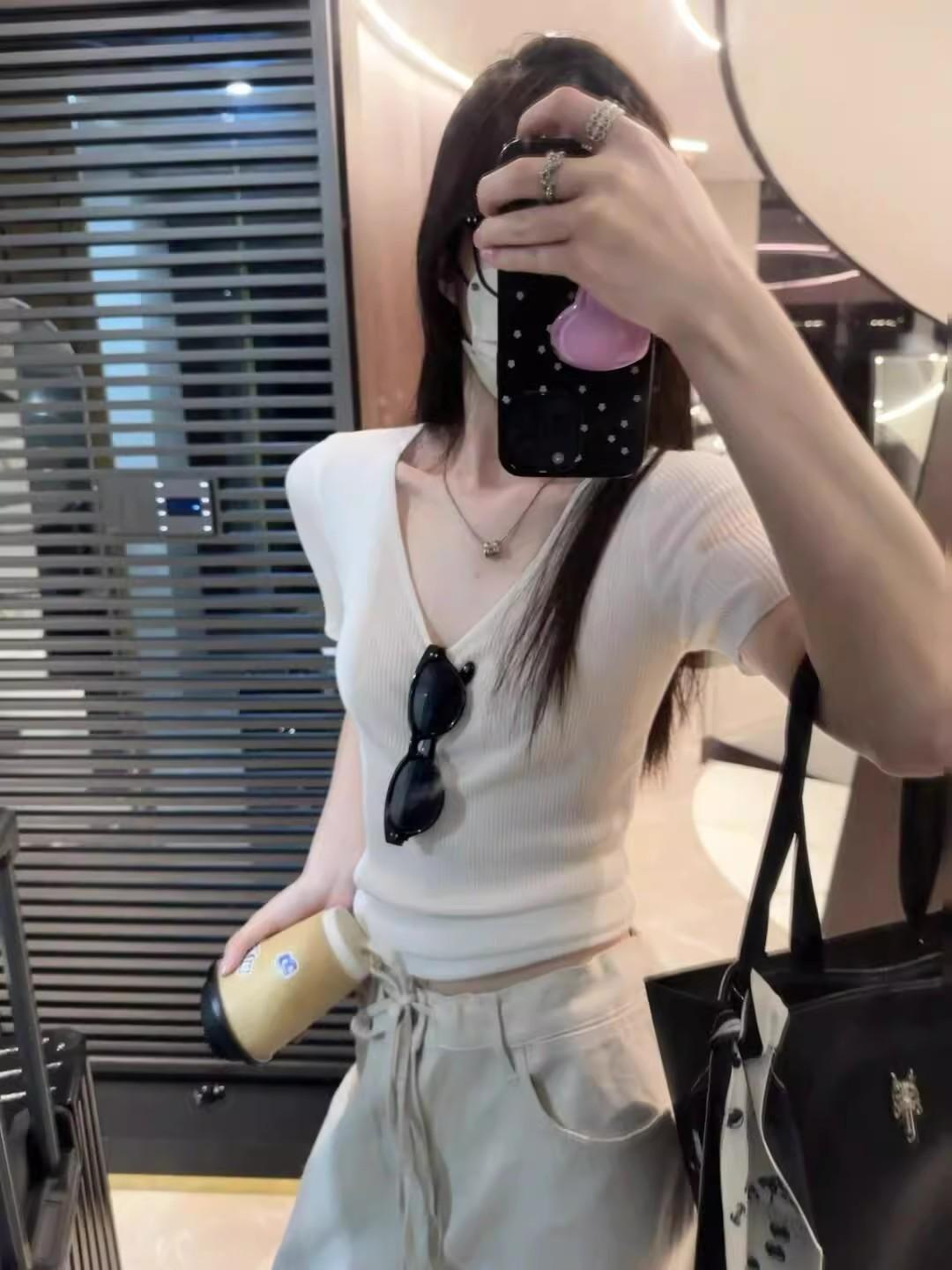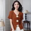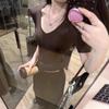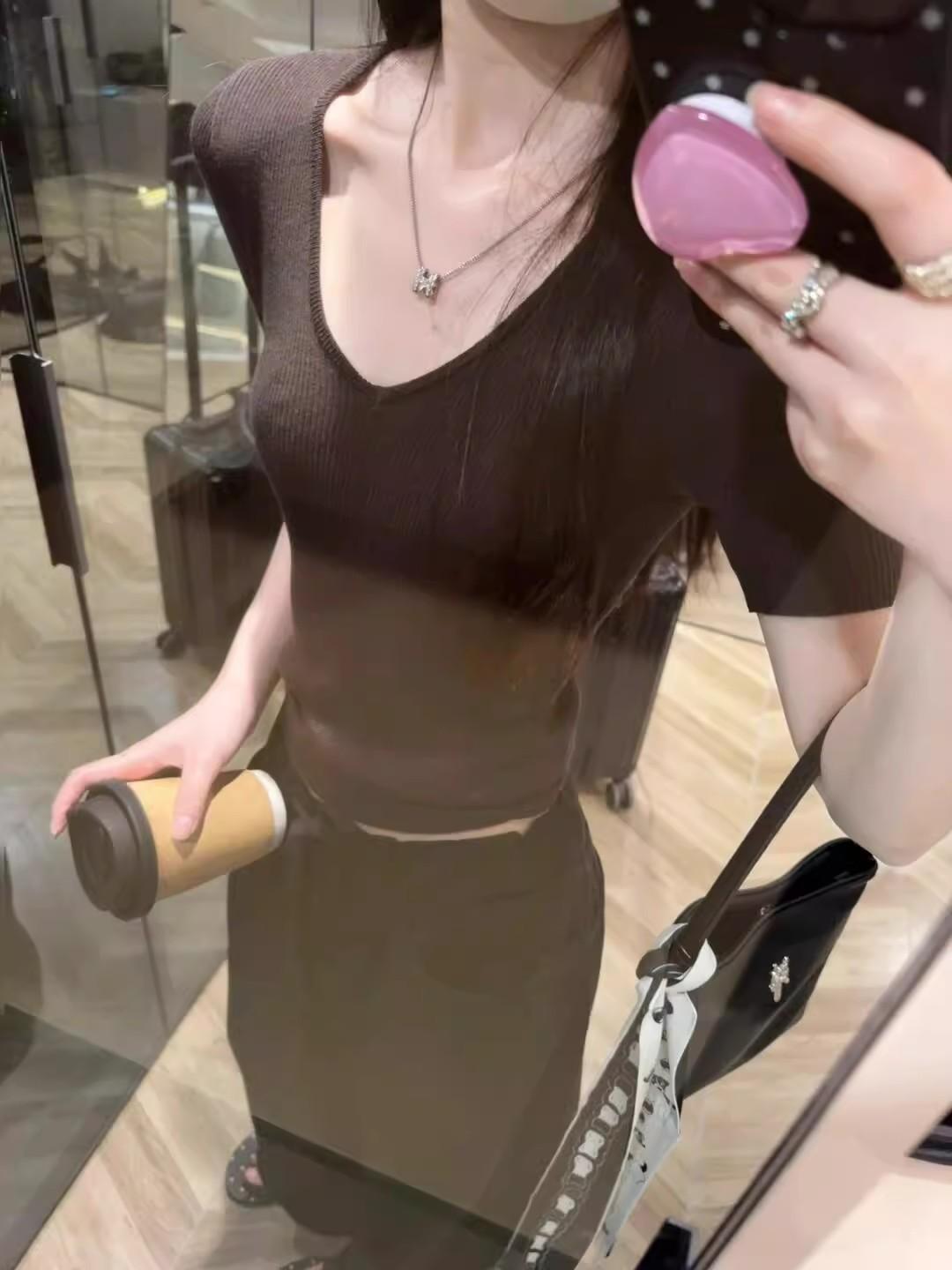 Camiseta Marrón de Corte Slim con Cuello en V Profundo y Manga Corta para Mujer Verano 2025 Tejido de Punto Estilo Coreano Elegante Clavícula Top de Media Manga