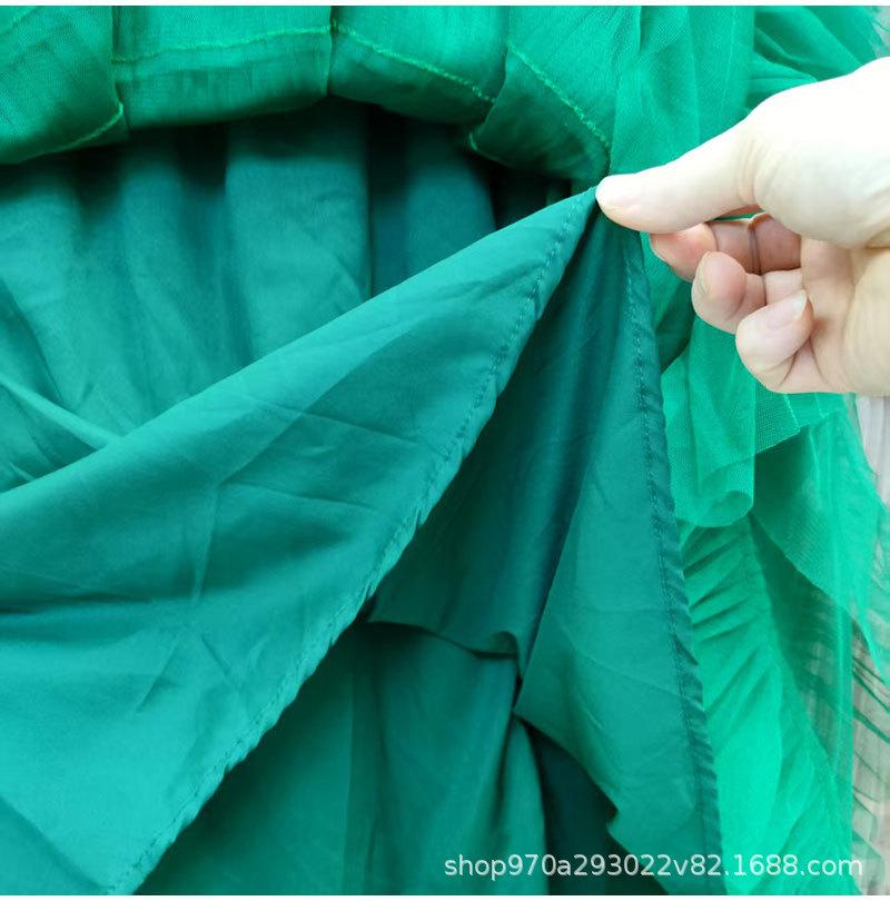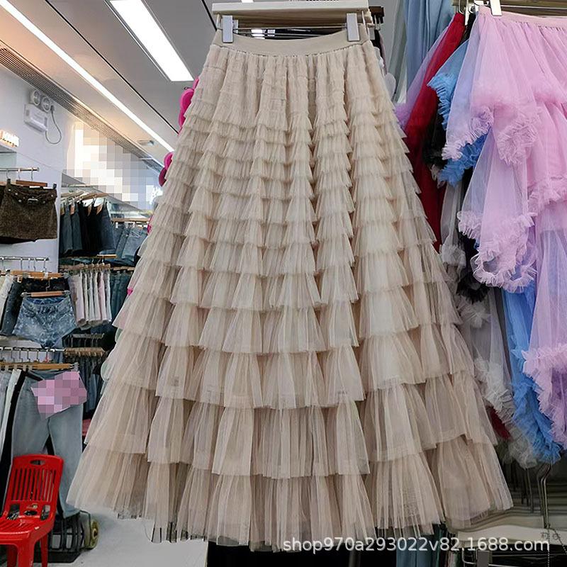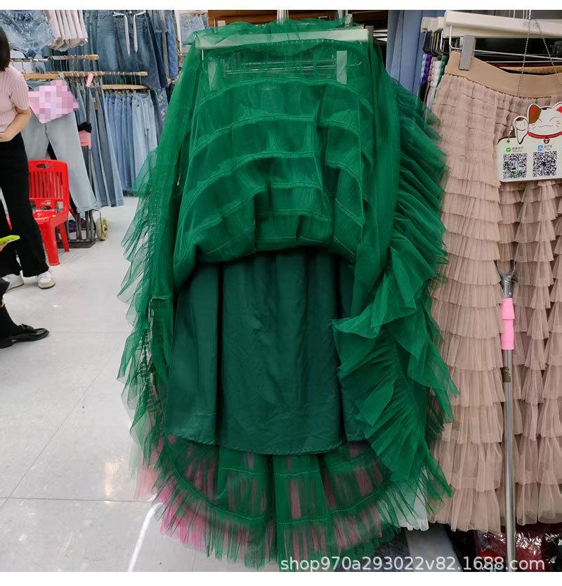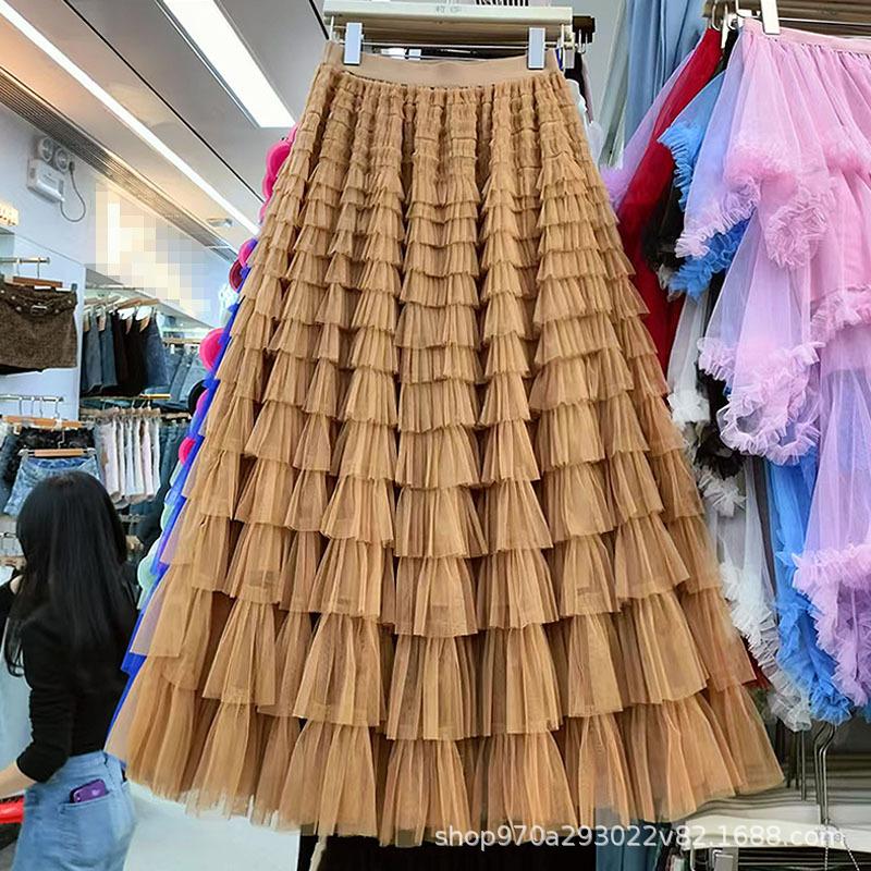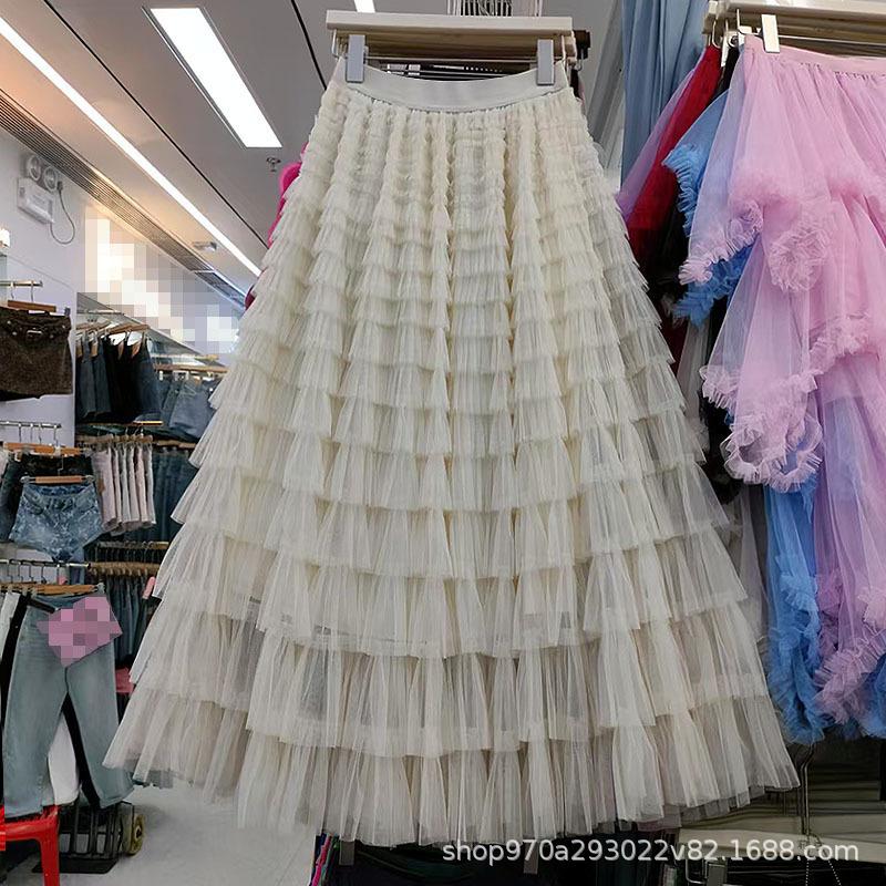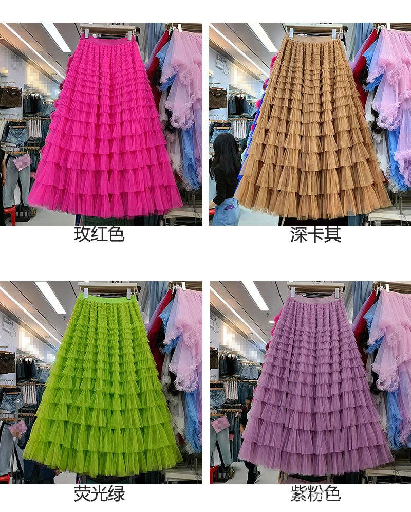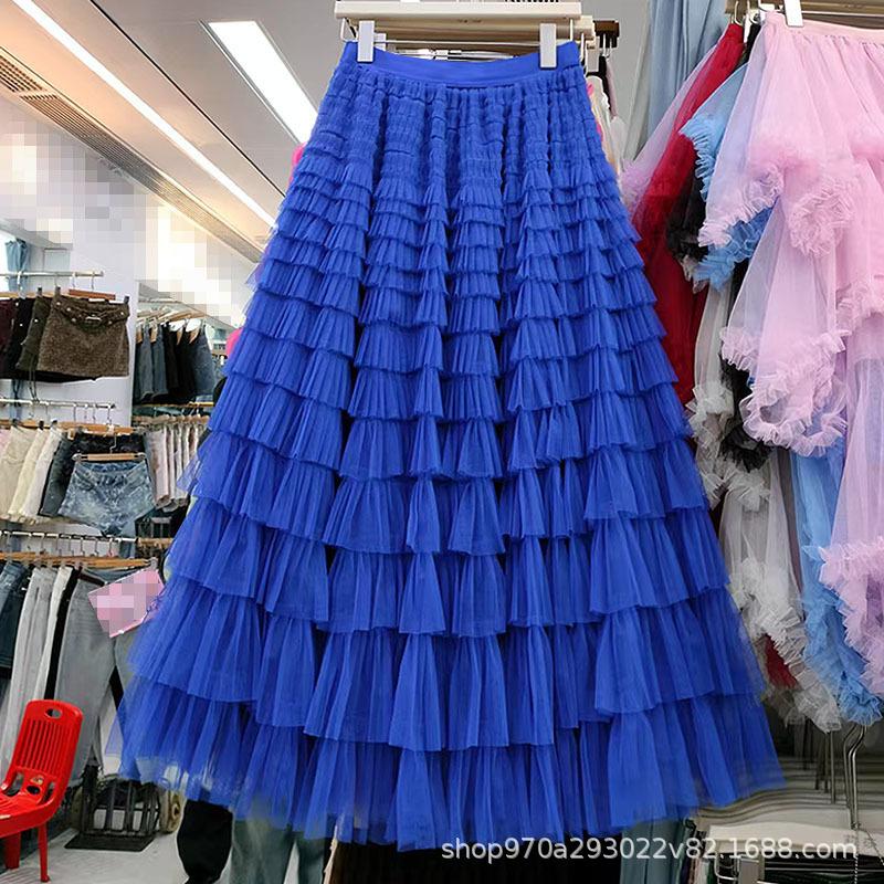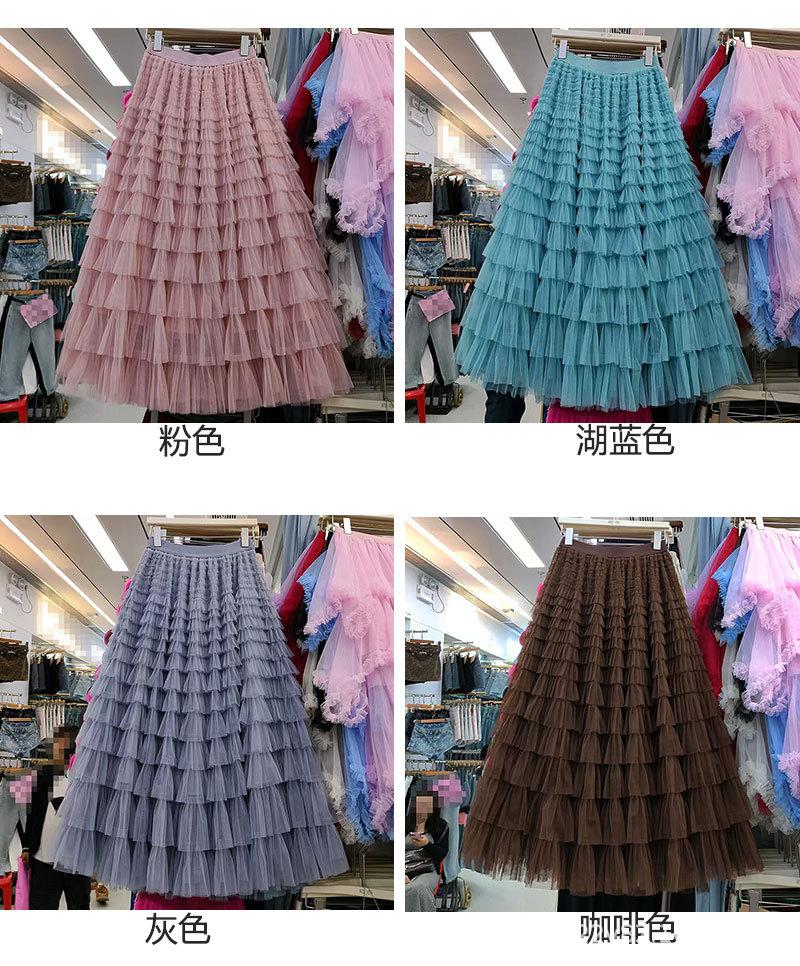 Falda de malla lasaña de comercio exterior talla grande cintura alta falda midi temperamento falda de vuelo grande falda súper hada falda pastel