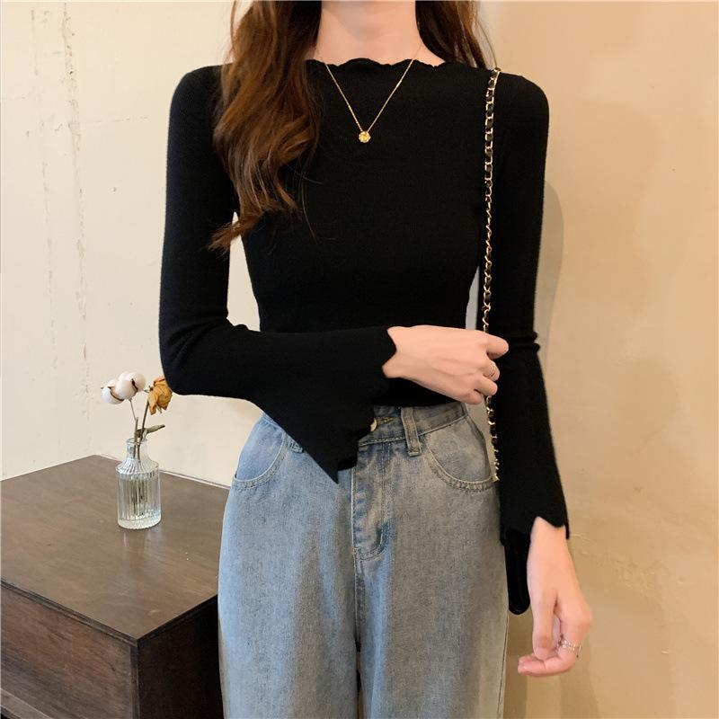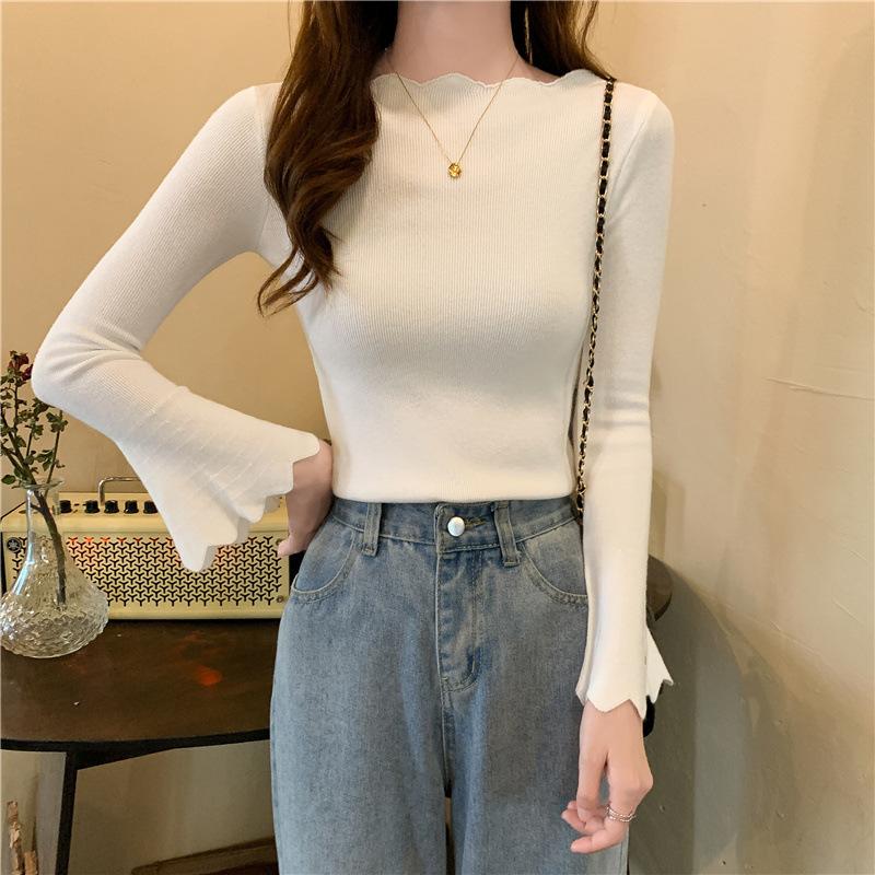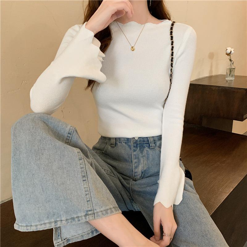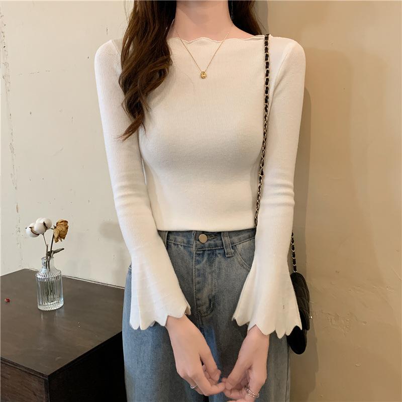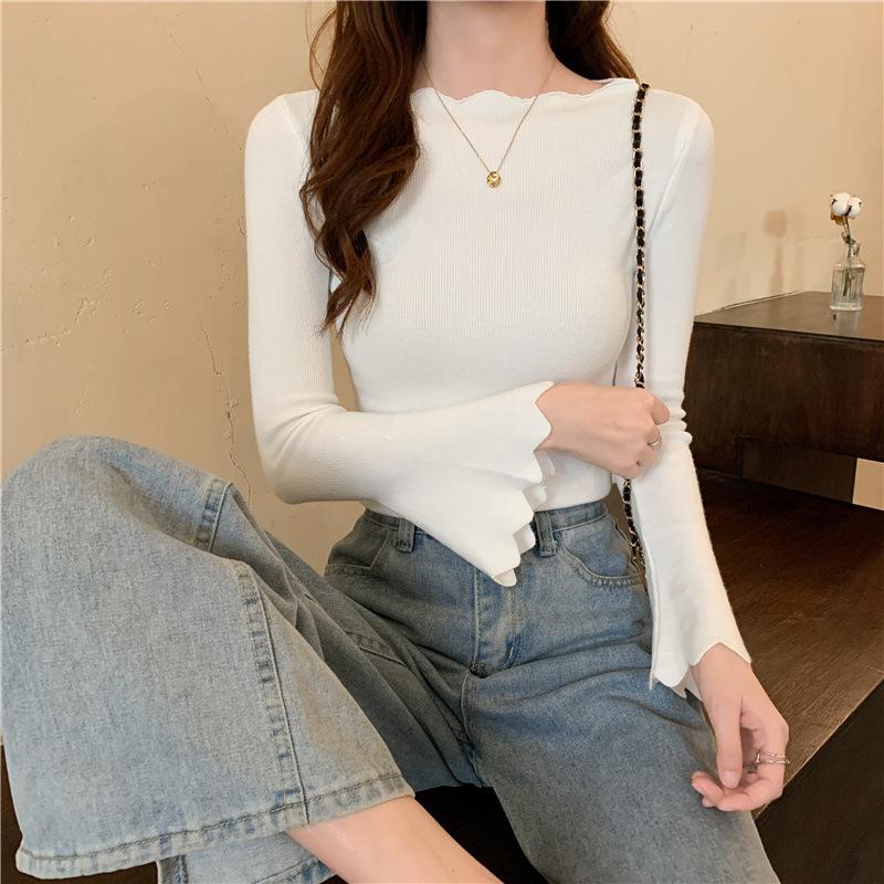 Otoño e Invierno Nuevo Suéter Base de Manga Larga Ajustado Diseño de Estilo Occidental Nicho Suéter de Manga Trompeta para Mujer