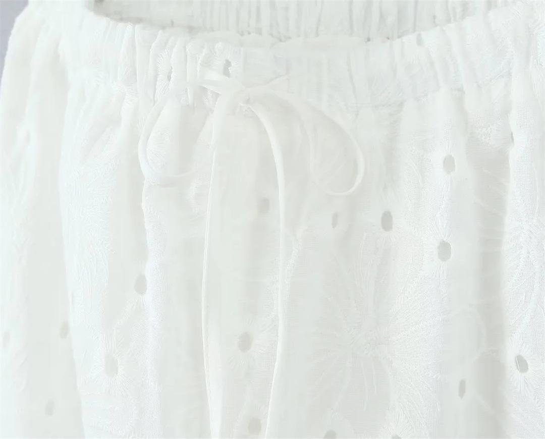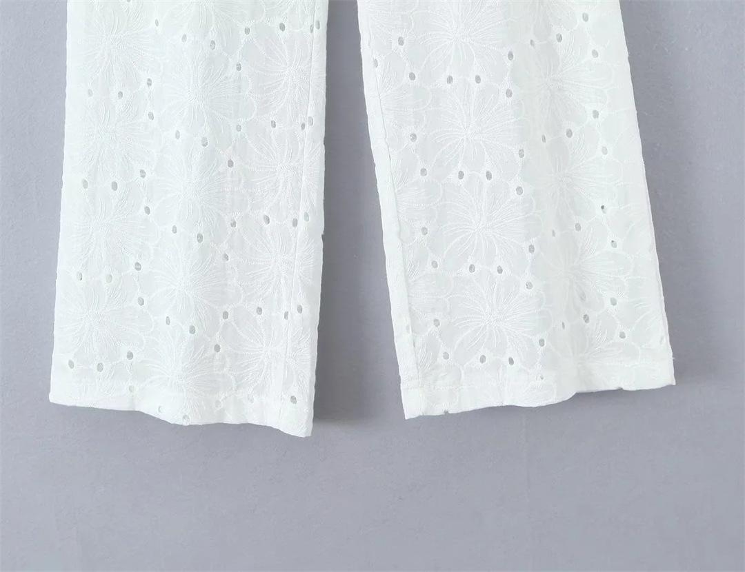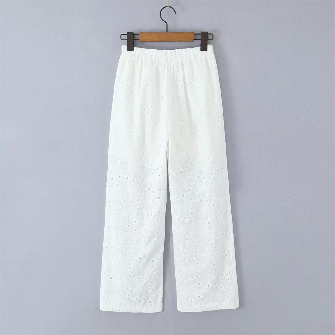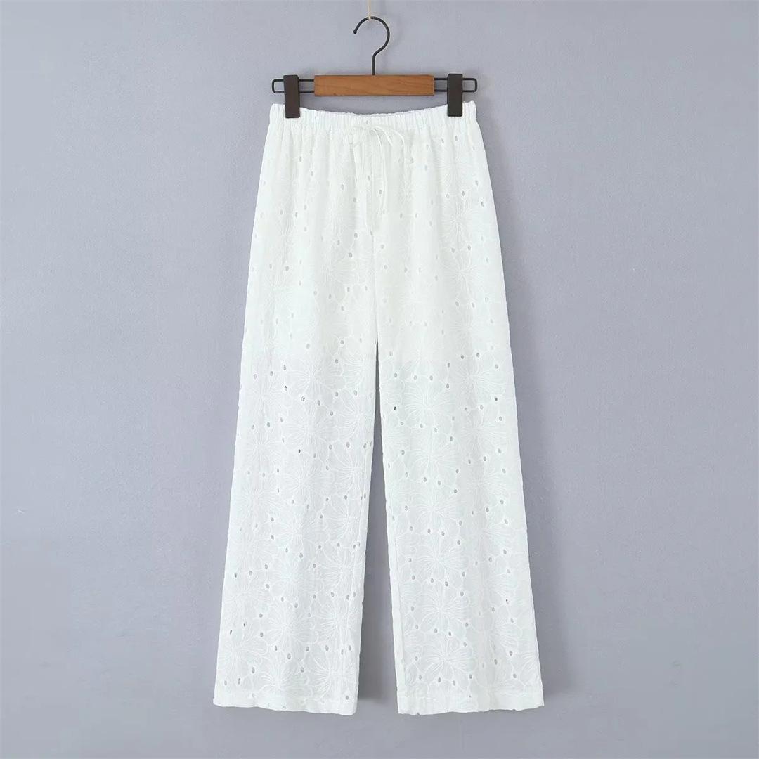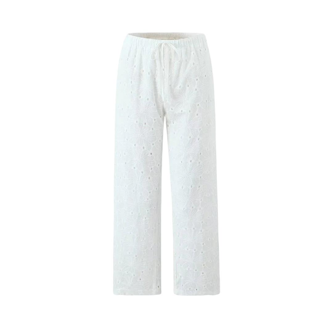 Pantalones rectos elásticos de tiro bajo con cordón estilo europeo y americano para mujer Diseño nicho Bordado Recorte Sexy Casual Blanco