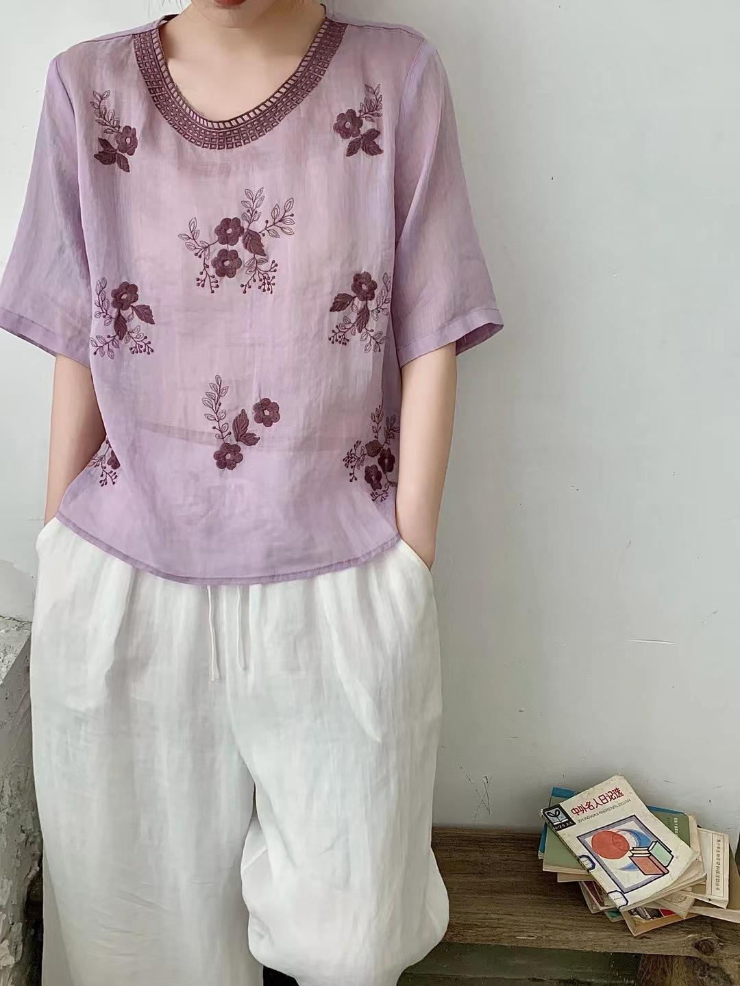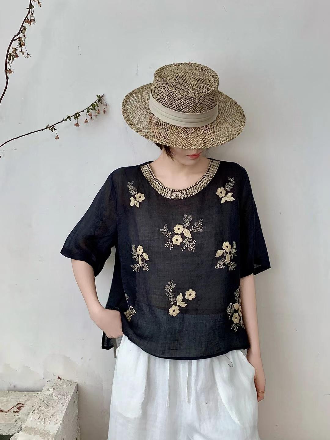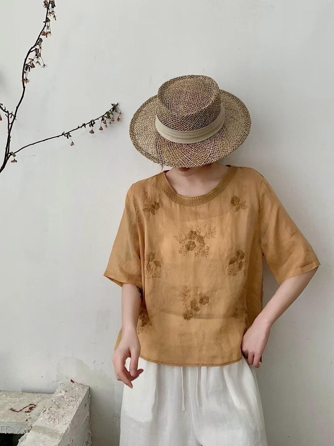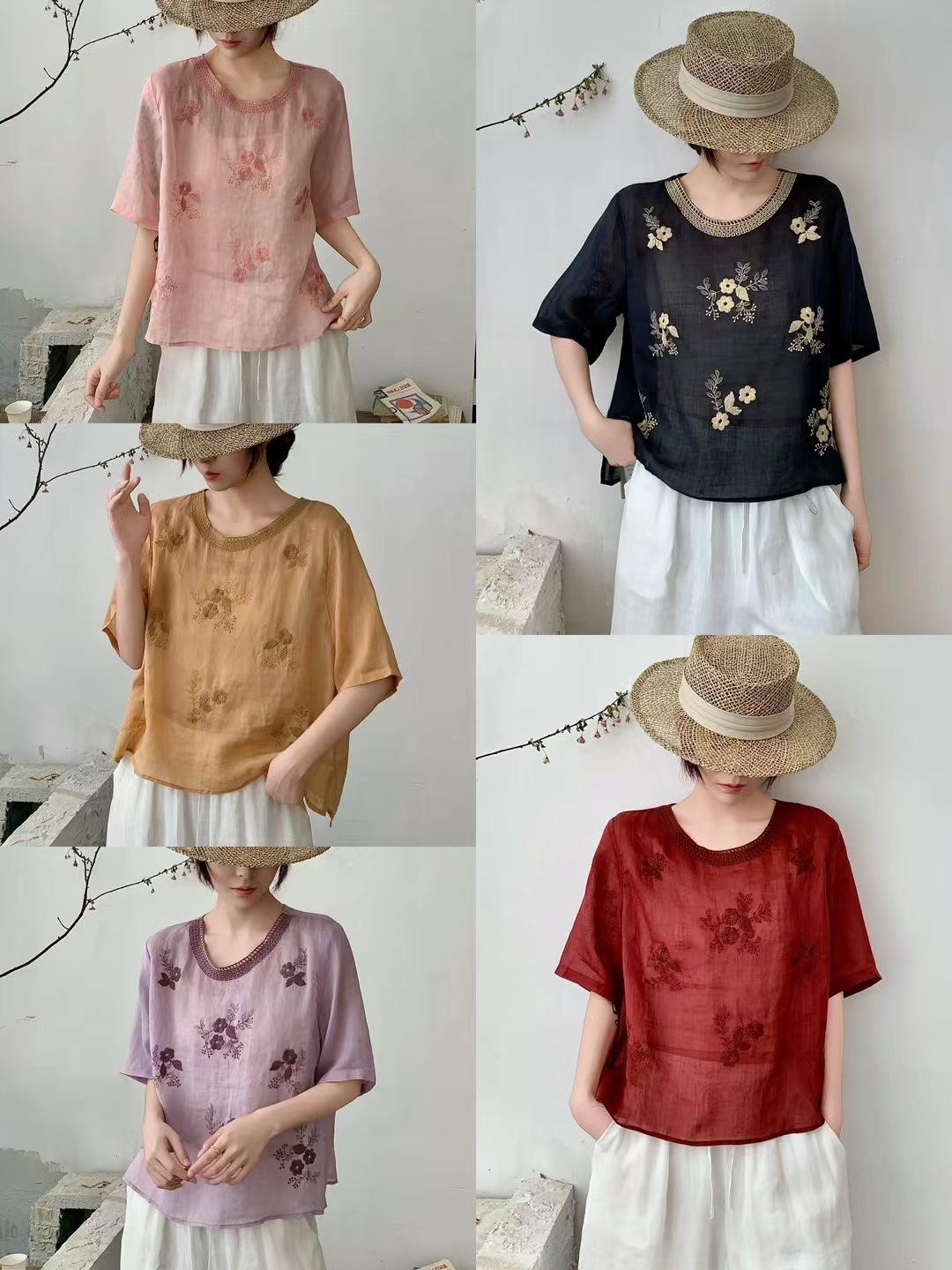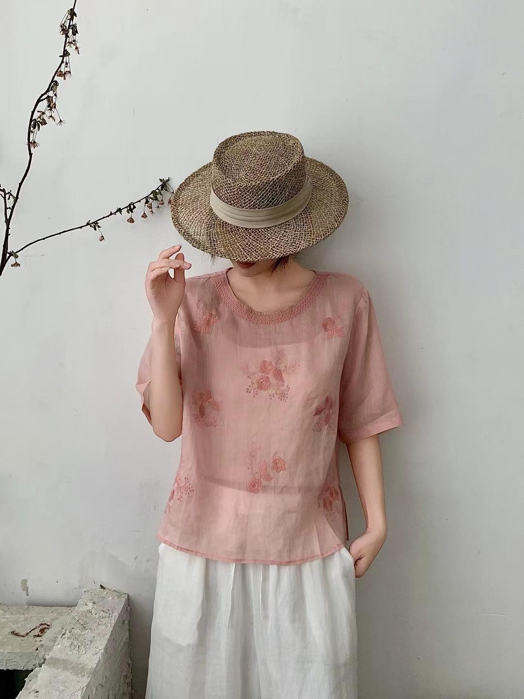 2025 Nuevo Estilo de Verano Estilo Artístico Cuello Redondo Camisa de Ramio Bordada Pesada Elegante Estilo Ejecutivo Manga Corta