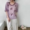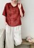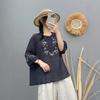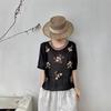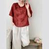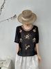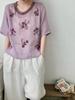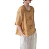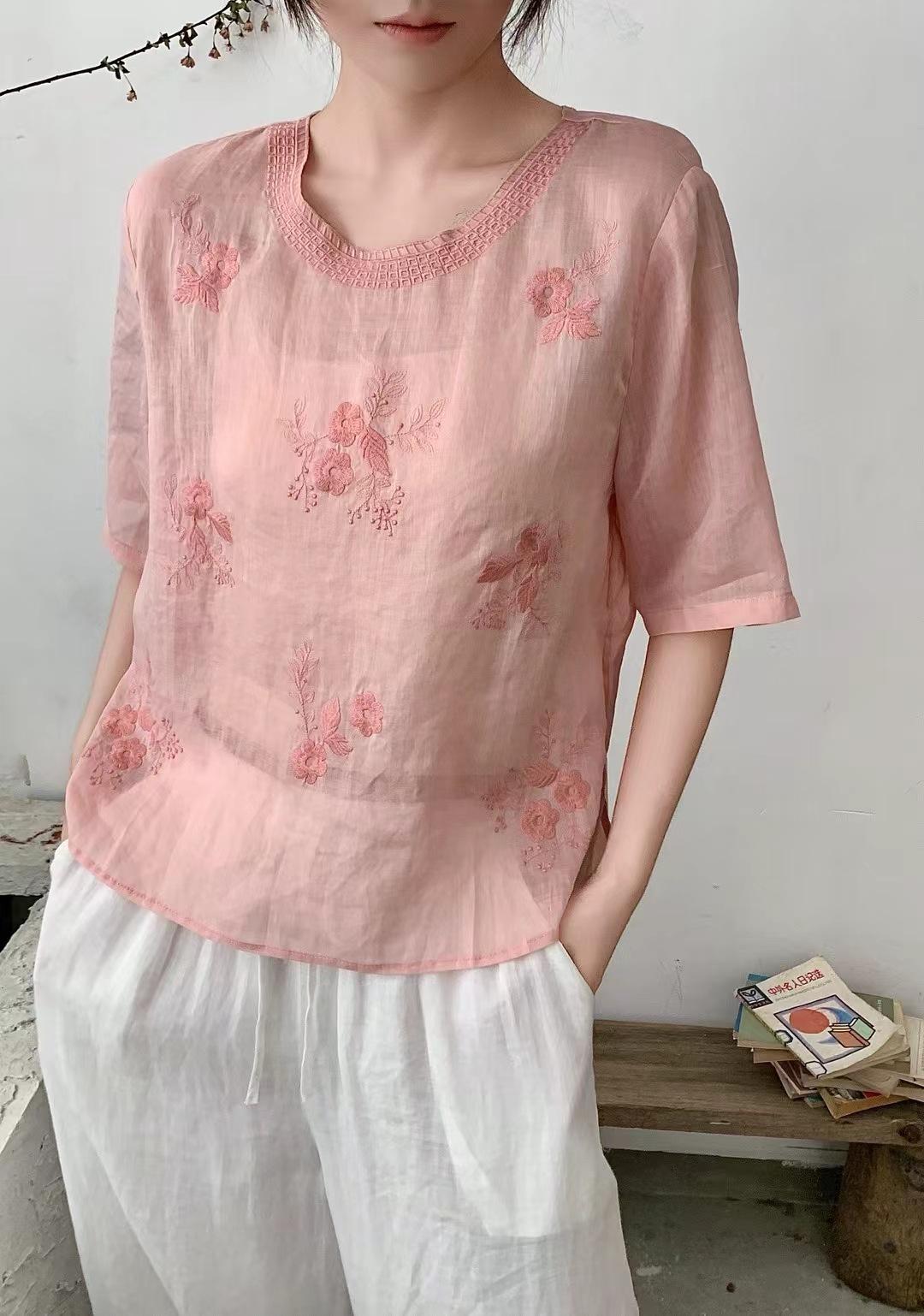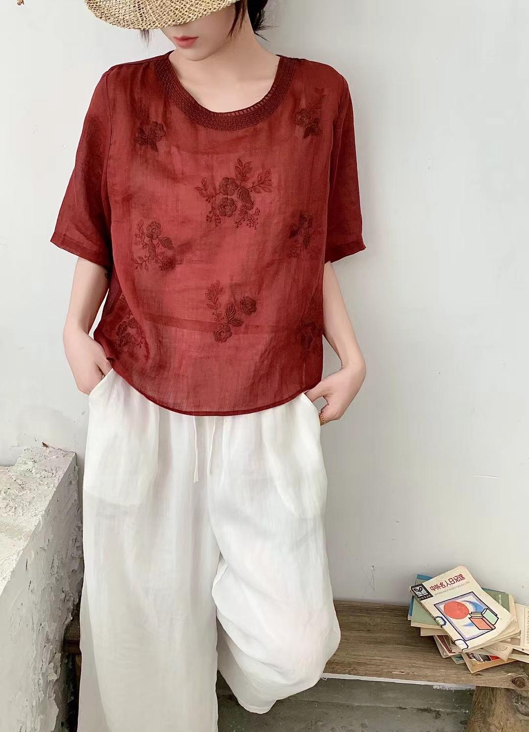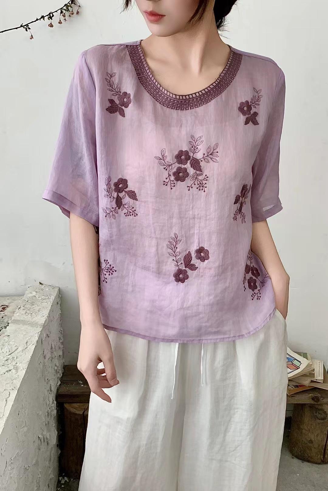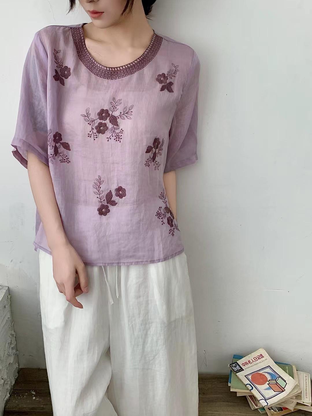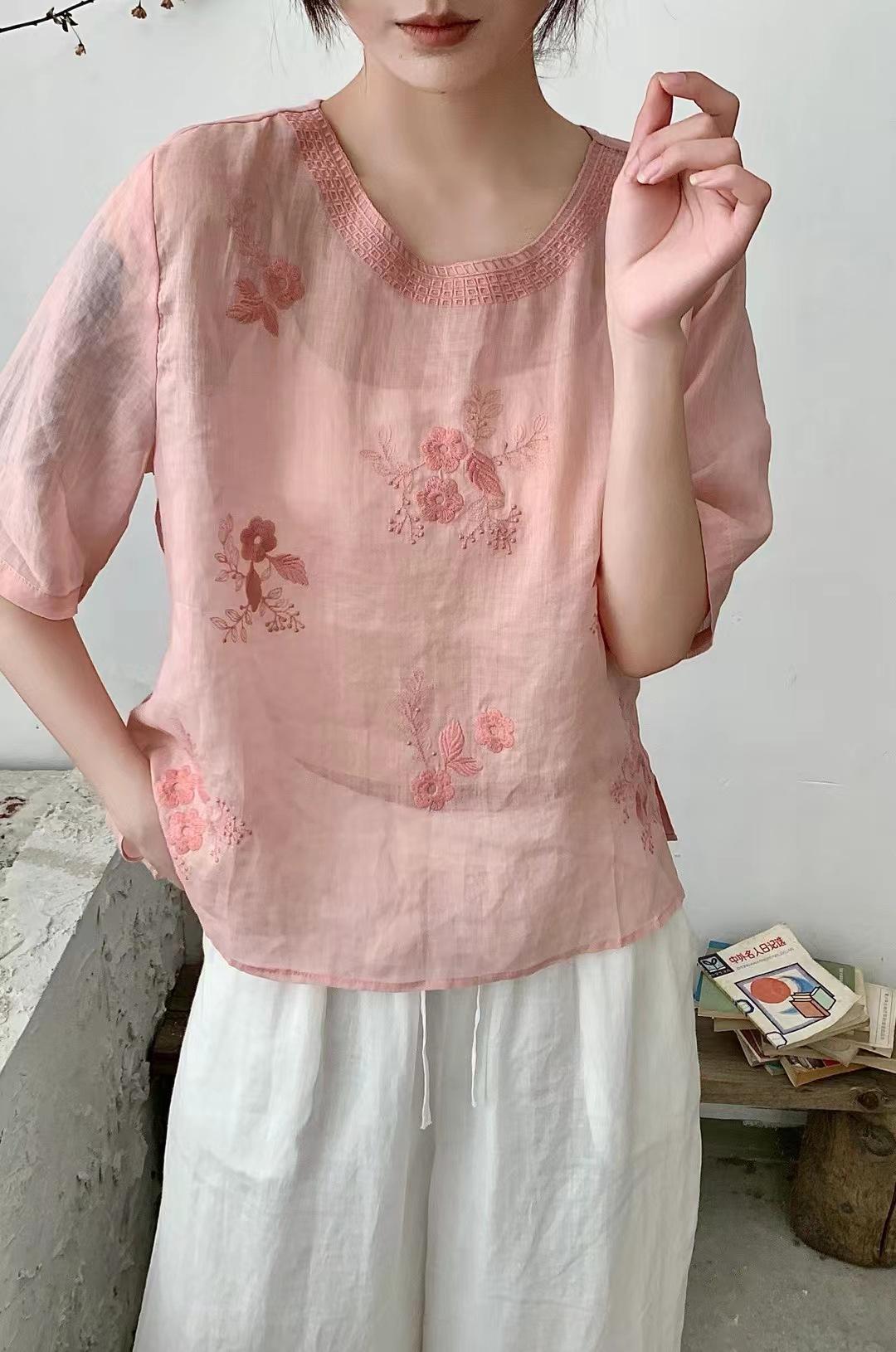 2025 Nuevo Estilo de Verano Estilo Artístico Cuello Redondo Camisa de Ramio Bordada Pesada Elegante Estilo Ejecutivo Manga Corta