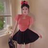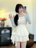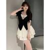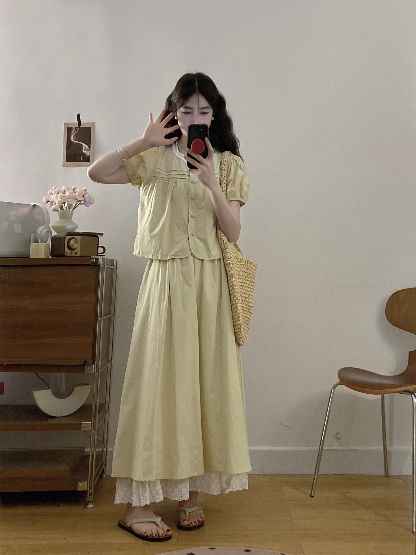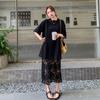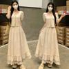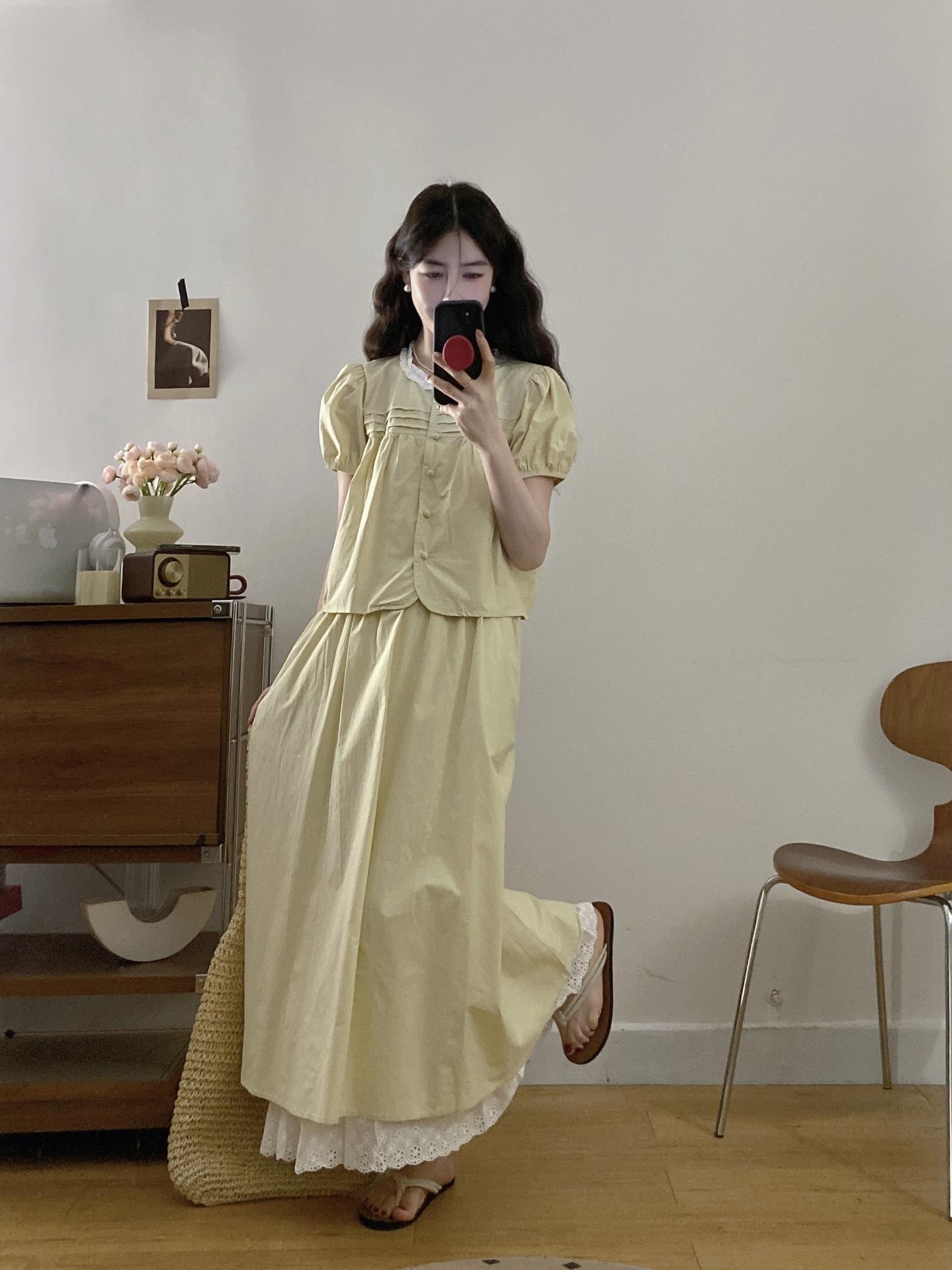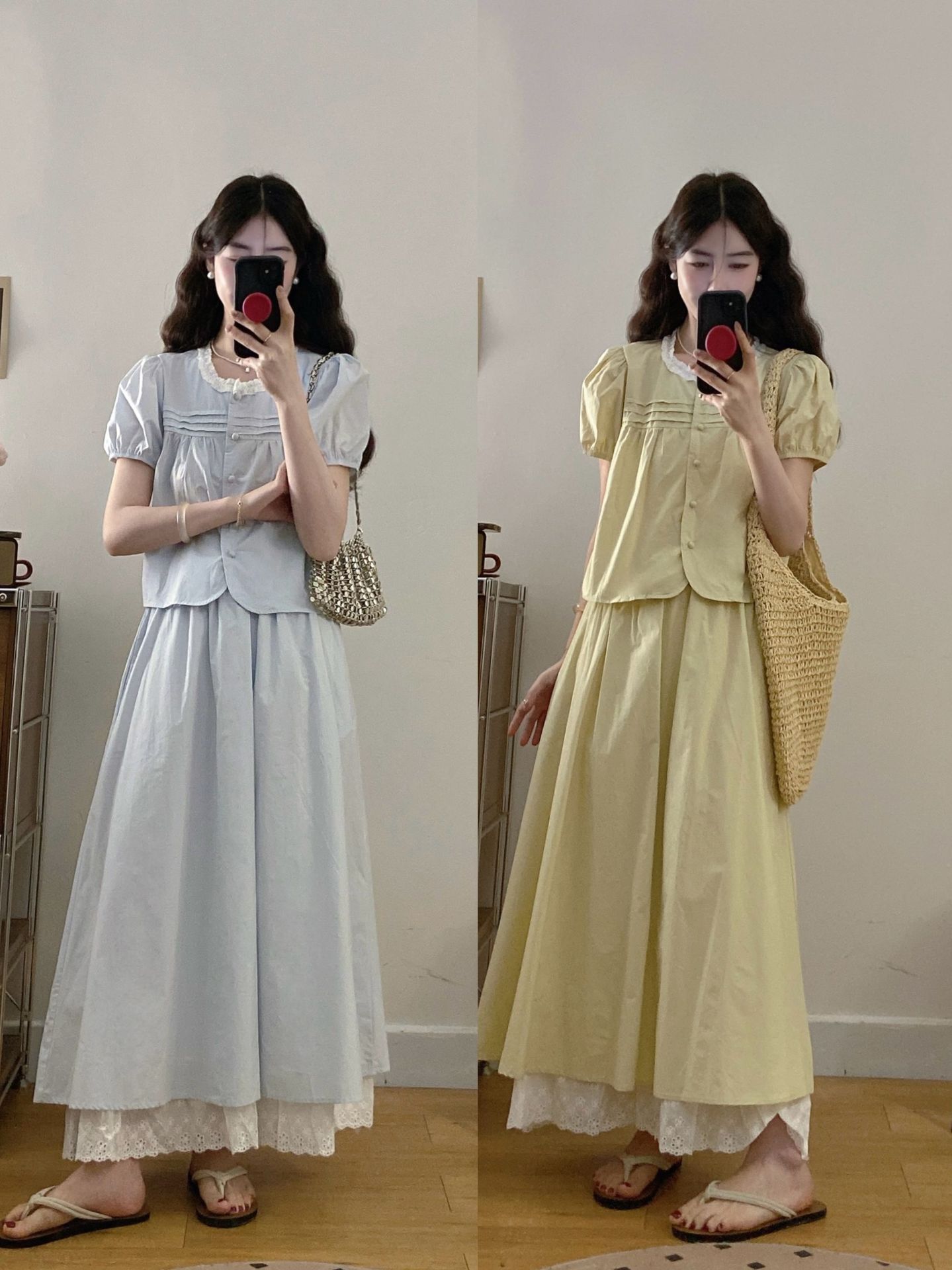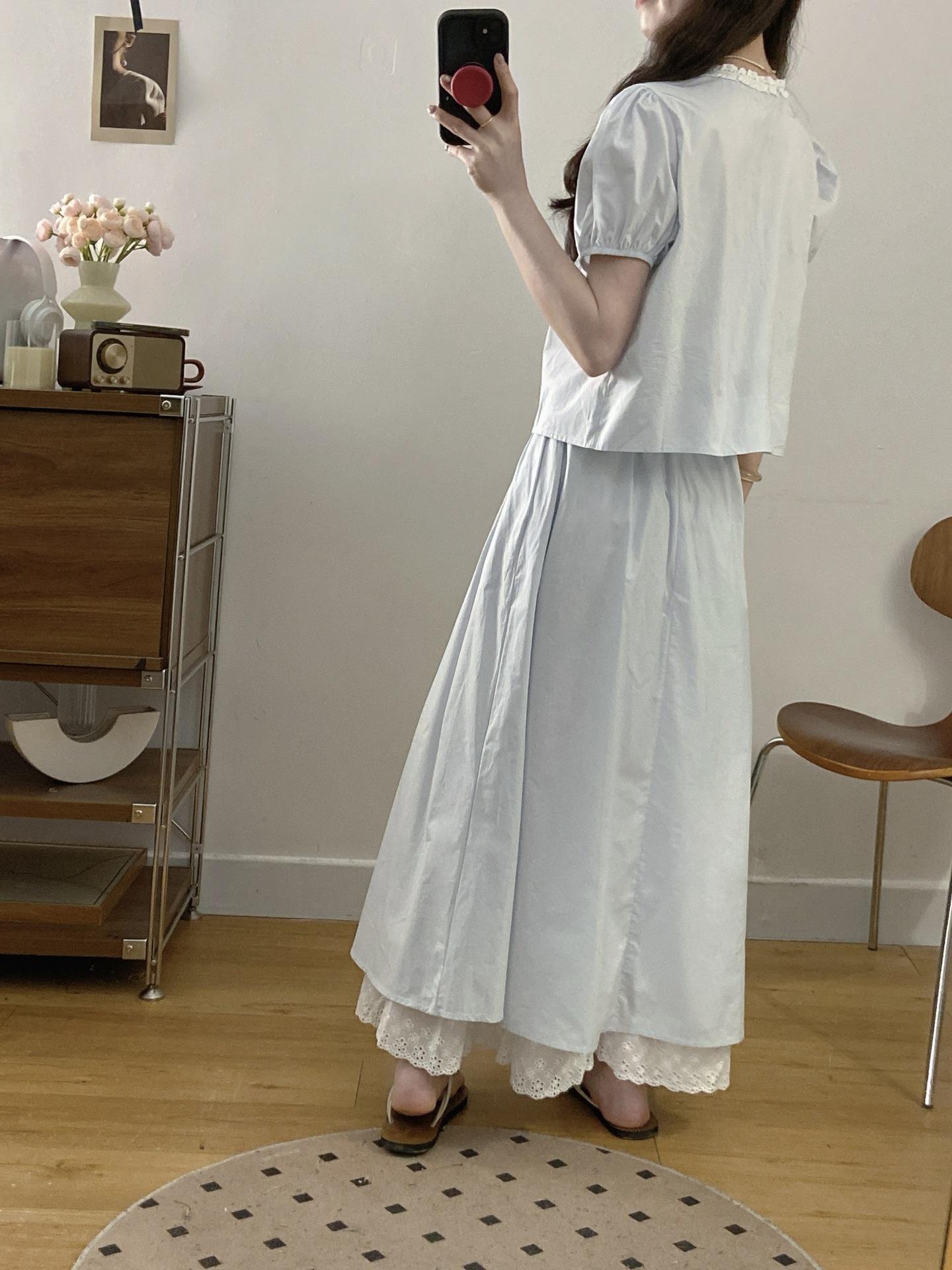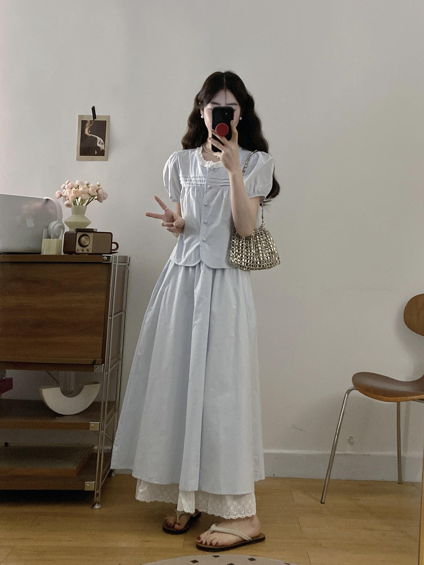 Talla grande Camisa de encaje de estilo dulce y fresco de alta calidad Falda con costuras de cintura alta Conjunto de dos piezas para verano