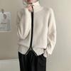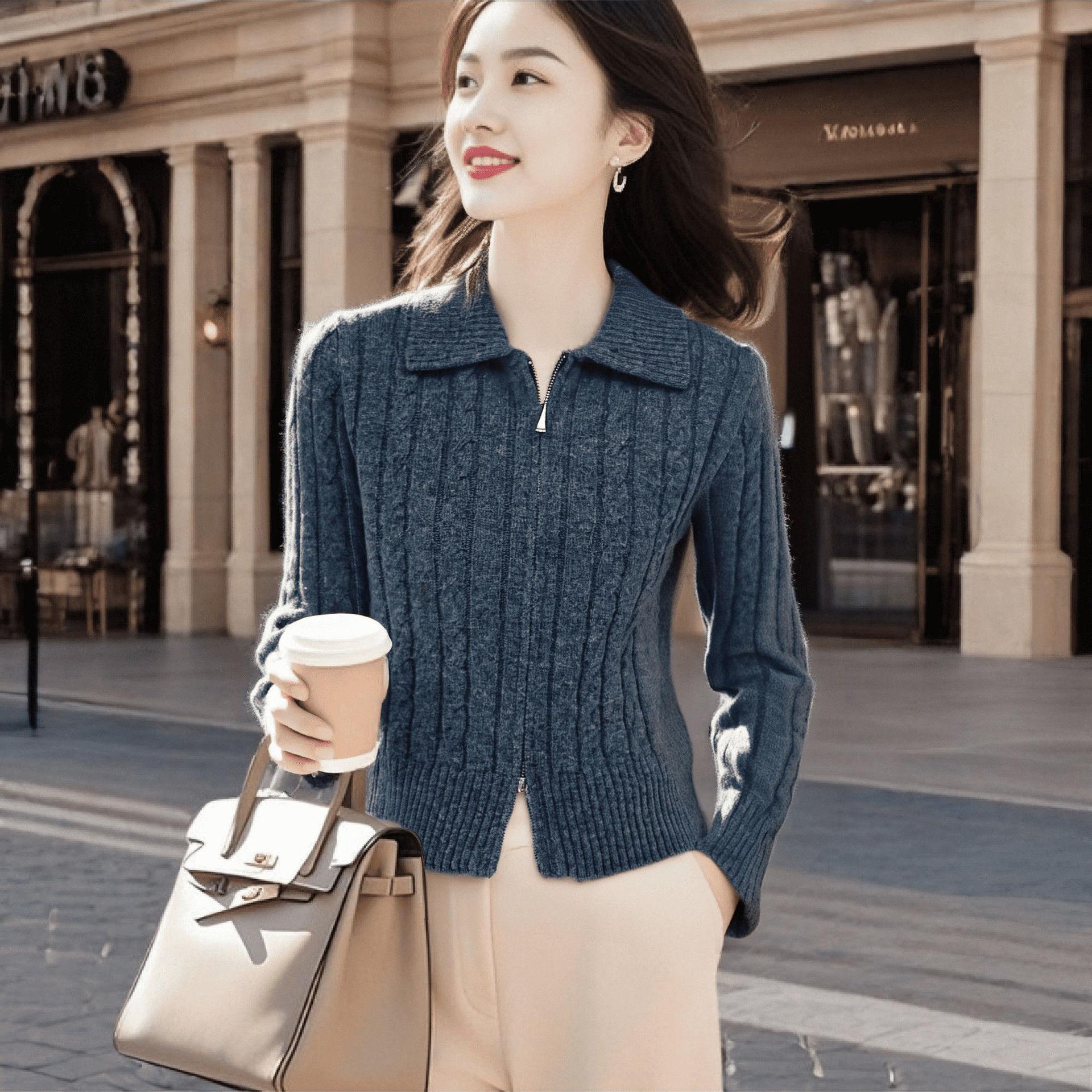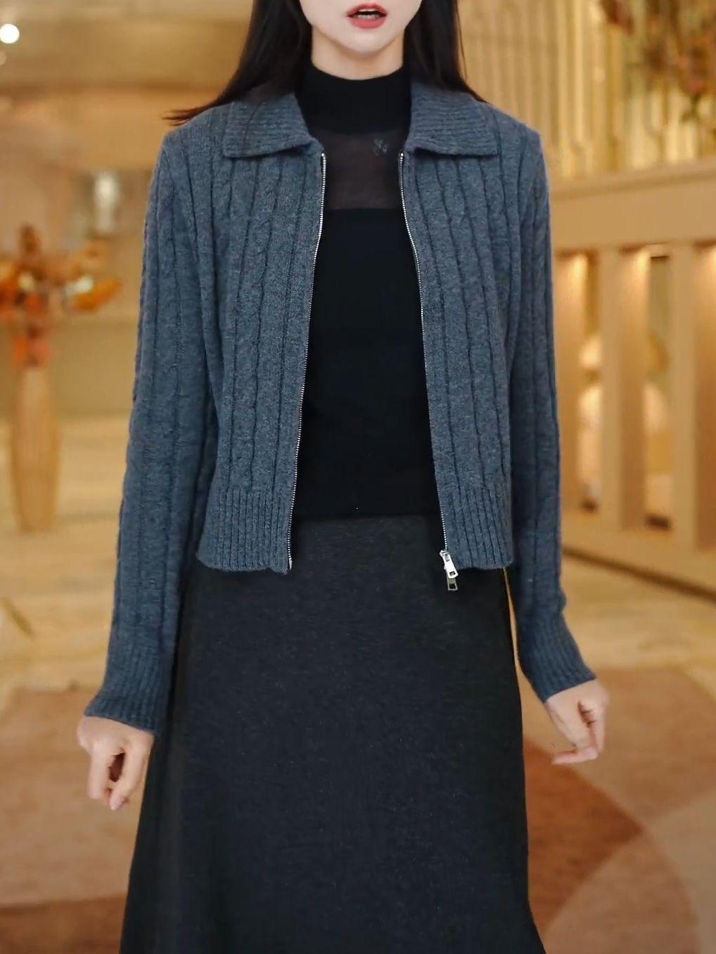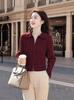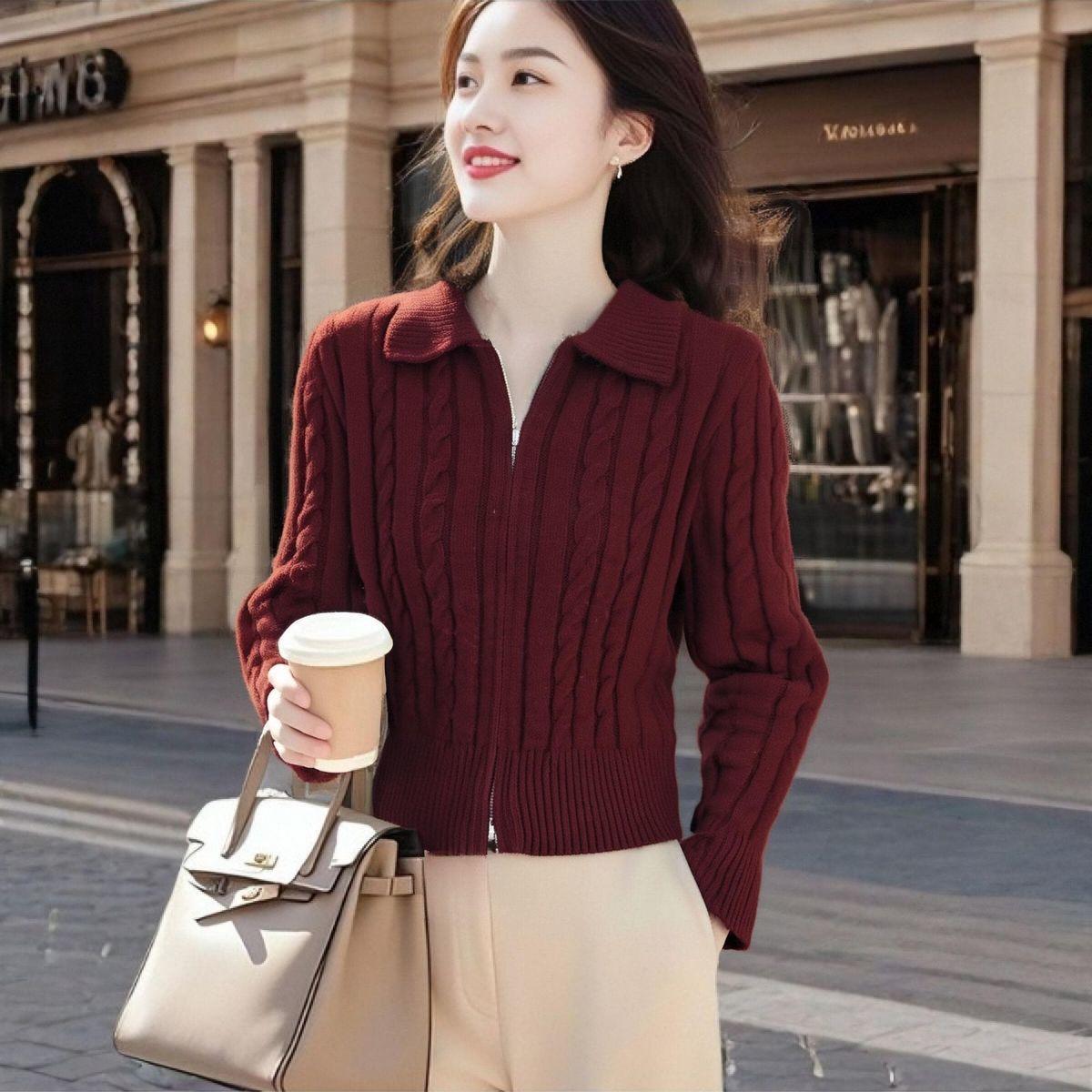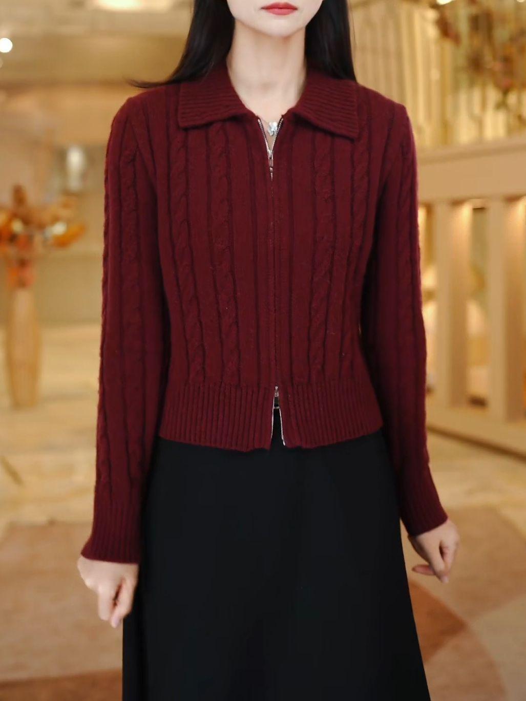 Chaqueta tipo cárdigan de punto retro rojo de alta gama con cremallera, para otoño e invierno, con solapa, estilo relajado, estilo torcido, entallada y muy bonita.